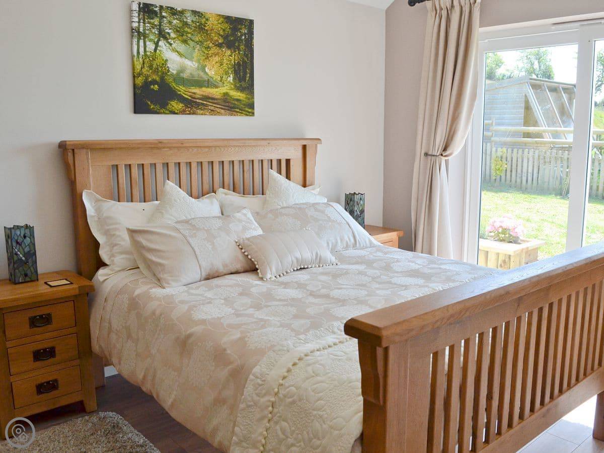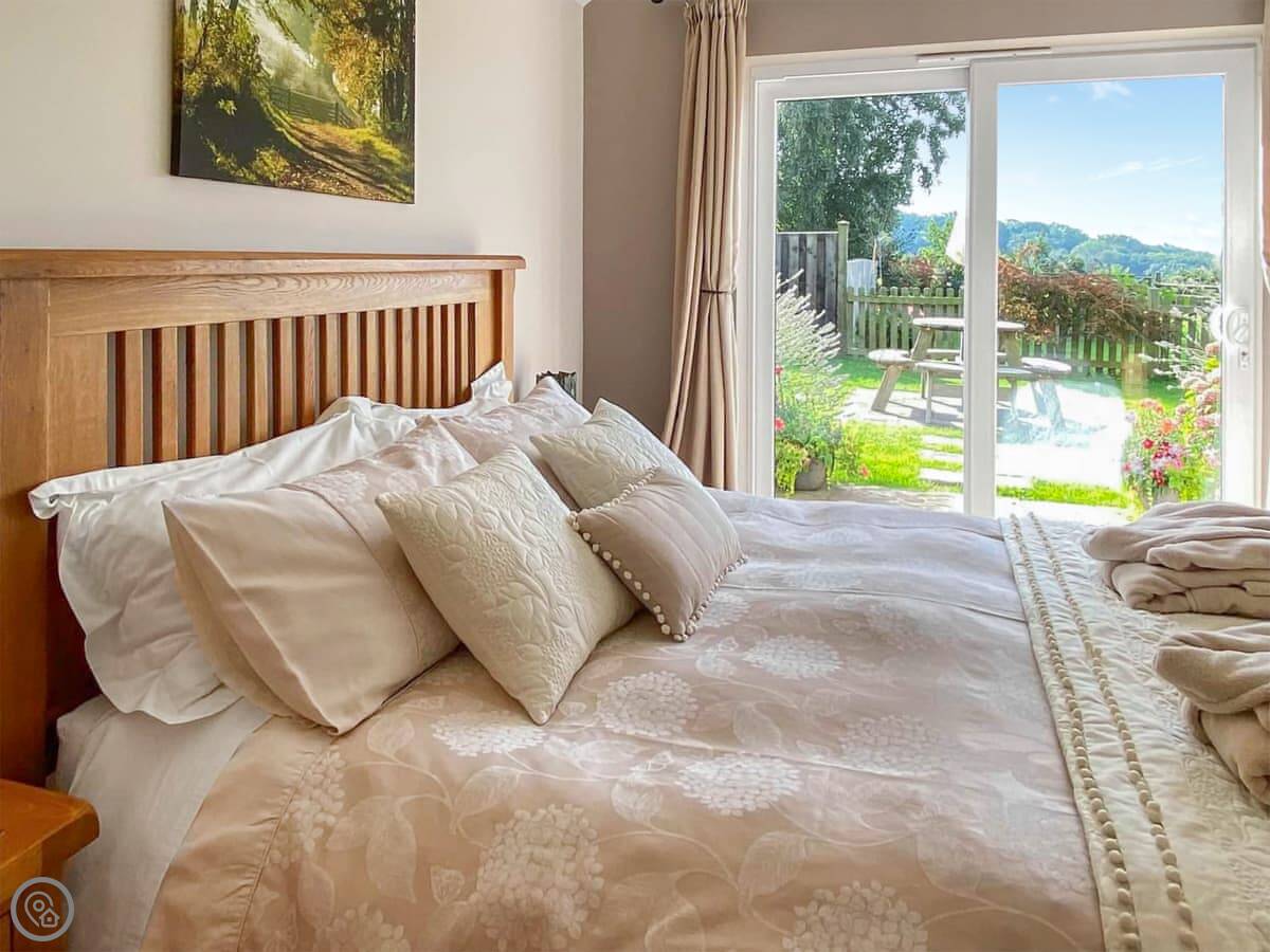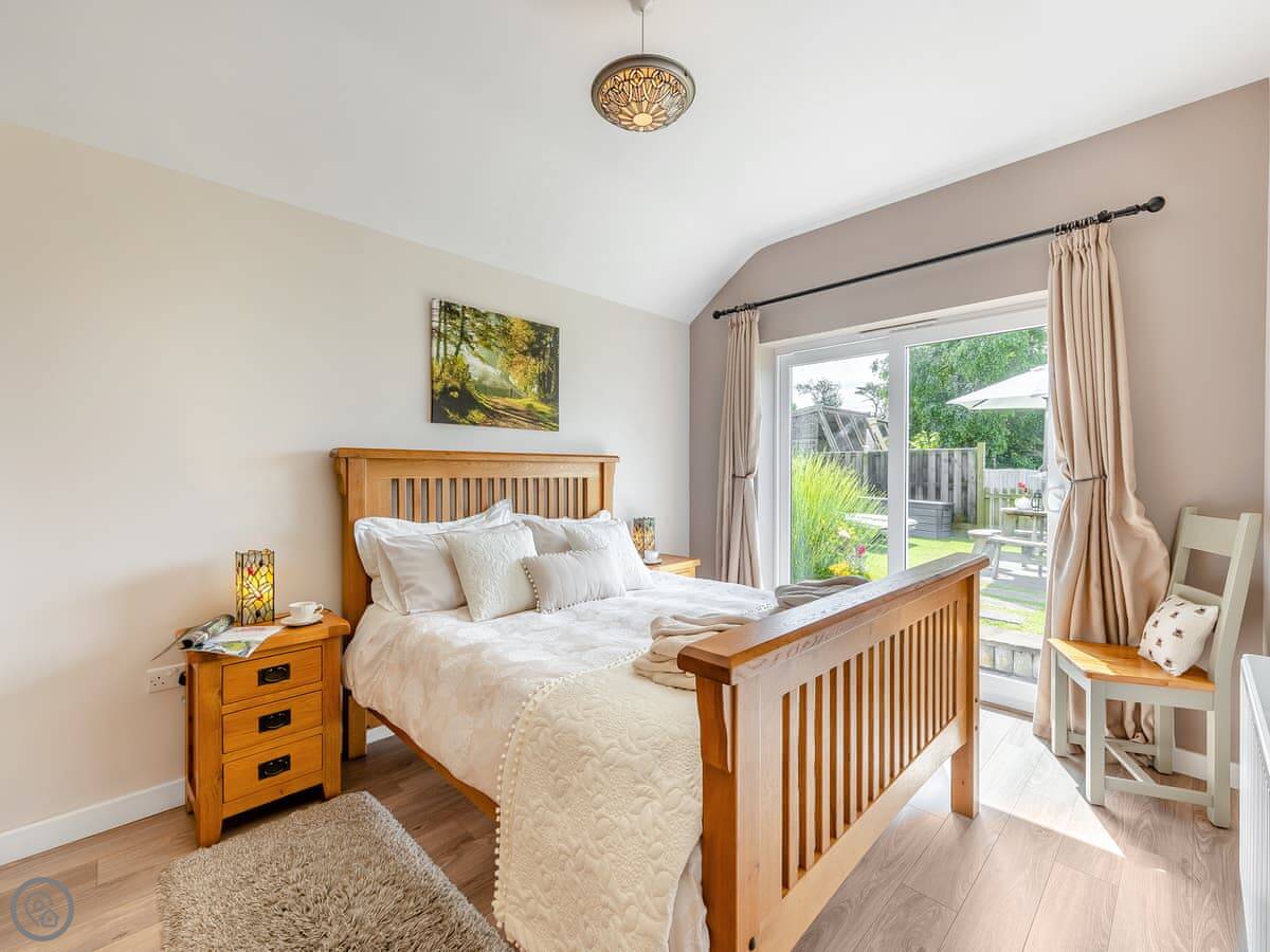 The cottage used to be a stable. It's open plan downstairs with a wood burner. Big patio doors face the garden and the fields. The bedroom has patio doors too, so you can step straight outside.