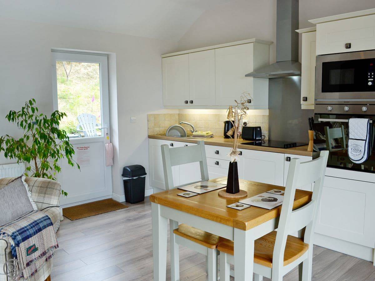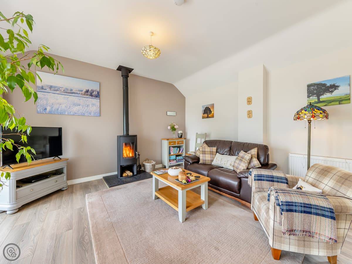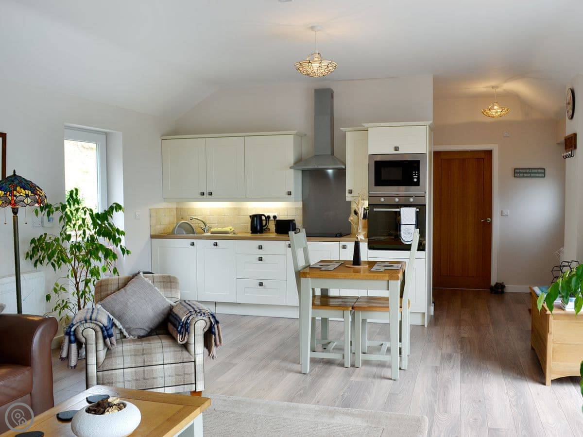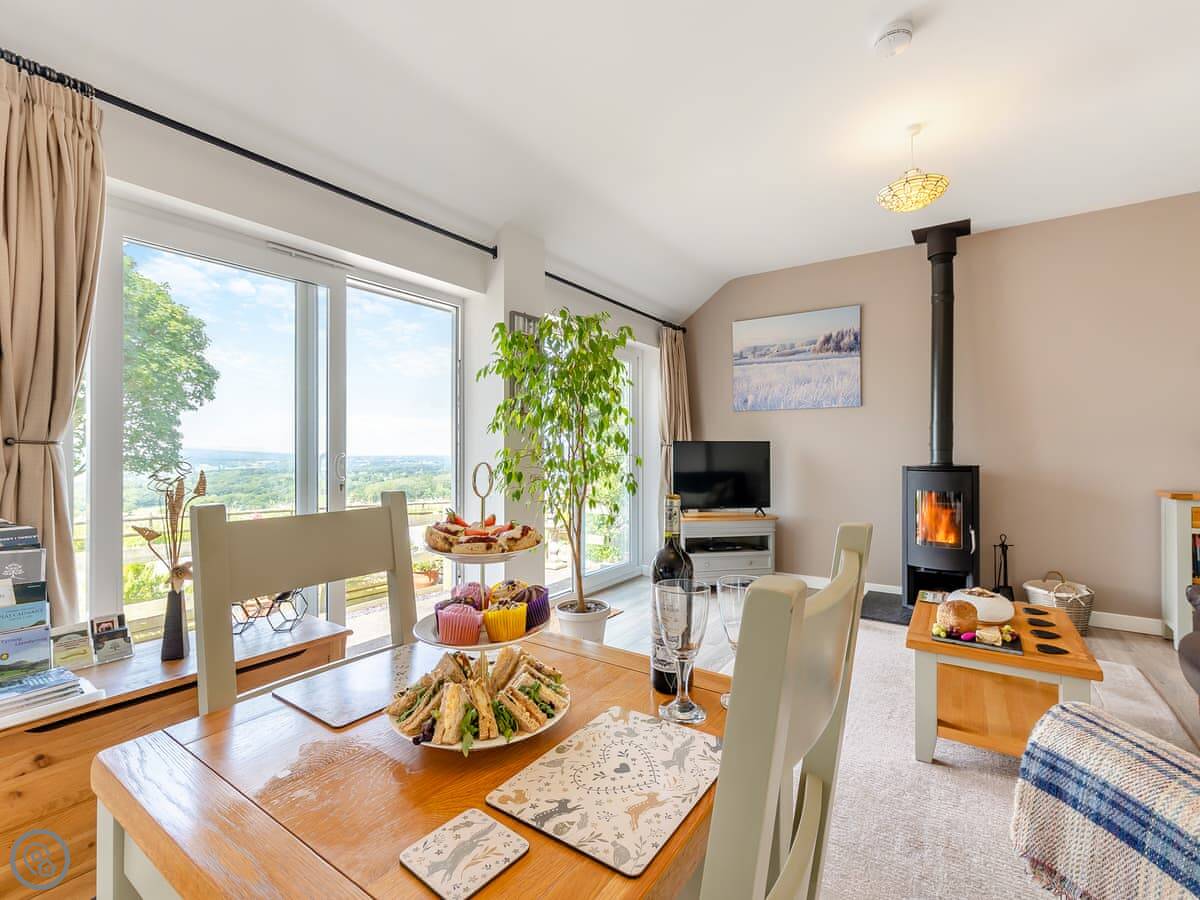 The cottage used to be a stable. It's open plan downstairs with a wood burner. Big patio doors face the garden and the fields. The bedroom has patio doors too, so you can step straight outside.
