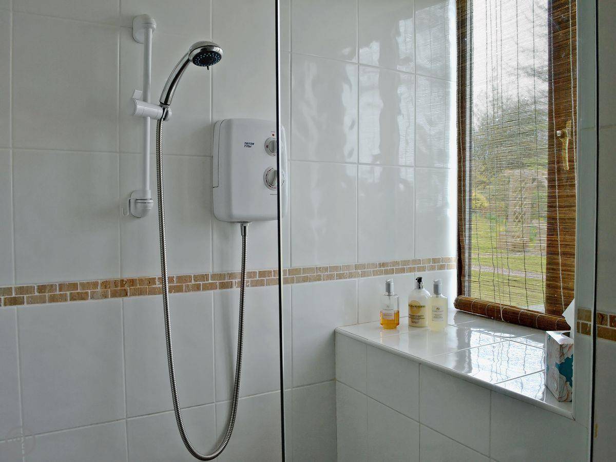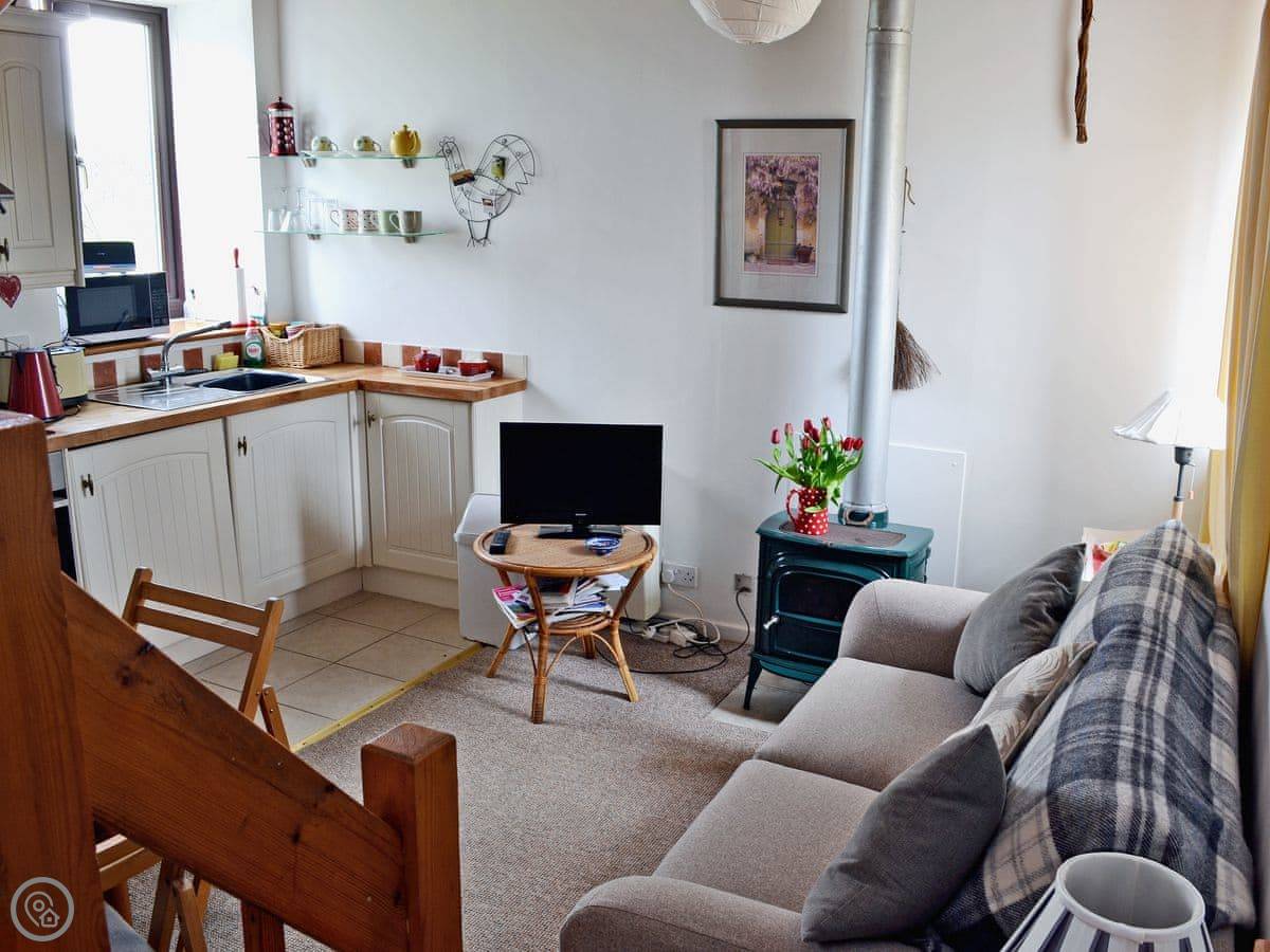 It's for two people. One big super king bed upstairs in a galleried space with beams and Velux windows. The stairs are fairly steep, like most cottages. There's one bathroom with a walk-in shower. The living space is open plan downstairs, with a gas wood burner for heat. It's got a 3 Star rating. It's clean and comfortable, not high-end.