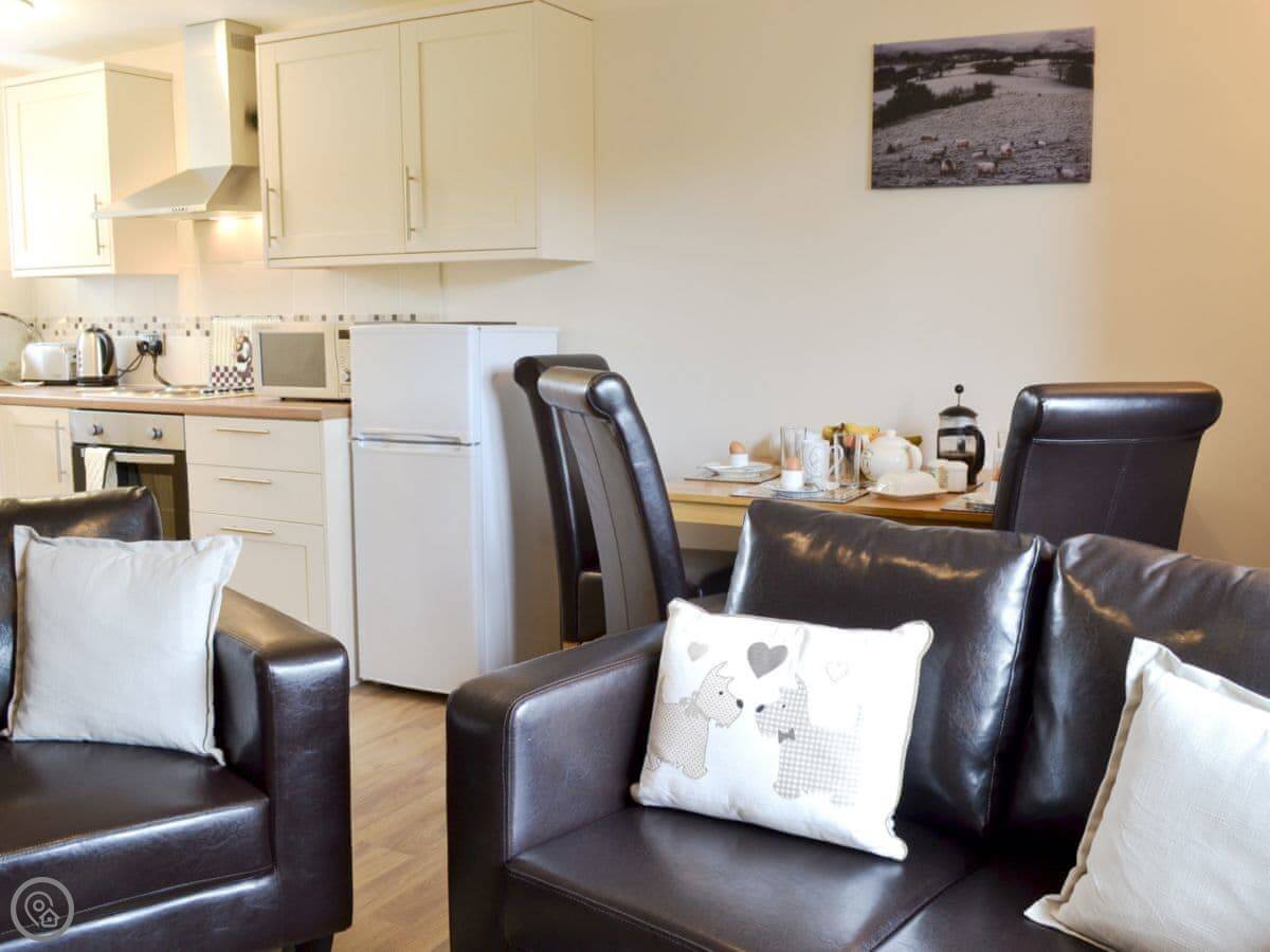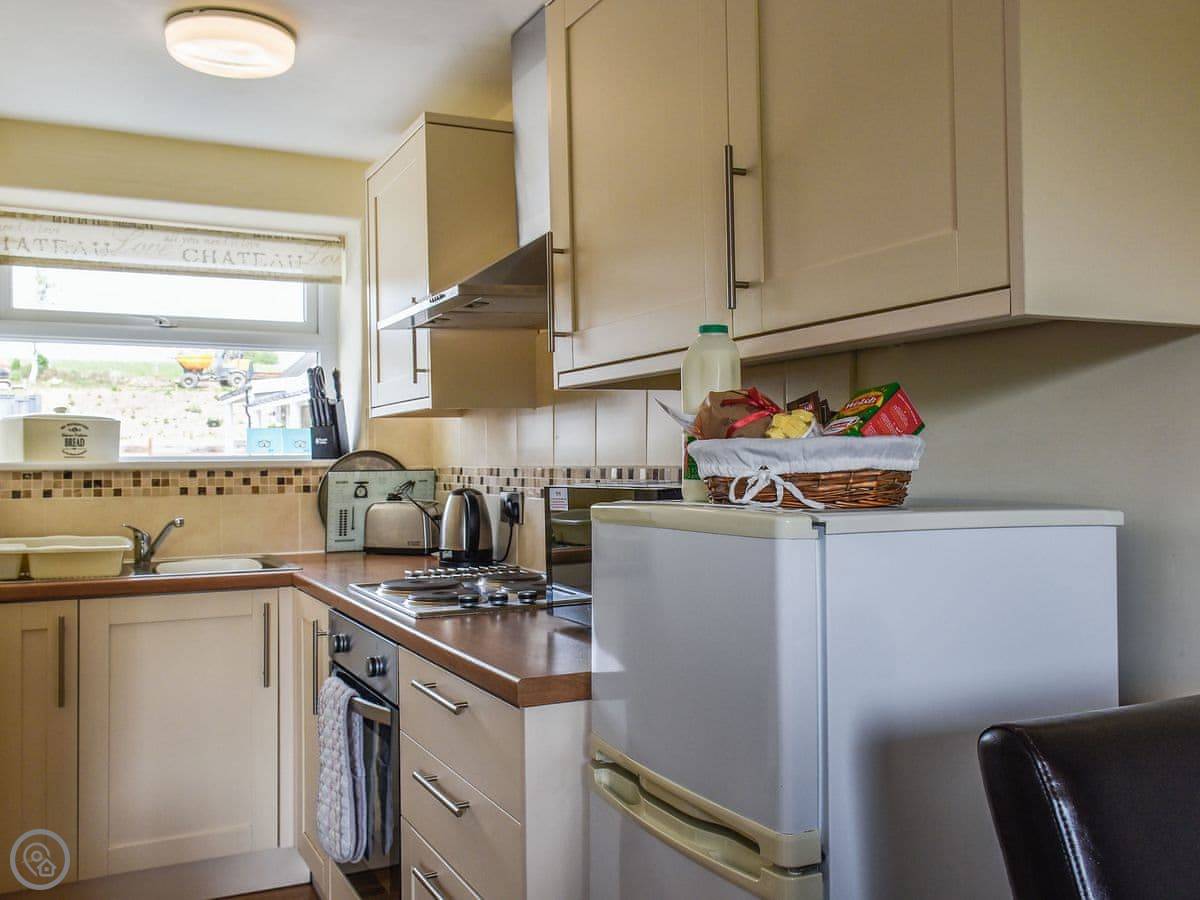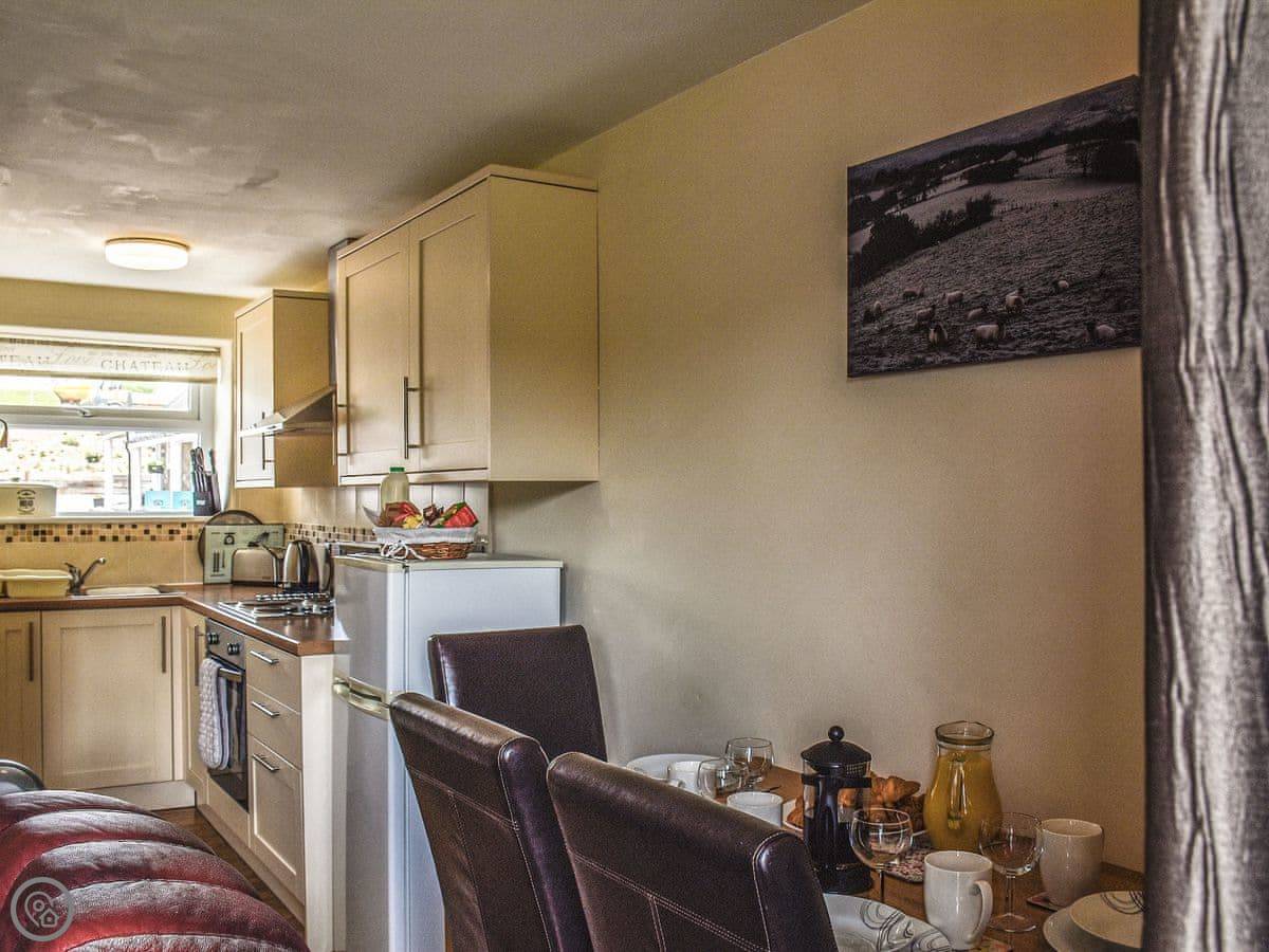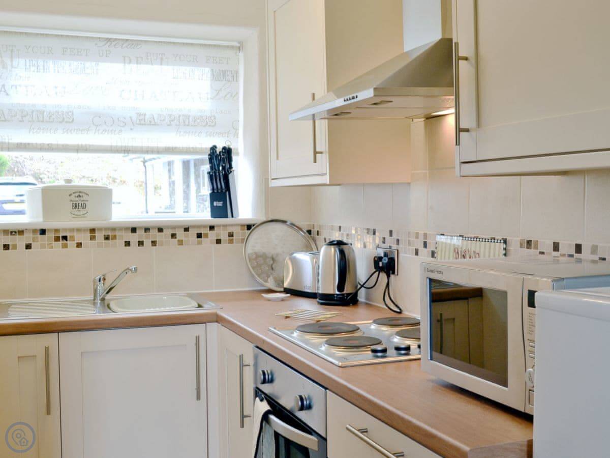 Inside, it's got what you'd need: a washing machine, TV, WiFi. The bedding and towels are included. There's a cot and highchair if you need them. Parking is right outside the cottage.
