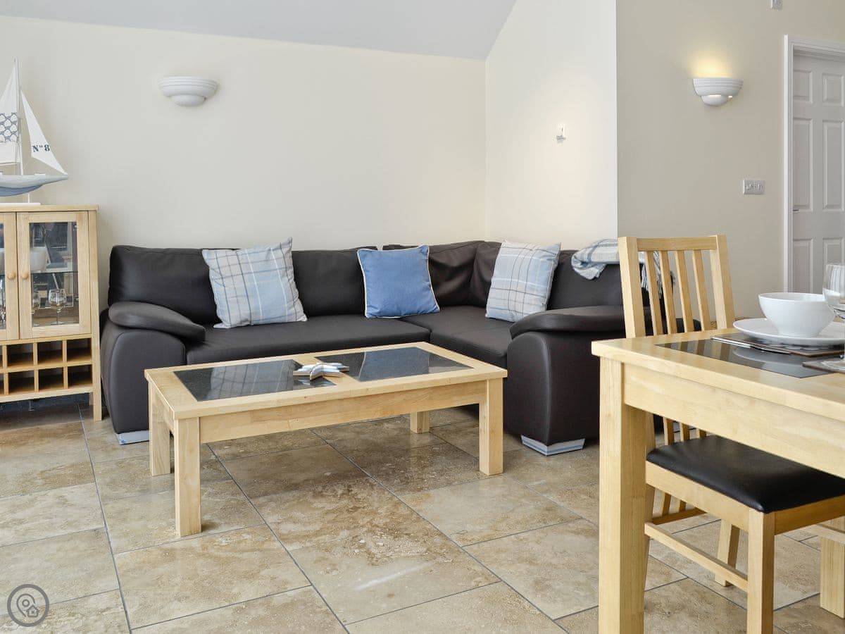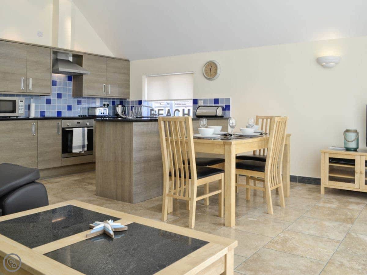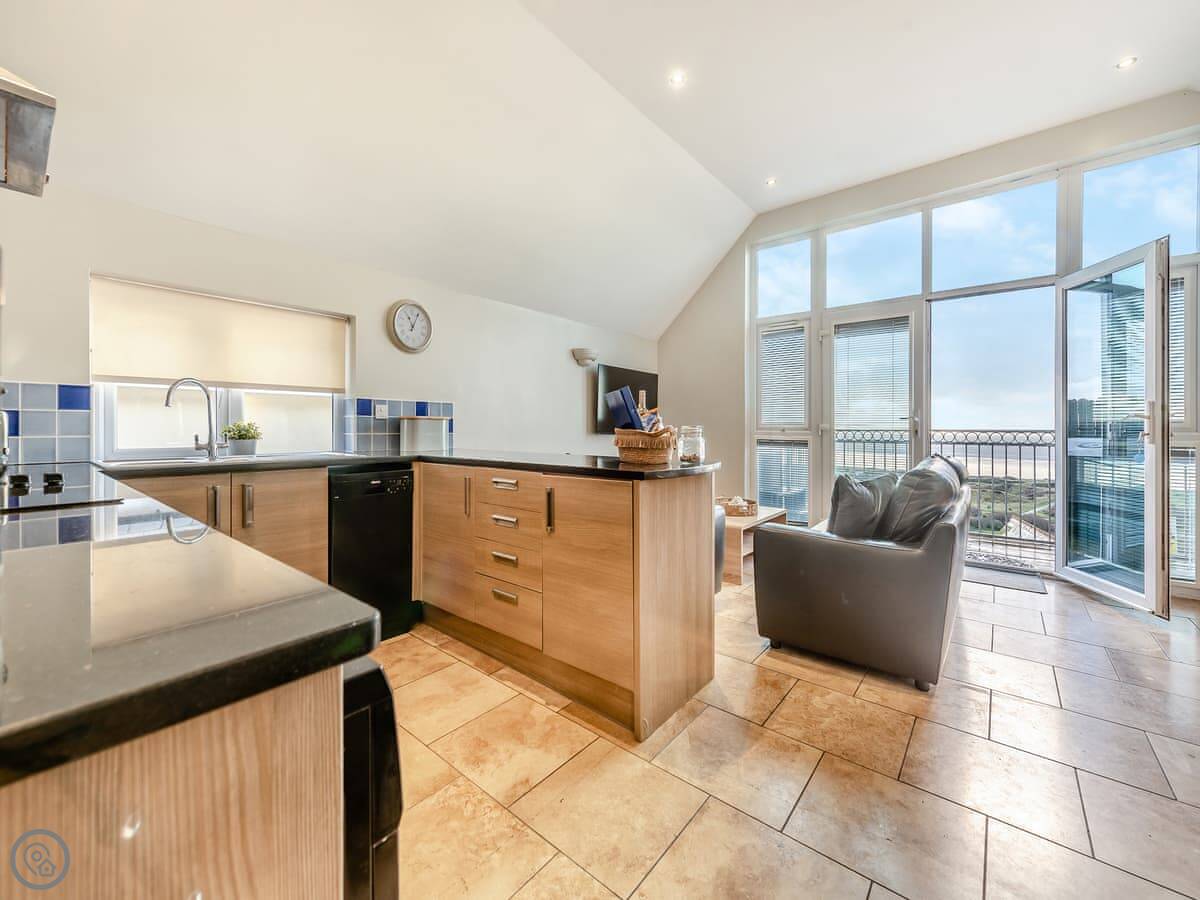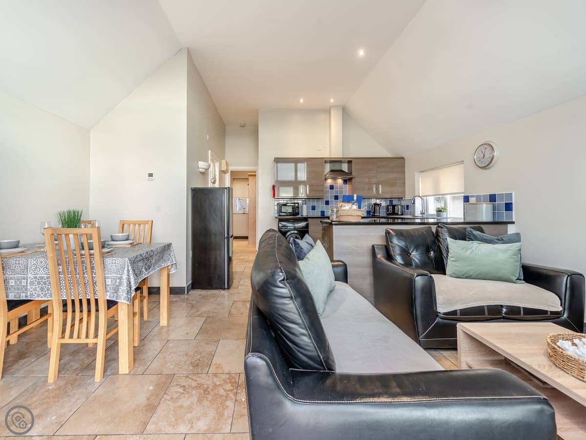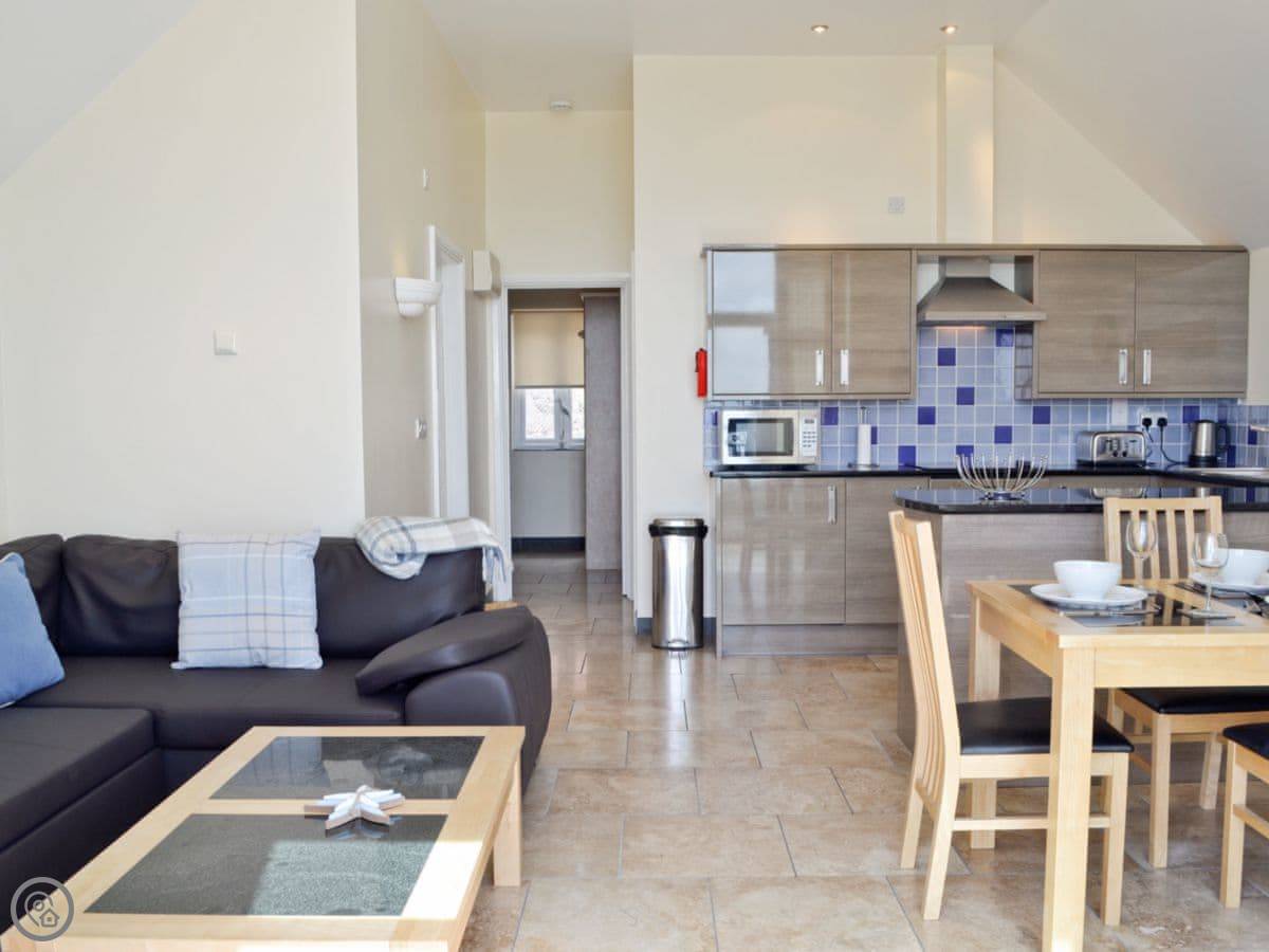 The main room is open plan, with the kitchen, dining area and sitting area all together. There's underfloor heating, which works well. The patio doors open onto a large terrace.