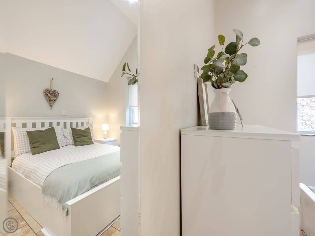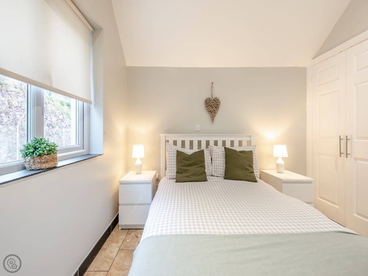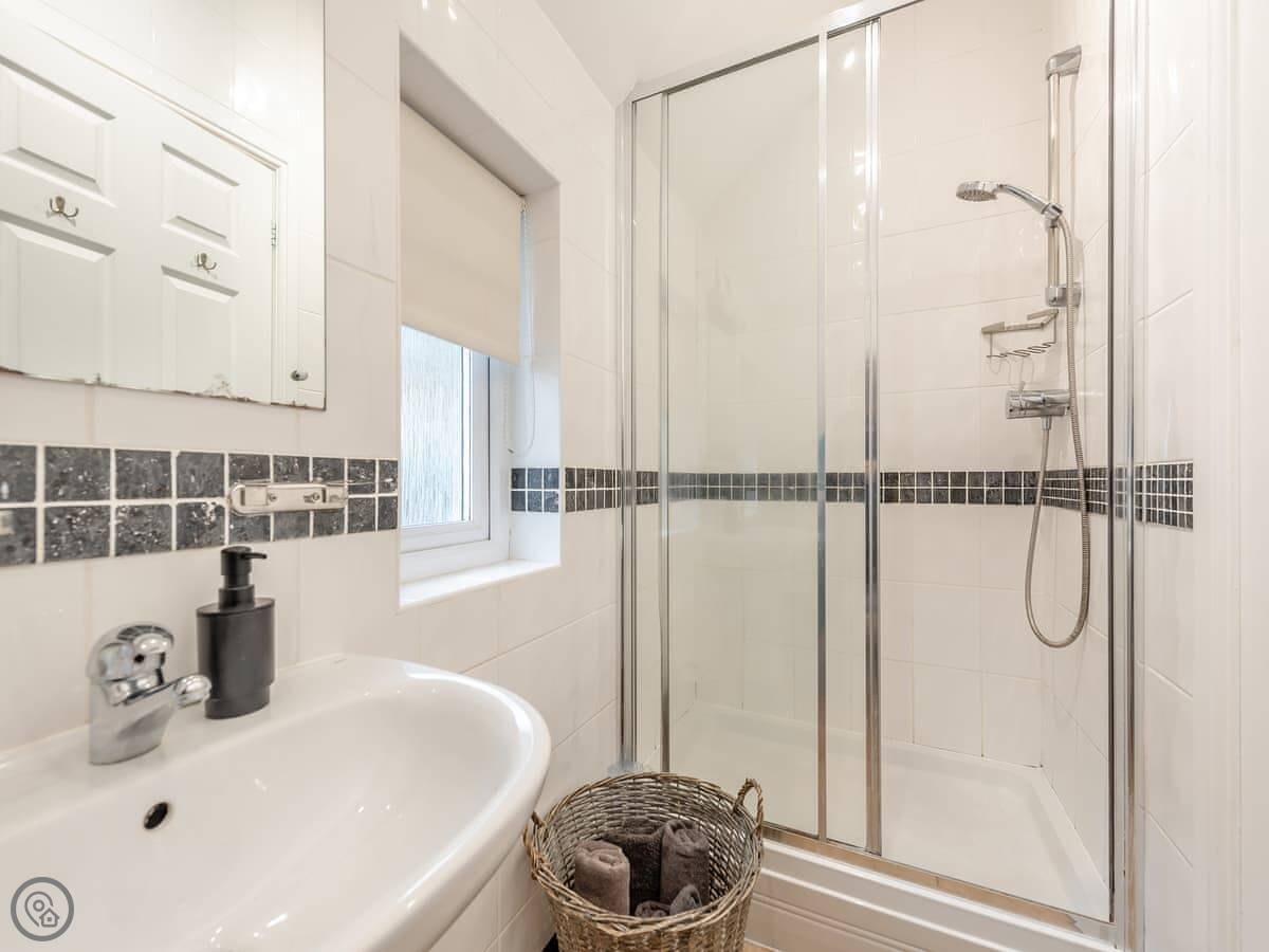 It's for four people. Two bedrooms, one bathroom with a walk-in shower. It has a 4 Star rating, which means it's comfortable and well-kept. Everything is on one floor inside, so no stairs.