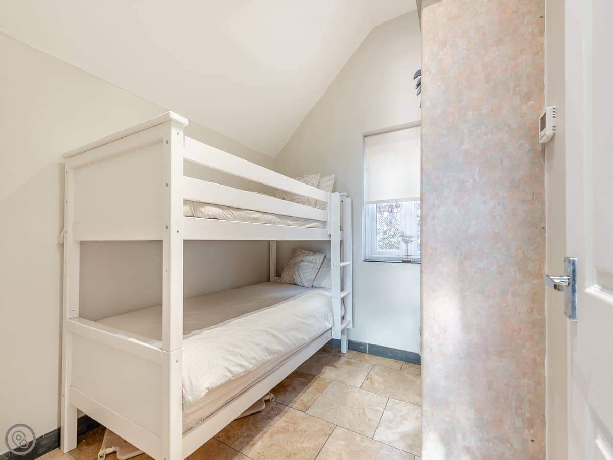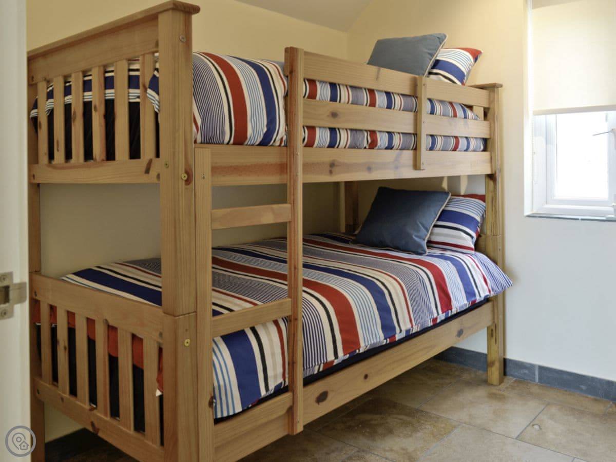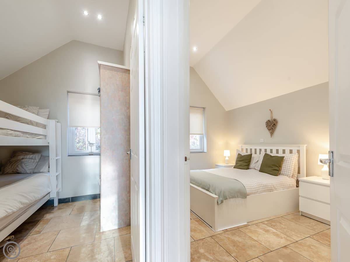 It's for four people. Two bedrooms, one bathroom with a walk-in shower. It has a 4 Star rating, which means it's comfortable and well-kept. Everything is on one floor inside, so no stairs.