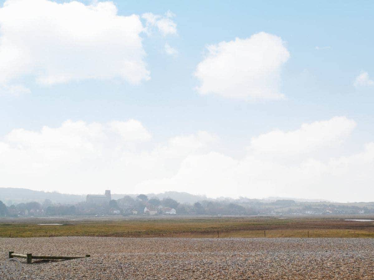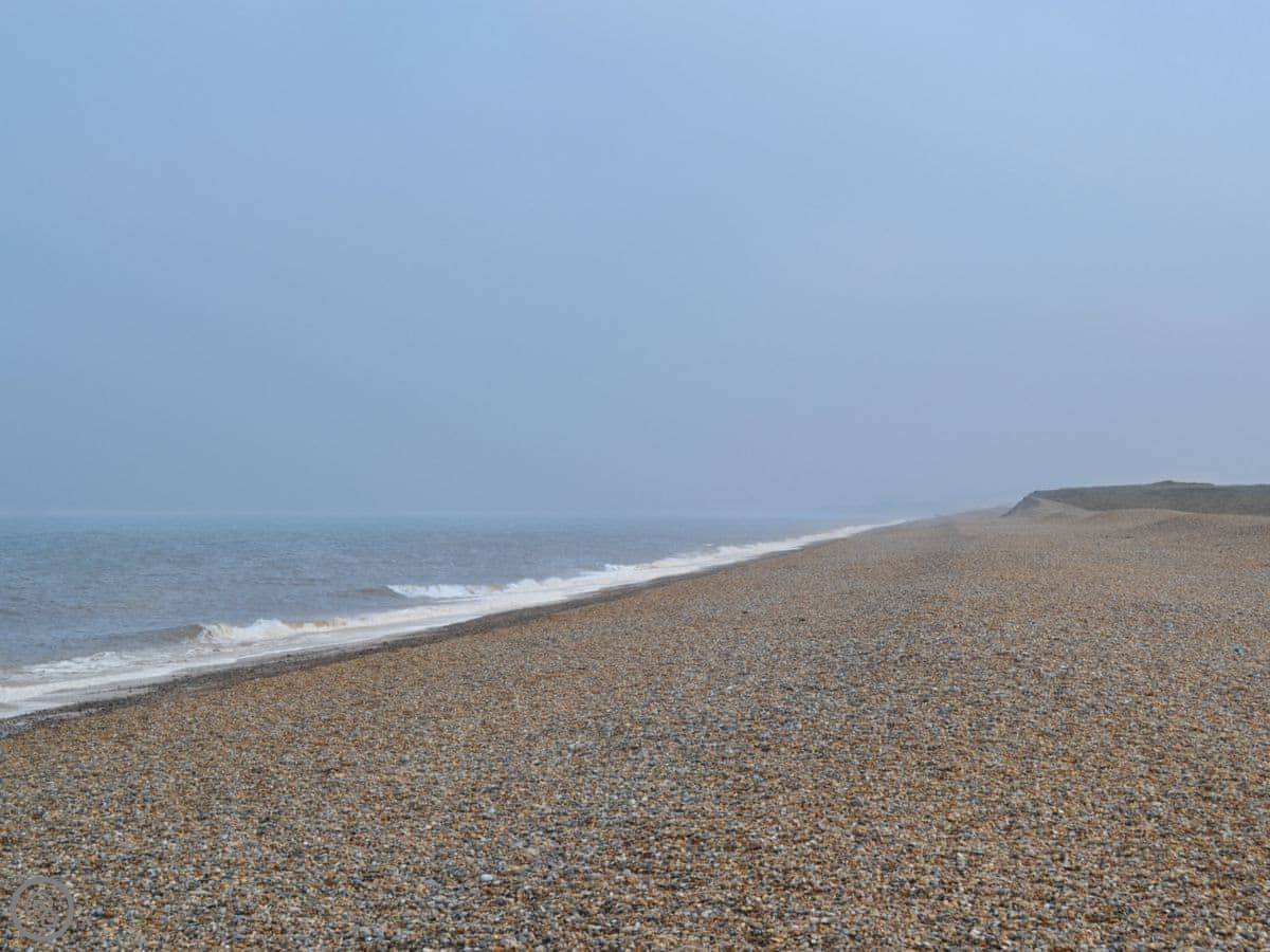 The beach is about a ten minute walk. You go down the track, past the marshes. It's shingle. The village shop and a good pub are about the same distance. The pub does proper food and has views over the marshes.