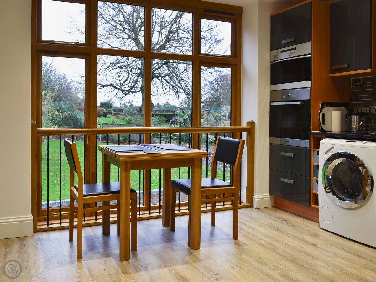 It's quiet here. You get a view over the fields from the big windows. There's a patio with outside space and parking right there.