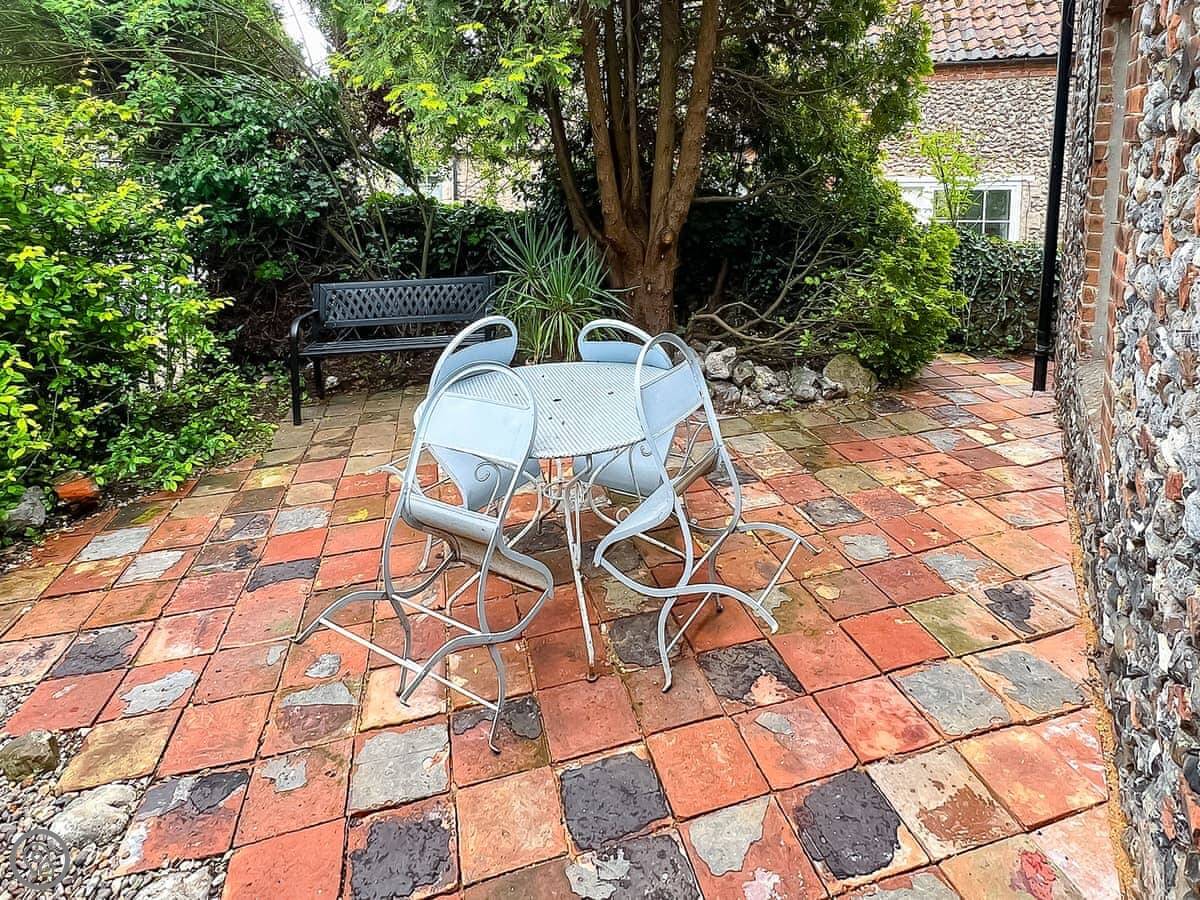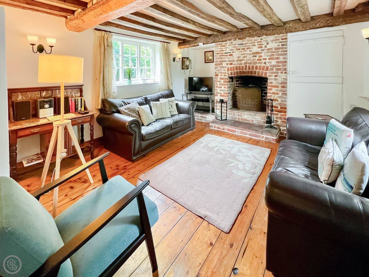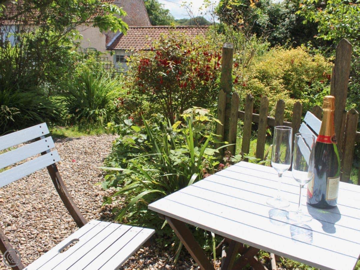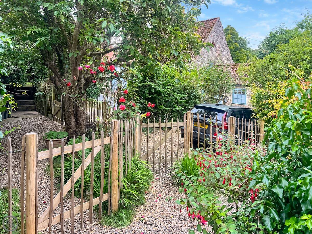 Blacksmiths Cottages are in Stiffkey, one of two cottages side by side. They share a big garden, about half an acre. It's south-facing, gets the sun, and looks out over fields. There are fruit trees.