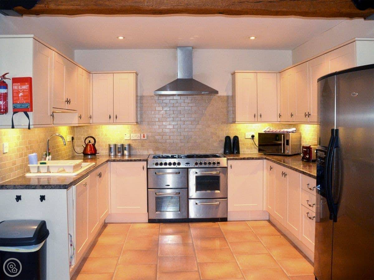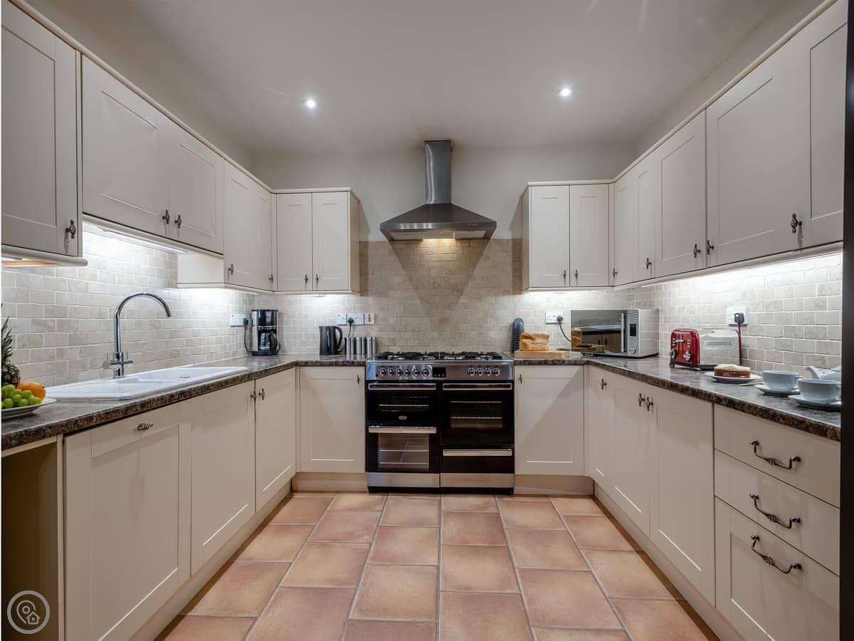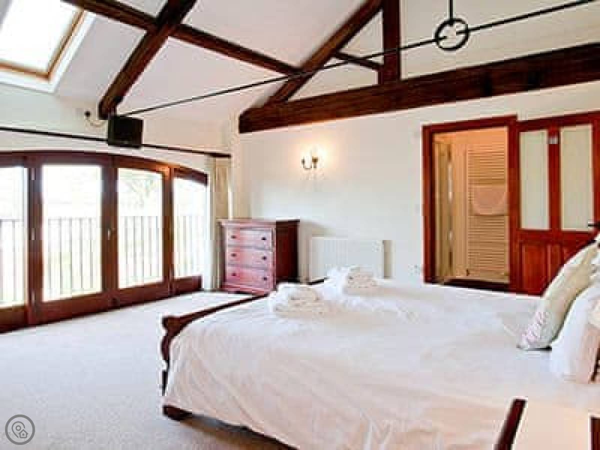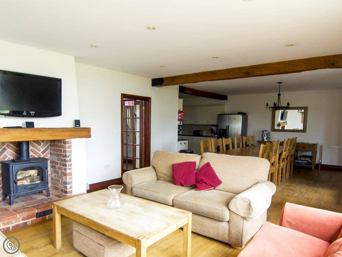 It's a big place, sleeps ten. Five bedrooms, each with its own bathroom, which is useful for a group. There's a large open plan living area with a wood burner. The kitchen has everything you'd need. The garden is walled, so it's enclosed and private.