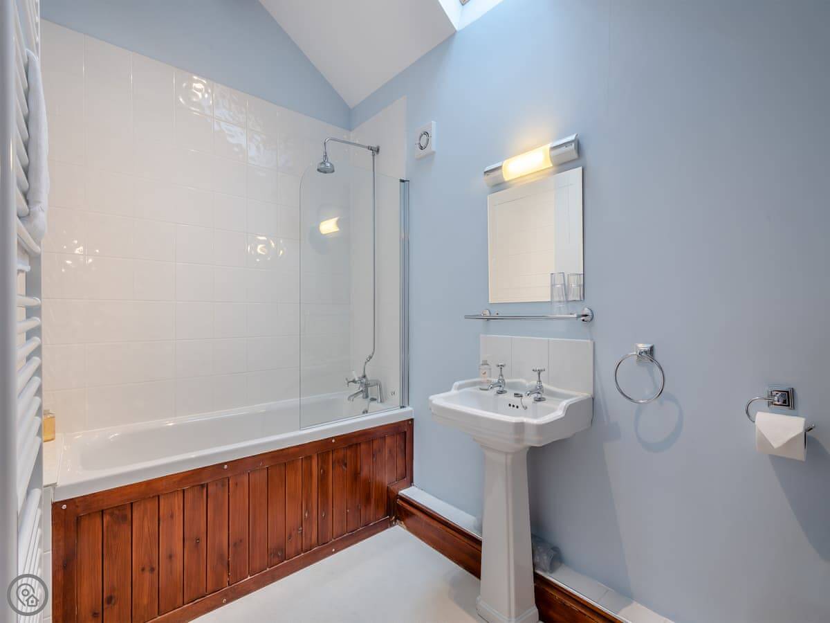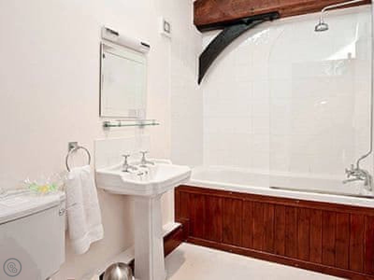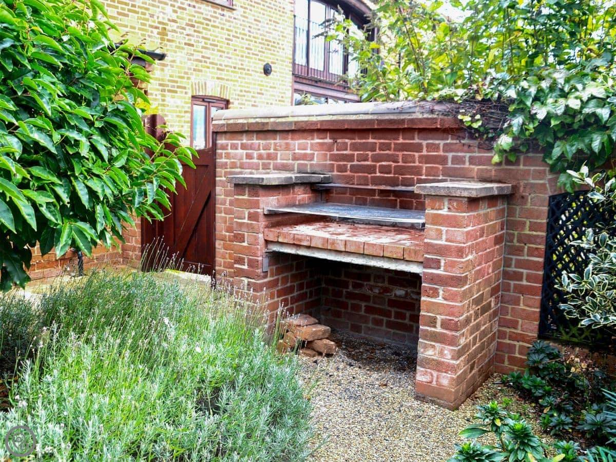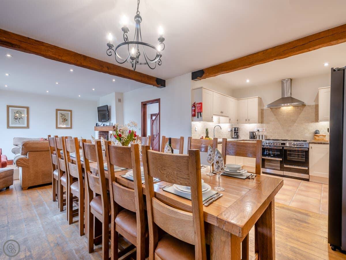 It's a big place, sleeps ten. Five bedrooms, each with its own bathroom, which is useful for a group. There's a large open plan living area with a wood burner. The kitchen has everything you'd need. The garden is walled, so it's enclosed and private.
