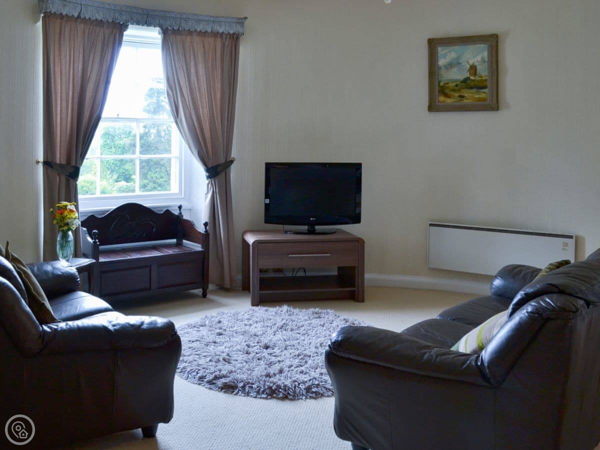 Facilities wise: there's parking, WiFi, a TV, and a washing machine. Bedding is included but you need to bring your own towels. There's a cot and a highchair if you need them. No pets. The front door to the manor is up three stone steps, and then you go up to the first floor for the apartment.