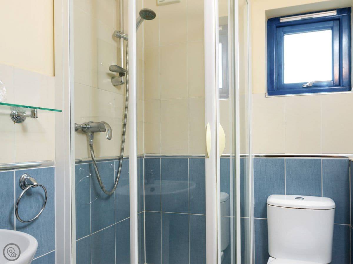 It sleeps four in two bedrooms. Each bedroom has its own bathroom, which is useful. It's got a 4 Star rating, so it's comfortable and well-equipped. The layout is upside down: the living area is upstairs to make the most of the view. There's a glass balcony up there to sit on.