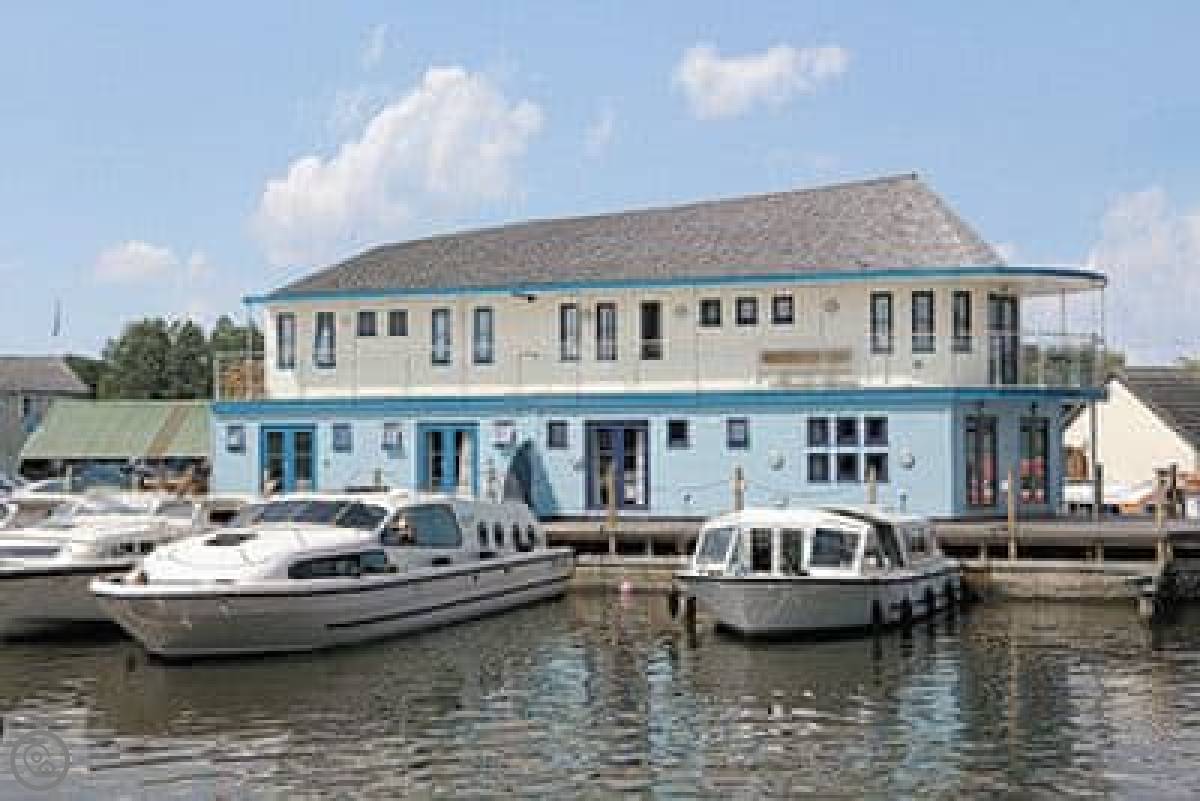 Riversedge is a houseboat, sort of. It's actually an apartment built into a working boatyard on the River Bure in Hoveton, right by Wroxham. So you'll hear boatyard sounds and see the river traffic, which is part of the point.