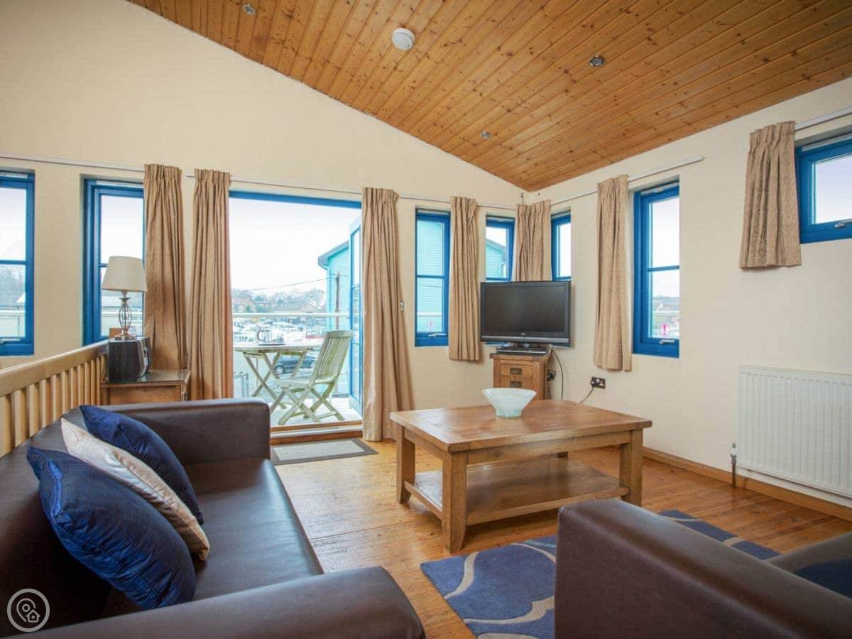 Riverview is one of the apartments in the Boathouse, down in Hoveton. It's on the river Bure, right in a working boatyard. You get a good view of the water and the boats coming and going.