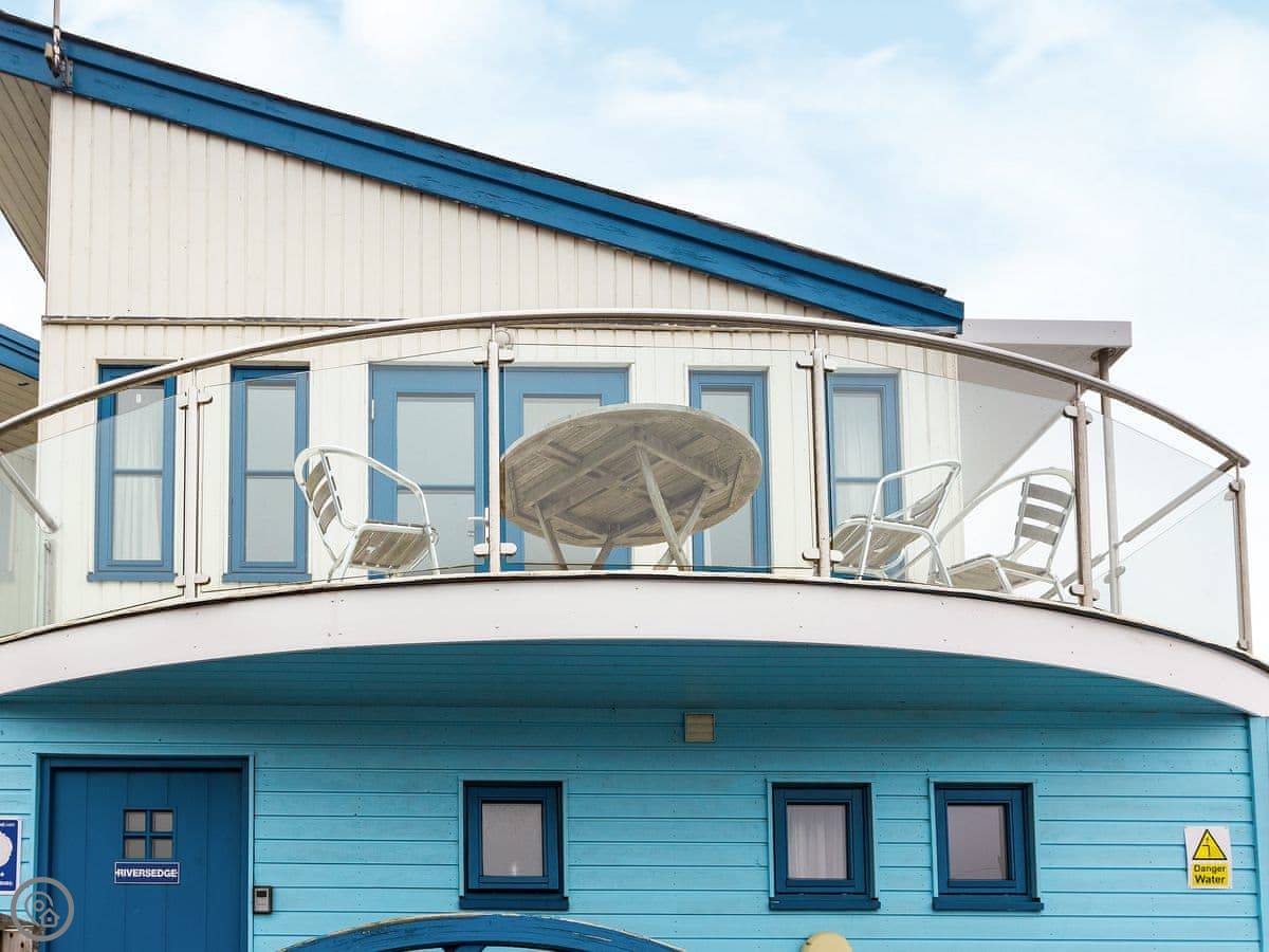 The layout is upside down. You go upstairs to the living area and kitchen. Patio doors open onto a glass balcony over the river. It's a good spot to sit with a drink. The decked area downstairs is compact, but it's yours to use.