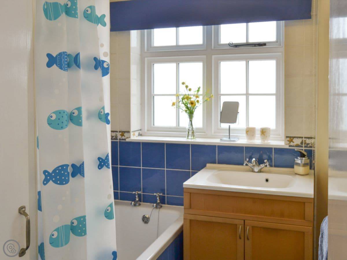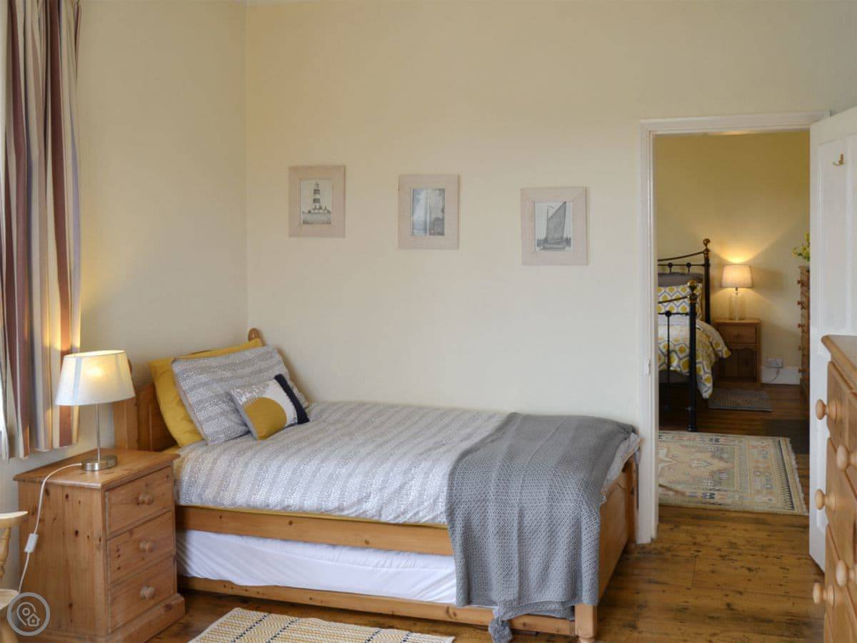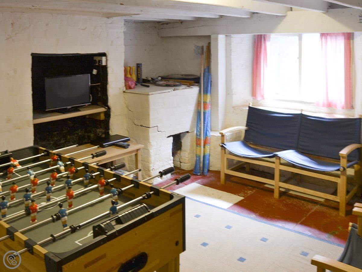 It sleeps five. There are two bedrooms upstairs and one bathroom. It has a 4 Star rating, which means it's comfortable and well-kept. The stairs are the original ones, so they're quite steep and narrow. The cellar has been done up as a games room, which is mainly for kids but fine for adults too if you don't mind the low ceiling.