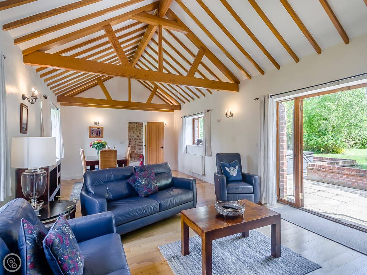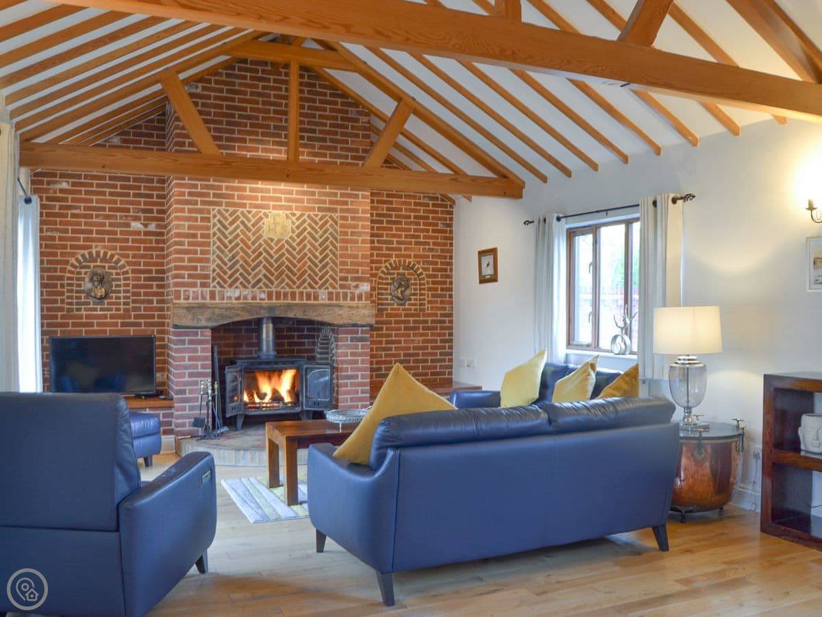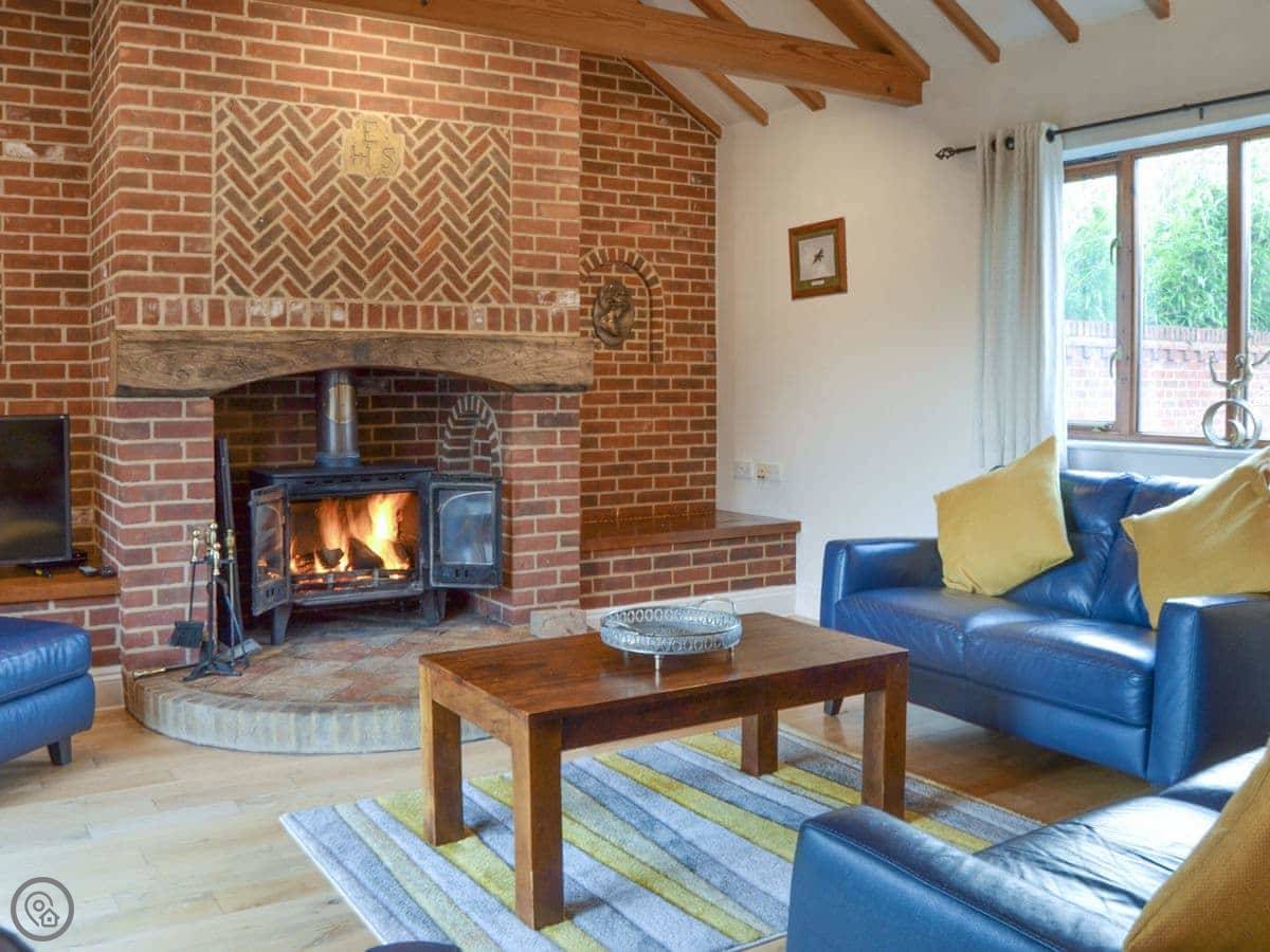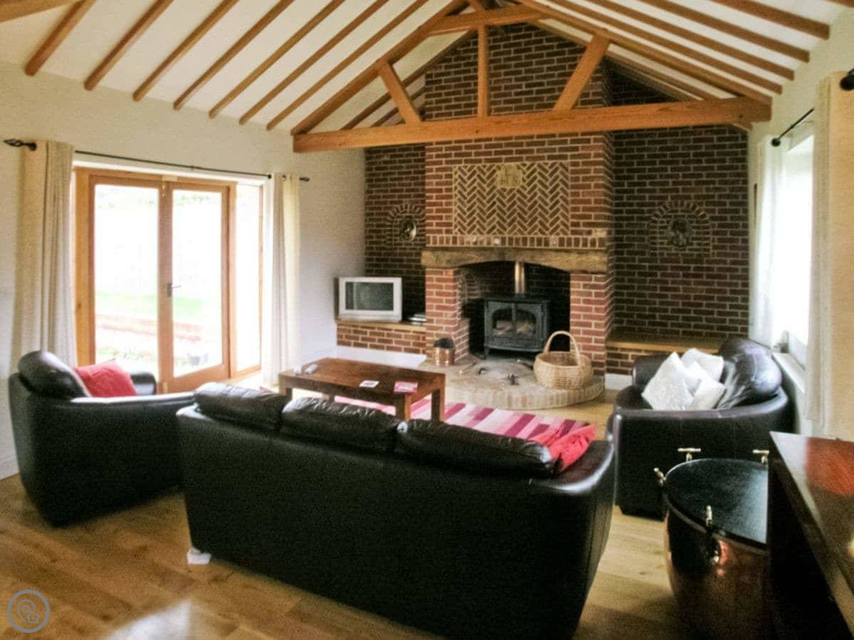 Beech Barn itself sleeps six. Three bedrooms, two bathrooms. It’s all on one floor. It’s got a 4 Star rating, which means it’s well kept and comfortable. There’s a wood-burning stove, which is nice in the cooler months. The garden is enclosed and there’s a private hot tub.