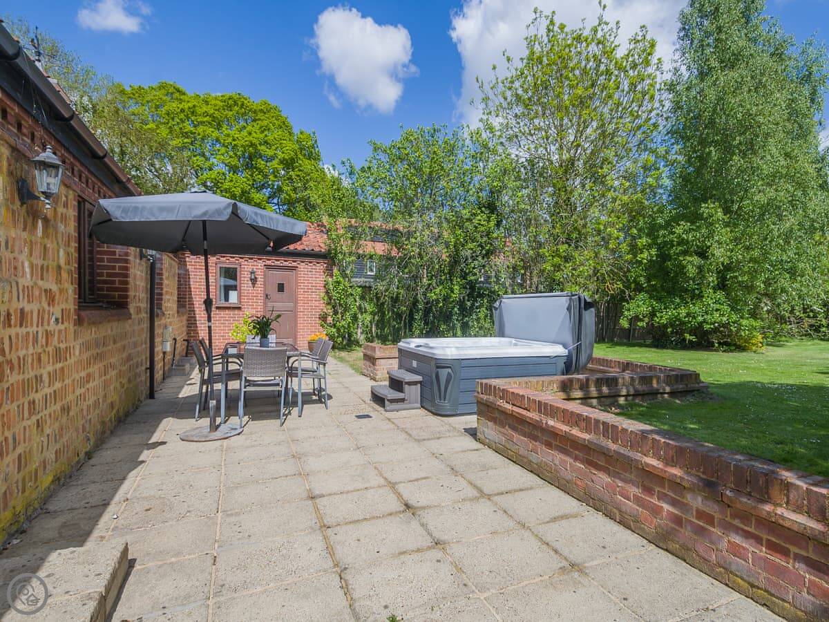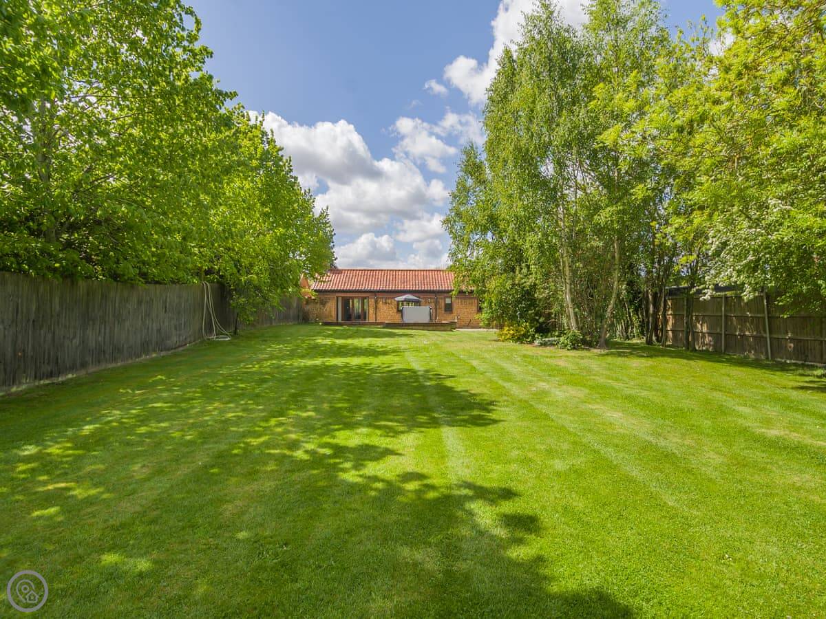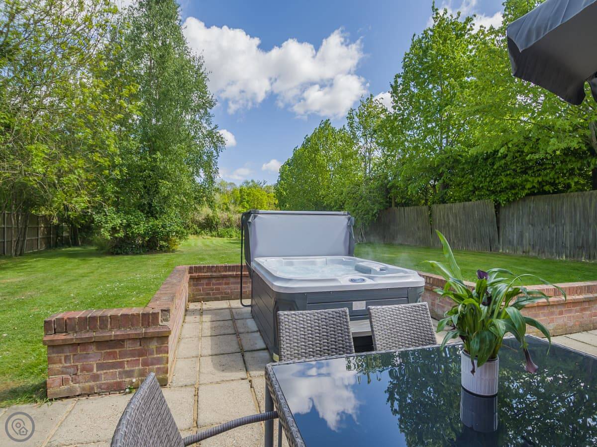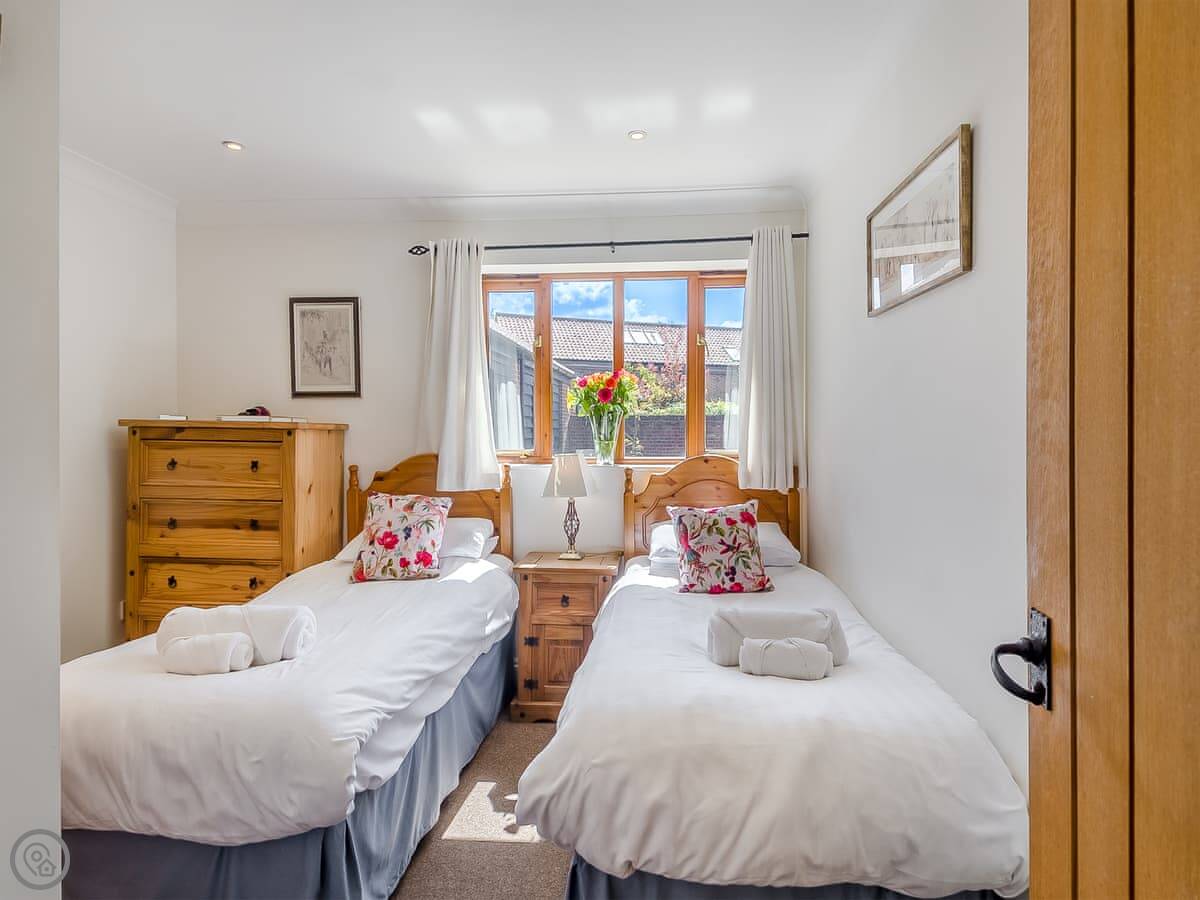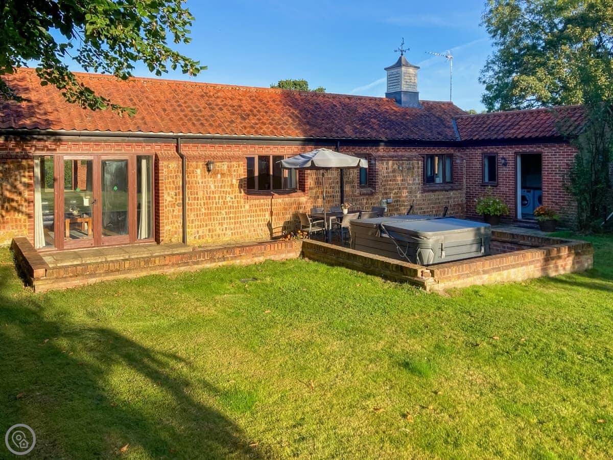 Beech Barn itself sleeps six. Three bedrooms, two bathrooms. It’s all on one floor. It’s got a 4 Star rating, which means it’s well kept and comfortable. There’s a wood-burning stove, which is nice in the cooler months. The garden is enclosed and there’s a private hot tub.
