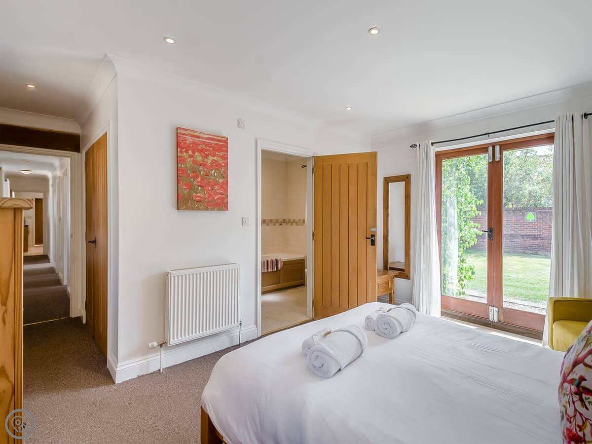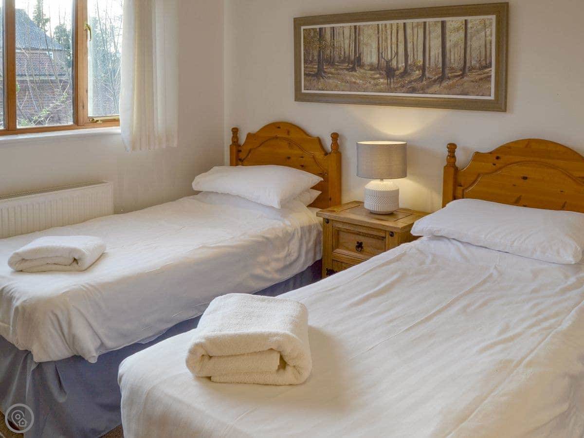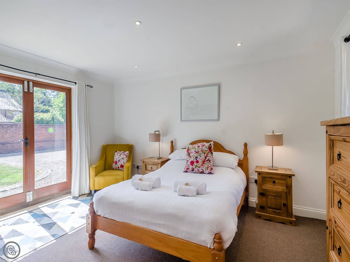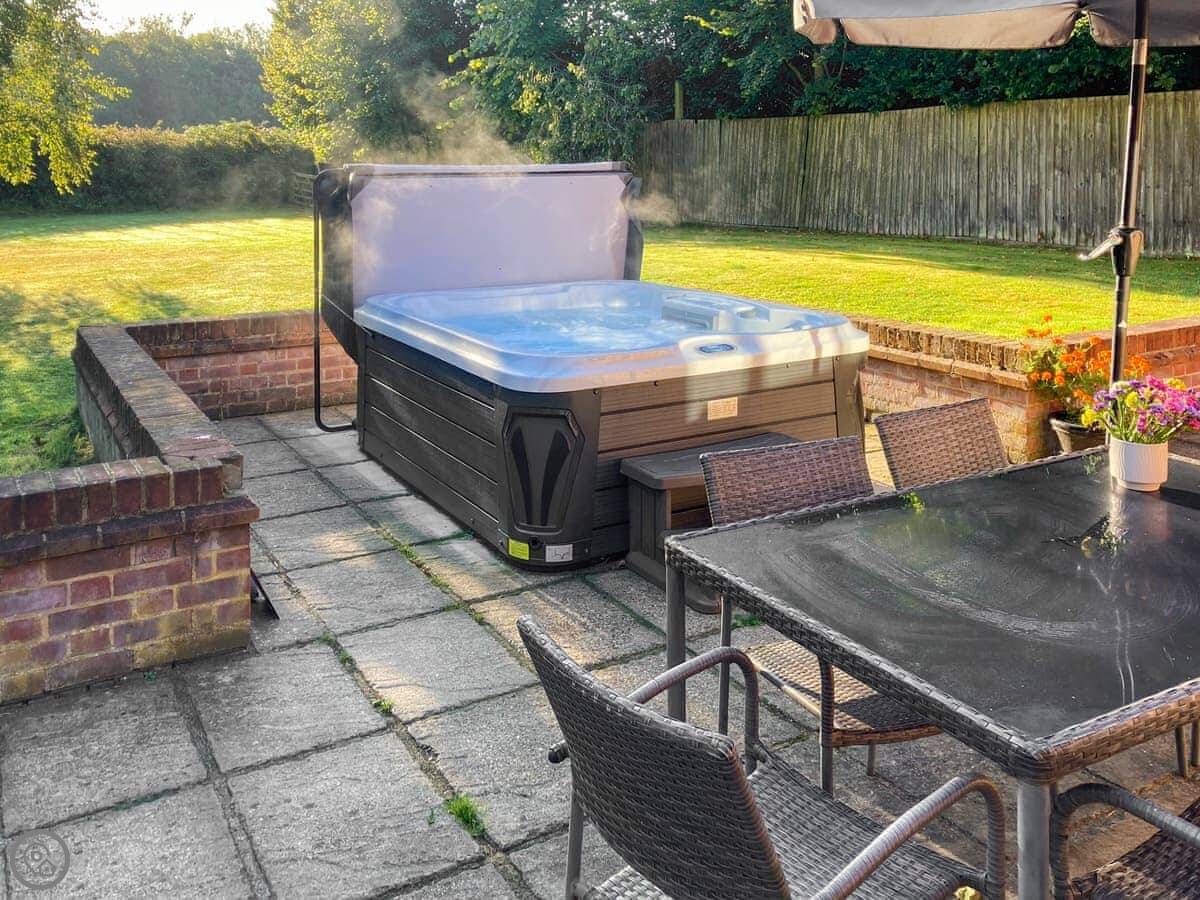 Beech Barn itself sleeps six. Three bedrooms, two bathrooms. It’s all on one floor. It’s got a 4 Star rating, which means it’s well kept and comfortable. There’s a wood-burning stove, which is nice in the cooler months. The garden is enclosed and there’s a private hot tub.