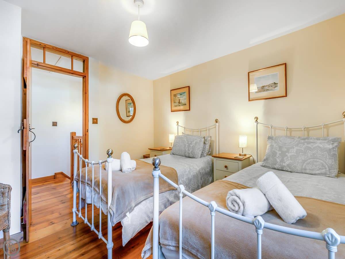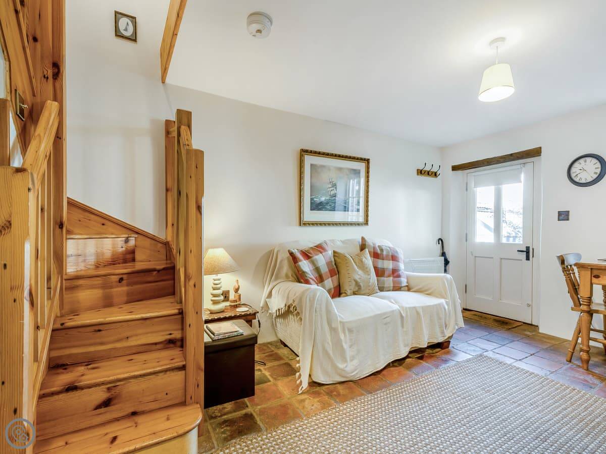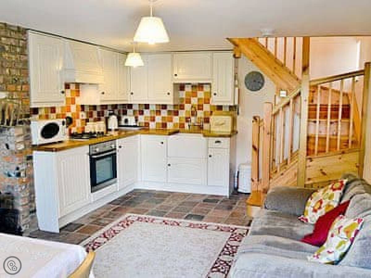 The ground floor features a welcoming open-plan living space boasting wooden flows throughout, complete with a Freeview TV and a well-equipped kitchen area, ideal for relaxed evenings after a day of exploring. The cottage is decorated throughout in warm, inviting tones that create a homely and peaceful atmosphere. Upstairs, guests will find a bright twin bedroom, dressed in comfortable linens perfect for a restful night’s sleep, along with a separate modern shower room for added convenience.