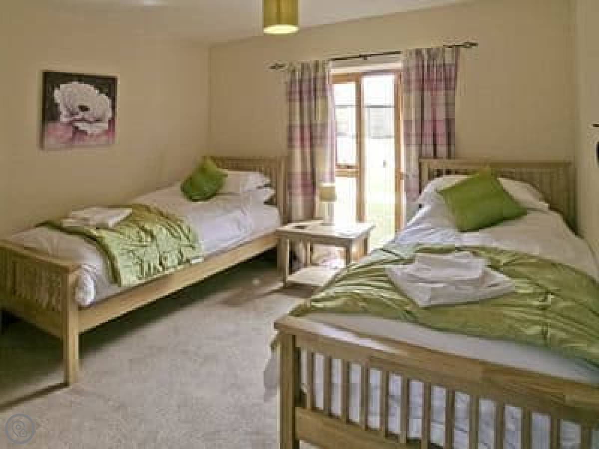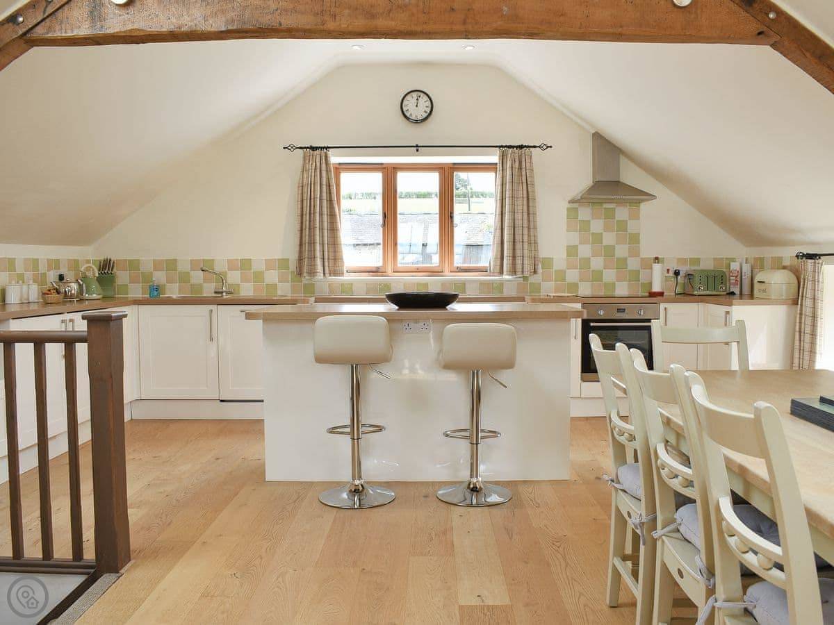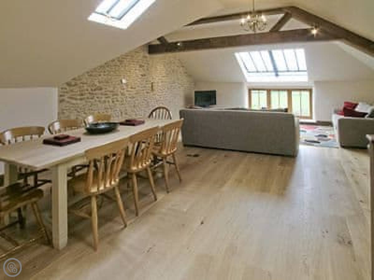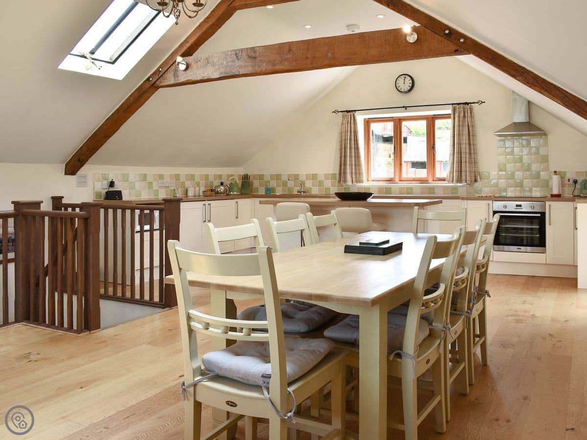 The cottage sleeps eight. There are four bedrooms and three bathrooms. It's a 5 Star rating. It's nice, but it's still a converted farm building. The layout is upside down, so the living area is upstairs. That's not a mistake, it's just the design. It means the views from the main room are better.