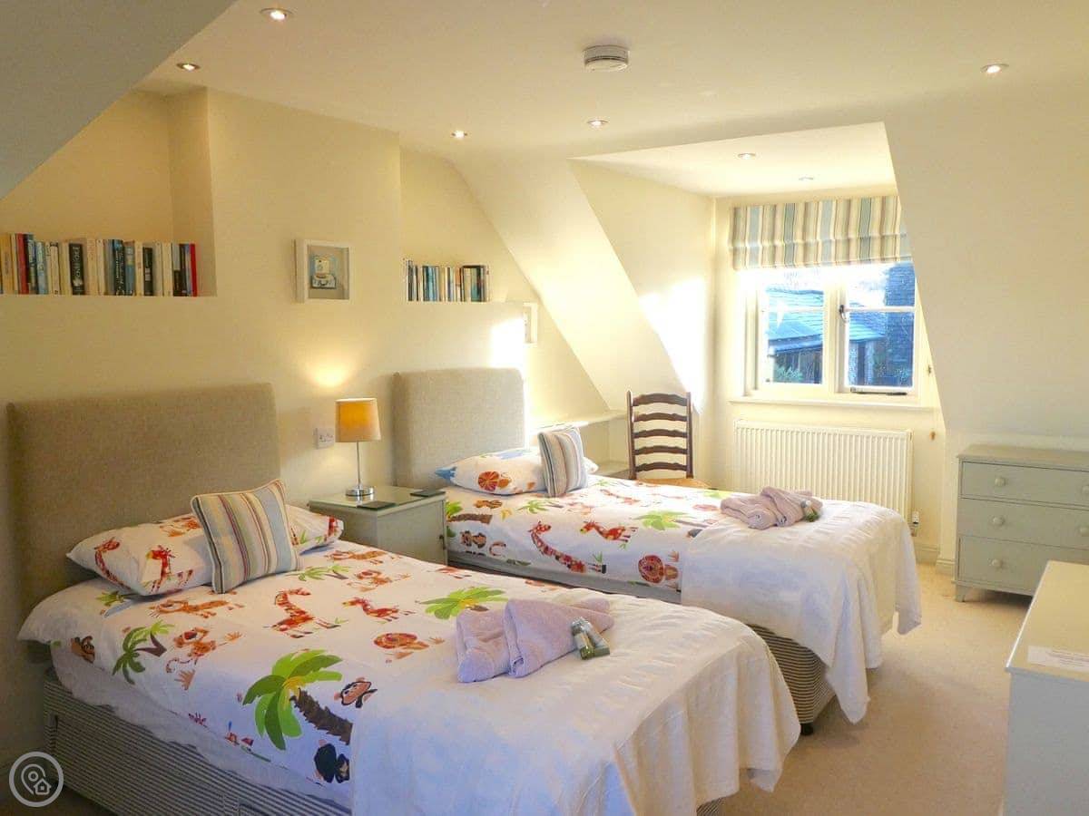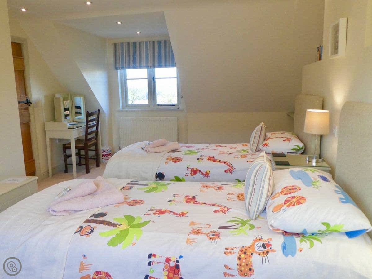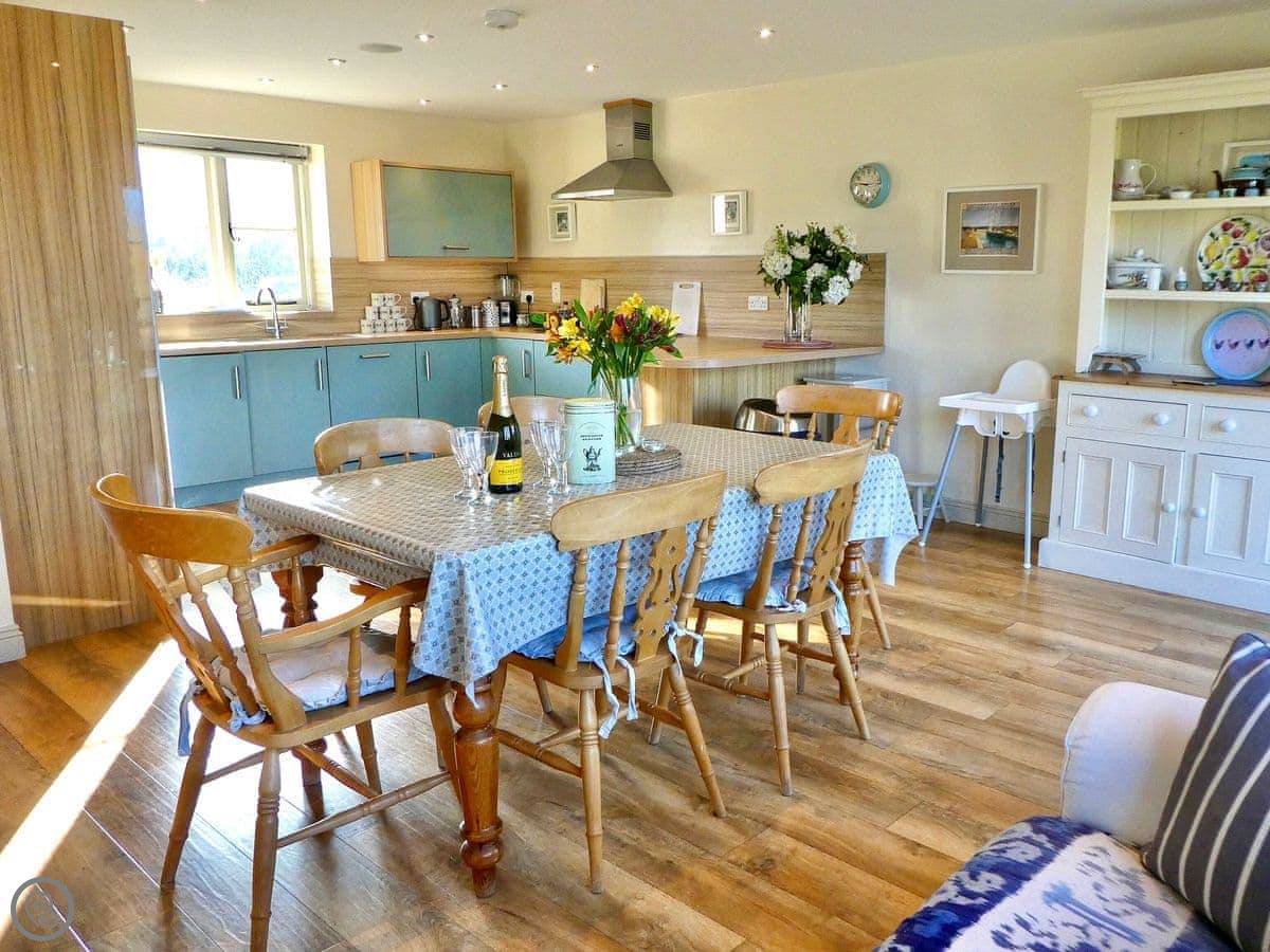 It sleeps five people. There are three bedrooms and two bathrooms, which is handy. It's got a 5 Star rating. It's well-insulated and warm, an eco-build. The heating's included.