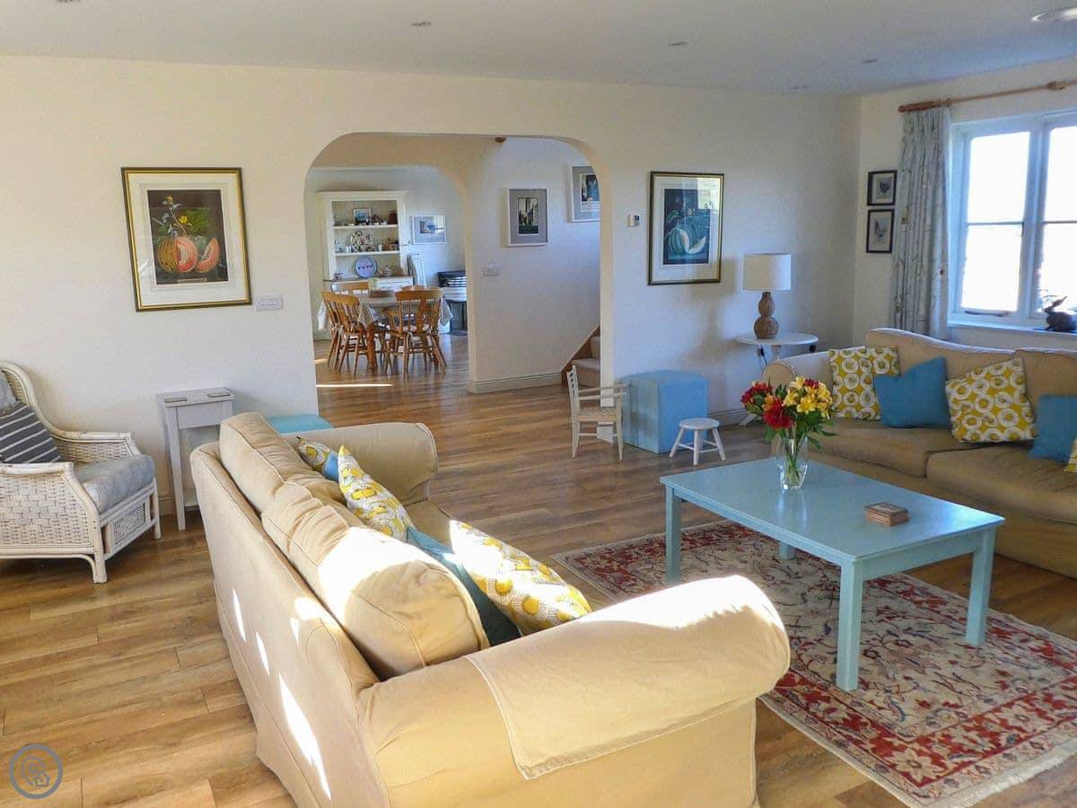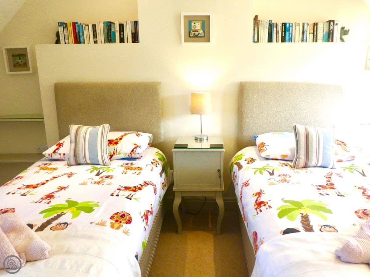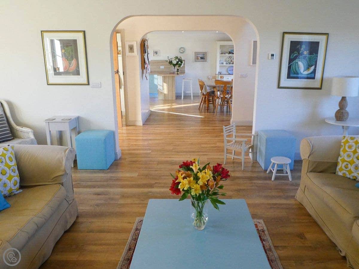 It sleeps five people. There are three bedrooms and two bathrooms, which is handy. It's got a 5 Star rating. It's well-insulated and warm, an eco-build. The heating's included.