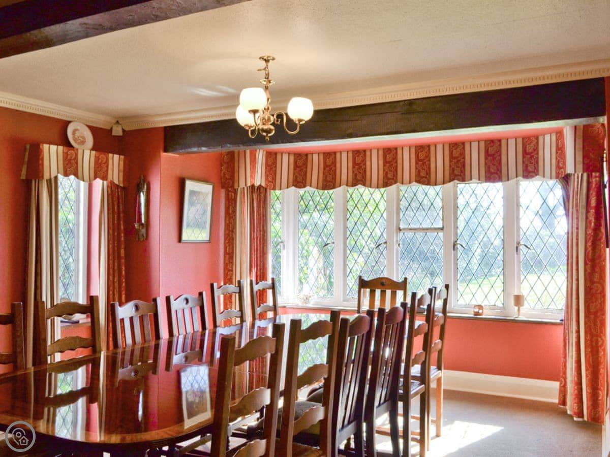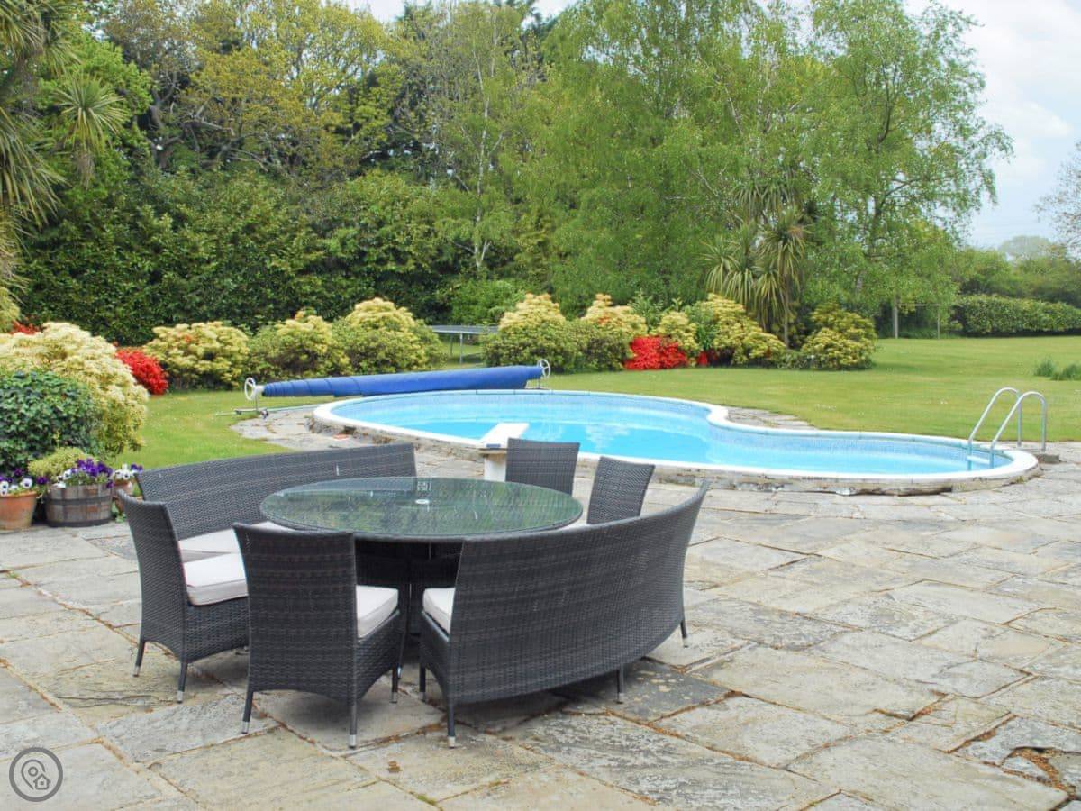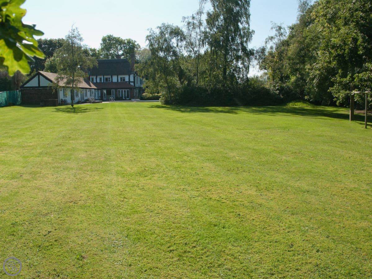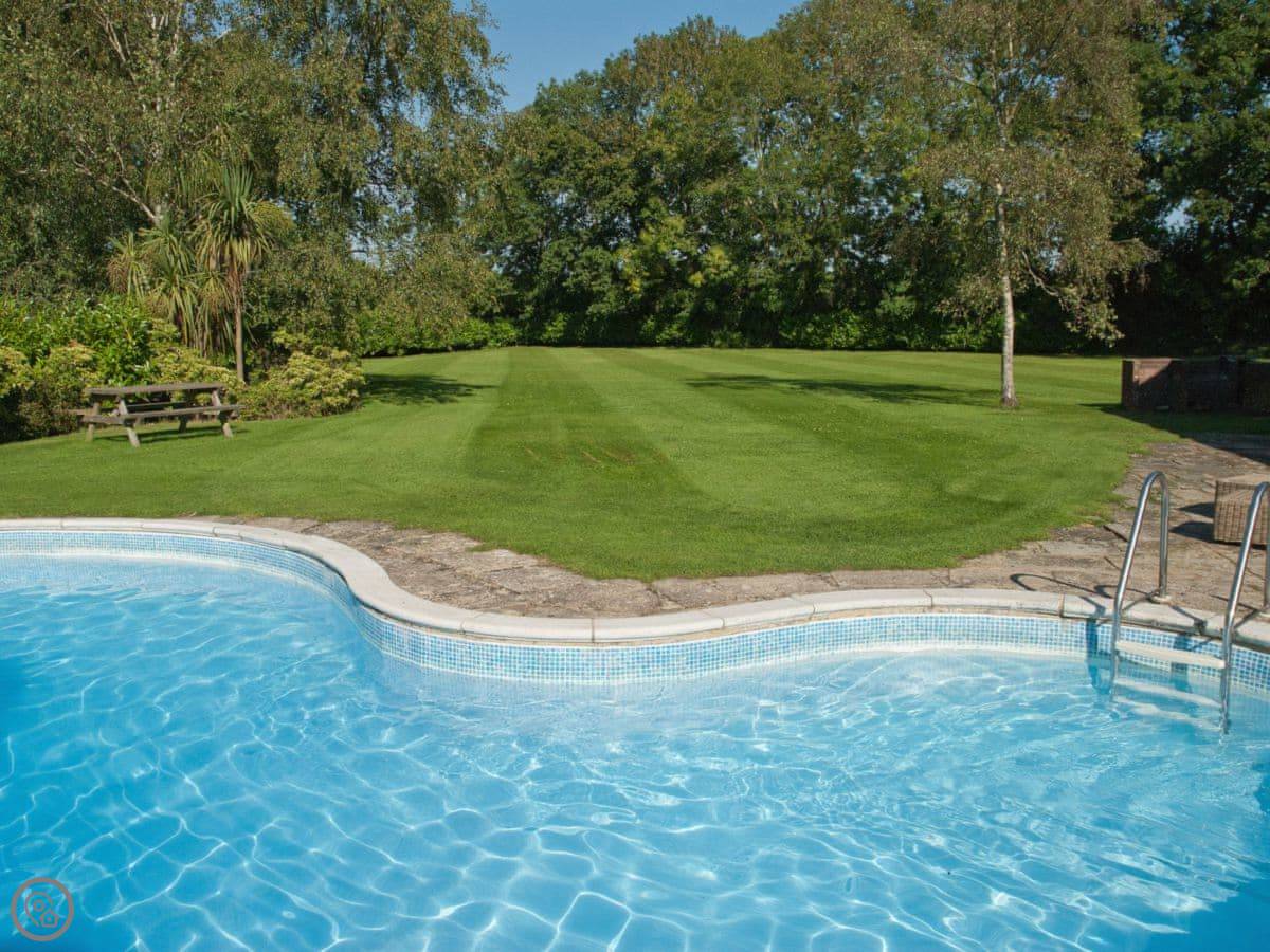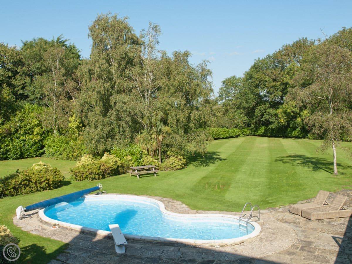It sleeps 14 people, which is a lot. Seven bedrooms, four bathrooms. It’s got a 4 Star rating. The garden is about four acres. There’s a heated outdoor swimming pool, which you get to from the kitchen. There are two big lawns, a BBQ, and a space for ball games.