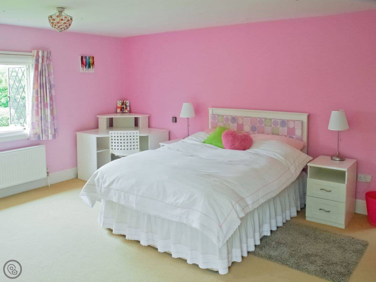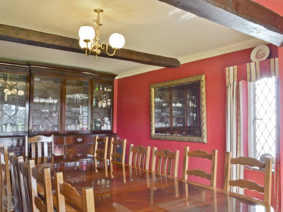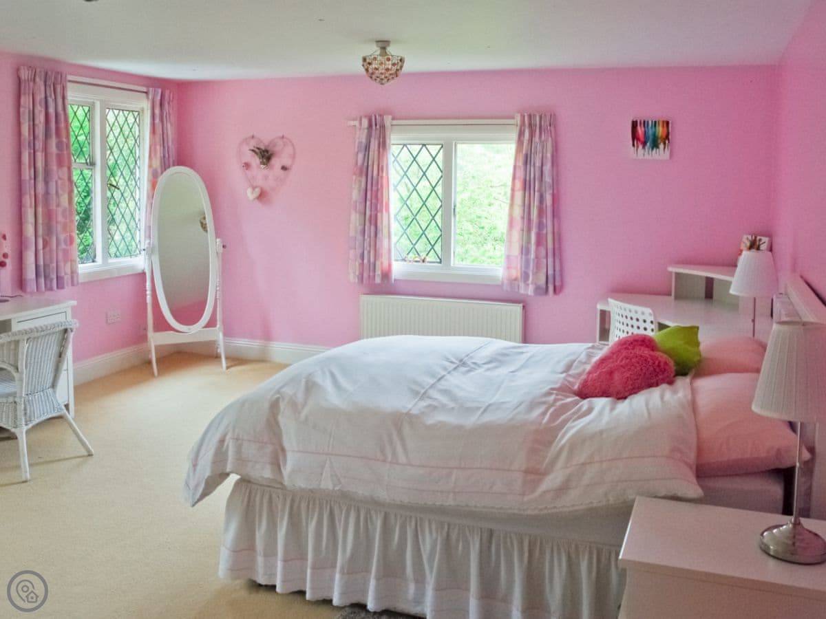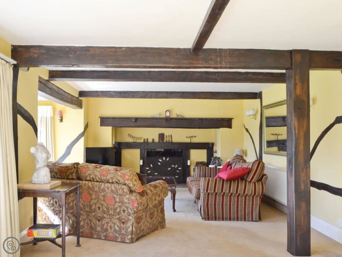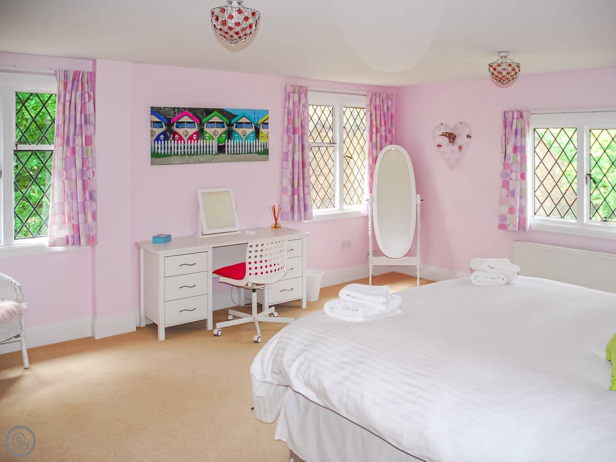 It sleeps 14 people, which is a lot. Seven bedrooms, four bathrooms. It’s got a 4 Star rating. The garden is about four acres. There’s a heated outdoor swimming pool, which you get to from the kitchen. There are two big lawns, a BBQ, and a space for ball games.