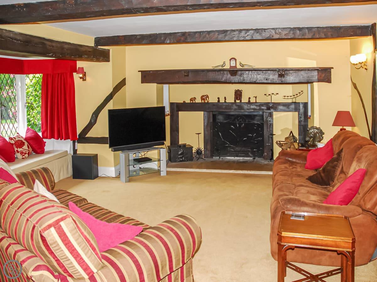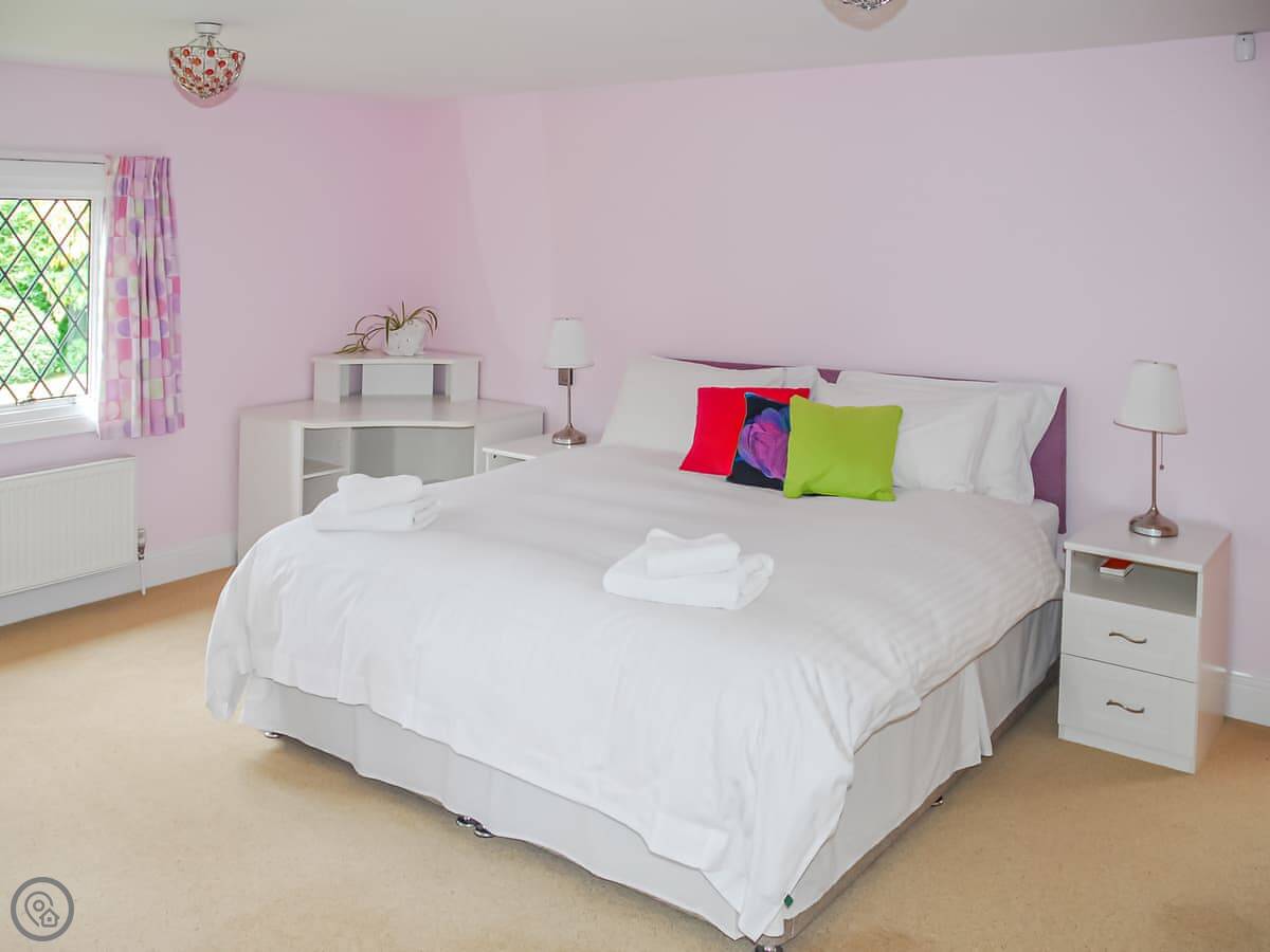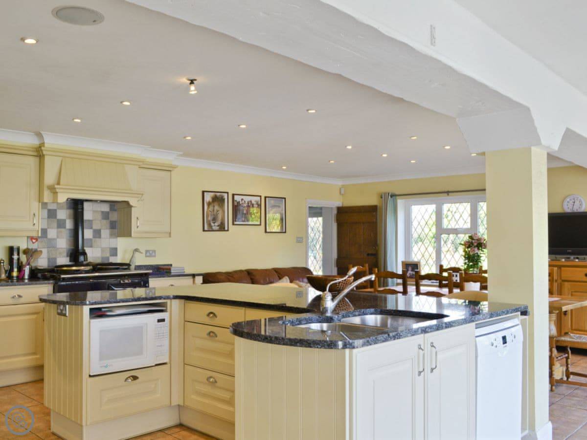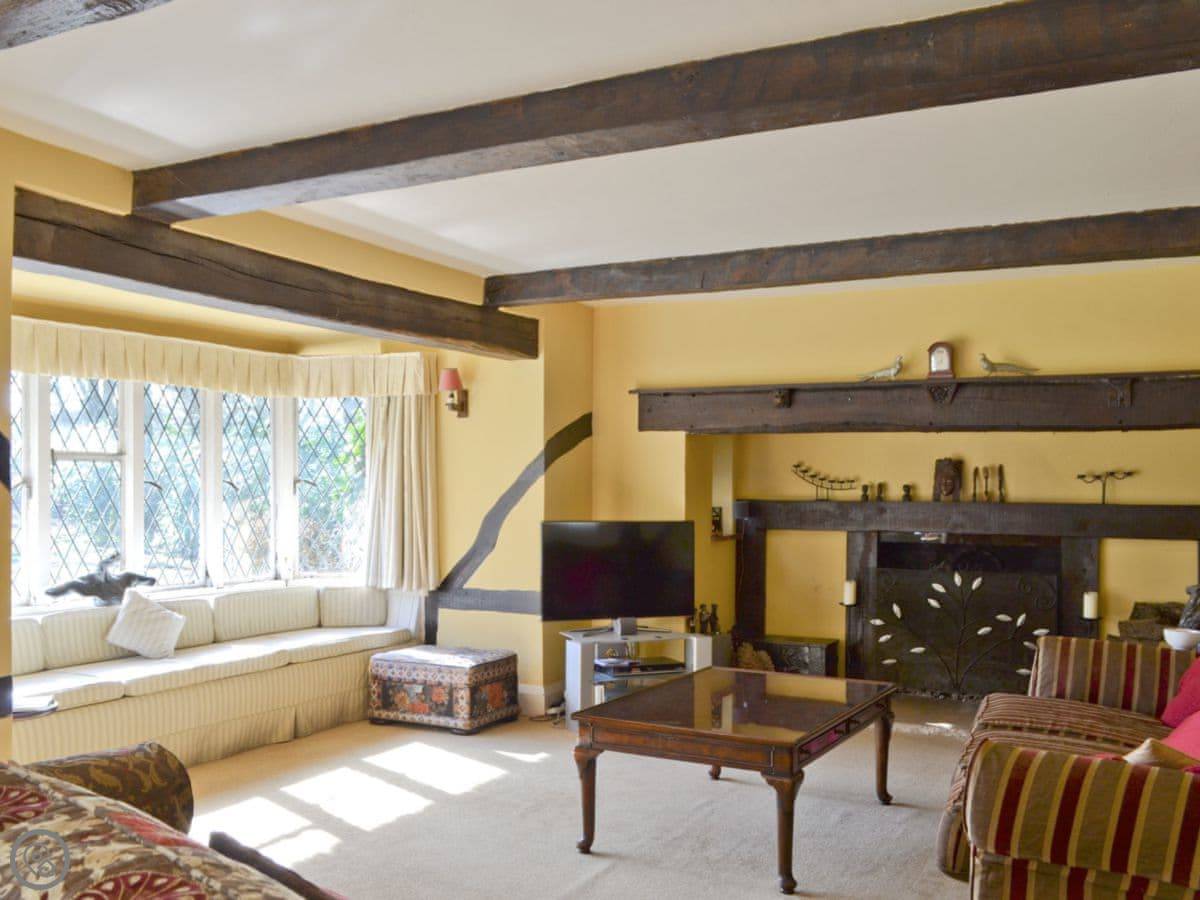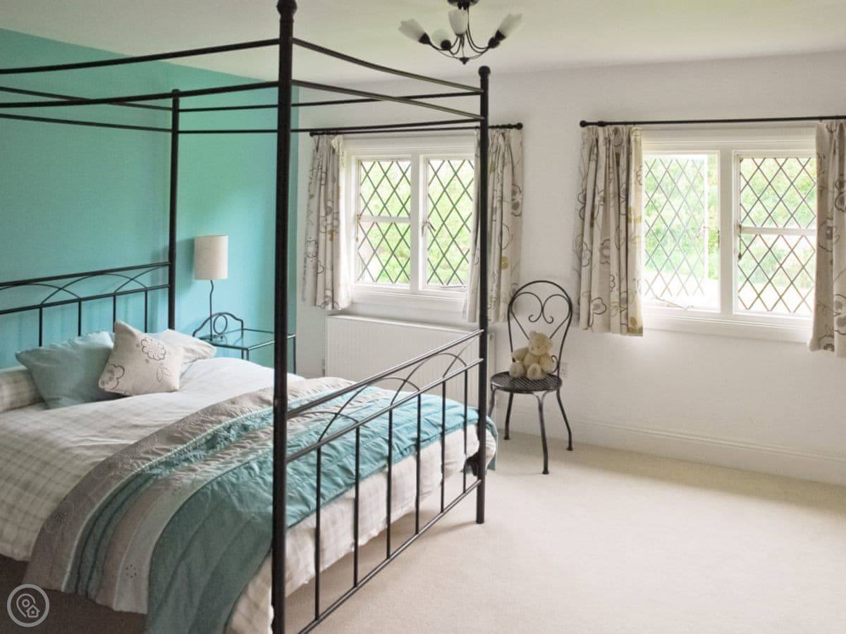 It sleeps 14 people, which is a lot. Seven bedrooms, four bathrooms. It’s got a 4 Star rating. The garden is about four acres. There’s a heated outdoor swimming pool, which you get to from the kitchen. There are two big lawns, a BBQ, and a space for ball games.