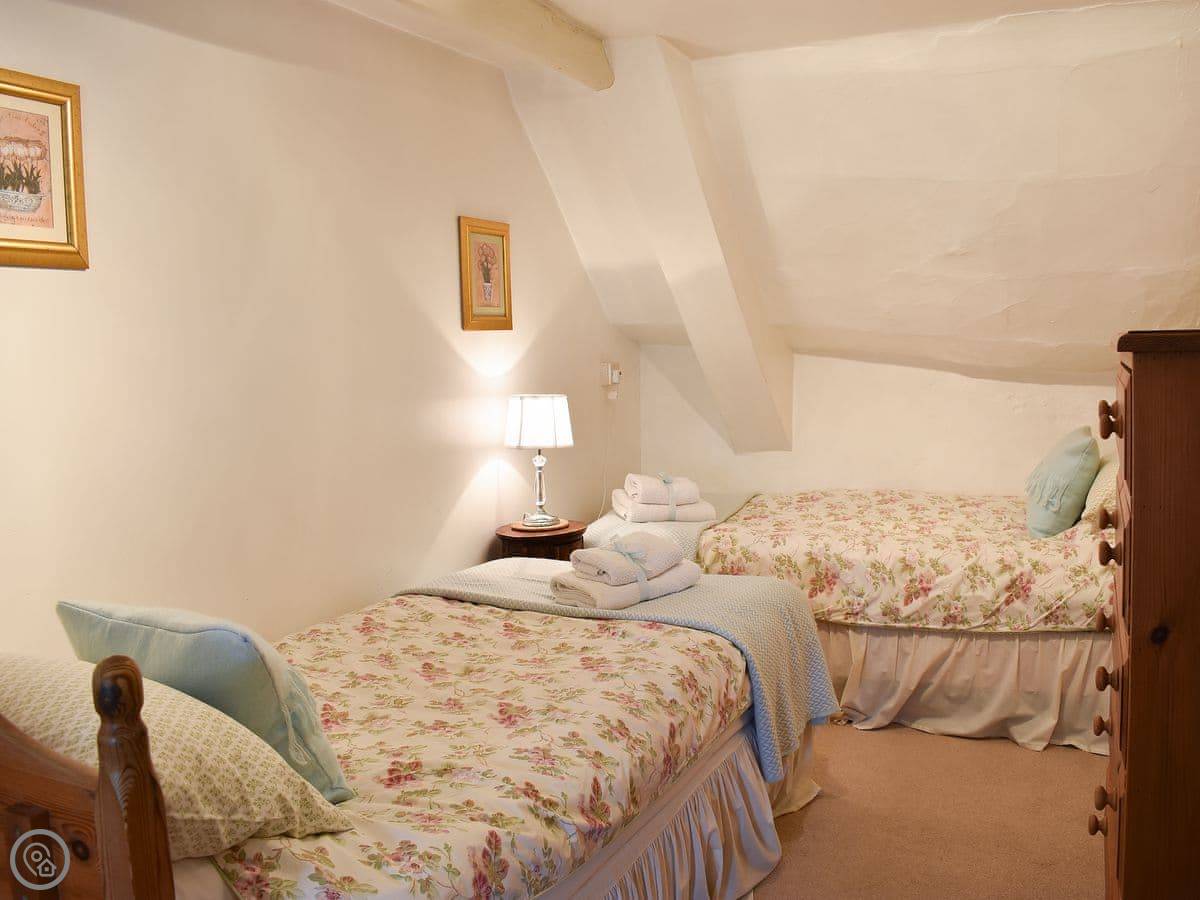 It sleeps four in two bedrooms. Both bedrooms are upstairs, one double and one twin. They have sloping ceilings and beams, and the double leads through from the twin. There's one bathroom. The rating is 4 Star. It means it's comfortable and well looked after.