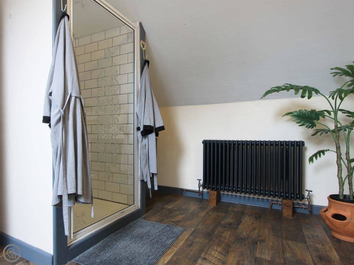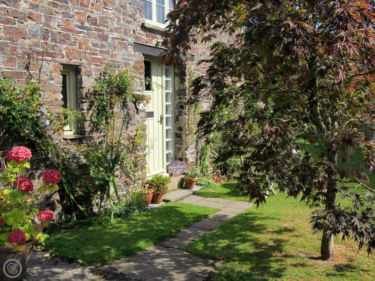 Outside, it's in a walled courtyard next to our house. You park right outside. There's your own enclosed garden at the back with a patio and lawn. A gate from there leads into about two acres of our grounds, which are fenced. There's a footpath from there straight into some nice woodland walks.