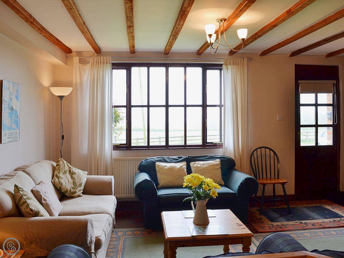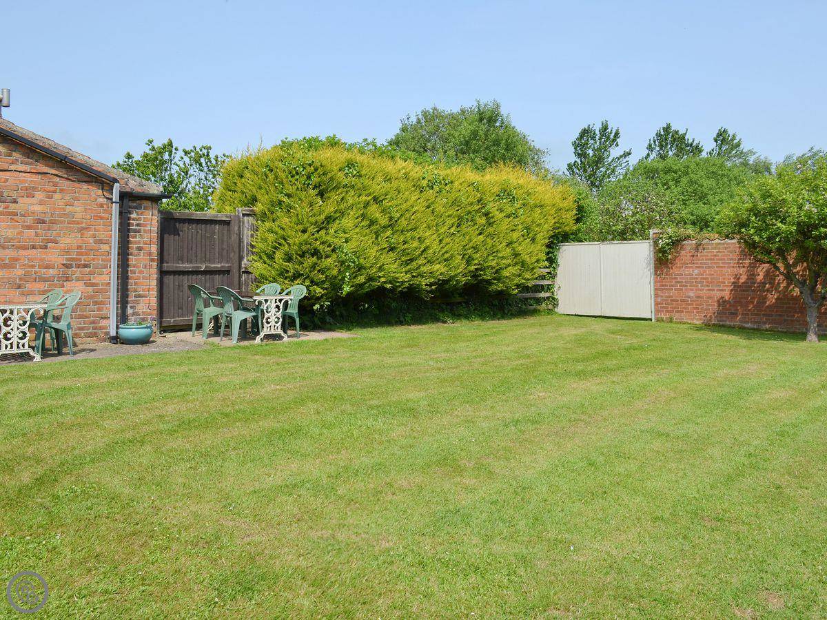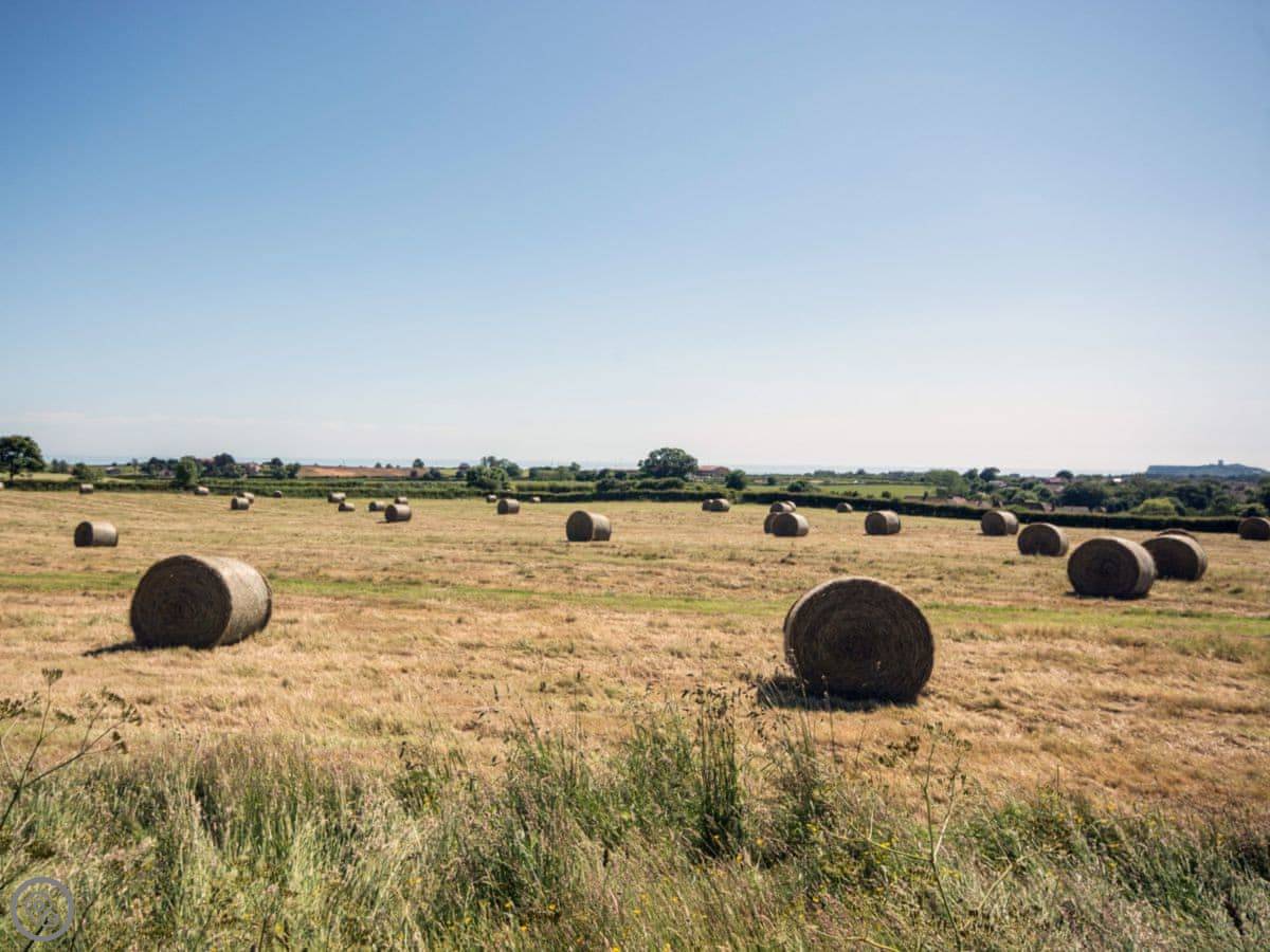 The cottage sleeps five. Three bedrooms, each with its own bathroom. It's got a 4 Star rating. It's modern inside, comfortable and clean. The garden at the back is enclosed. There's a patio with furniture and a shared barbecue area. The front looks over fields towards the sea. You can see Scarborough Castle from here.