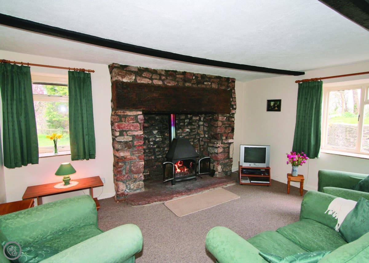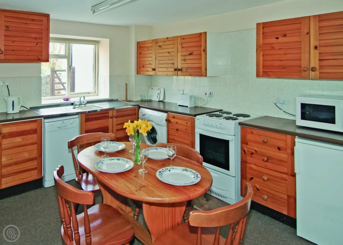 Downstairs, there's a living room with a wood burner. We leave you some logs to get started. The kitchen has a dishwasher and a washing machine. You can get WiFi, but it's the farm kind so don't expect to stream films on five devices at once.