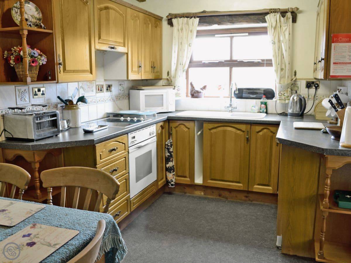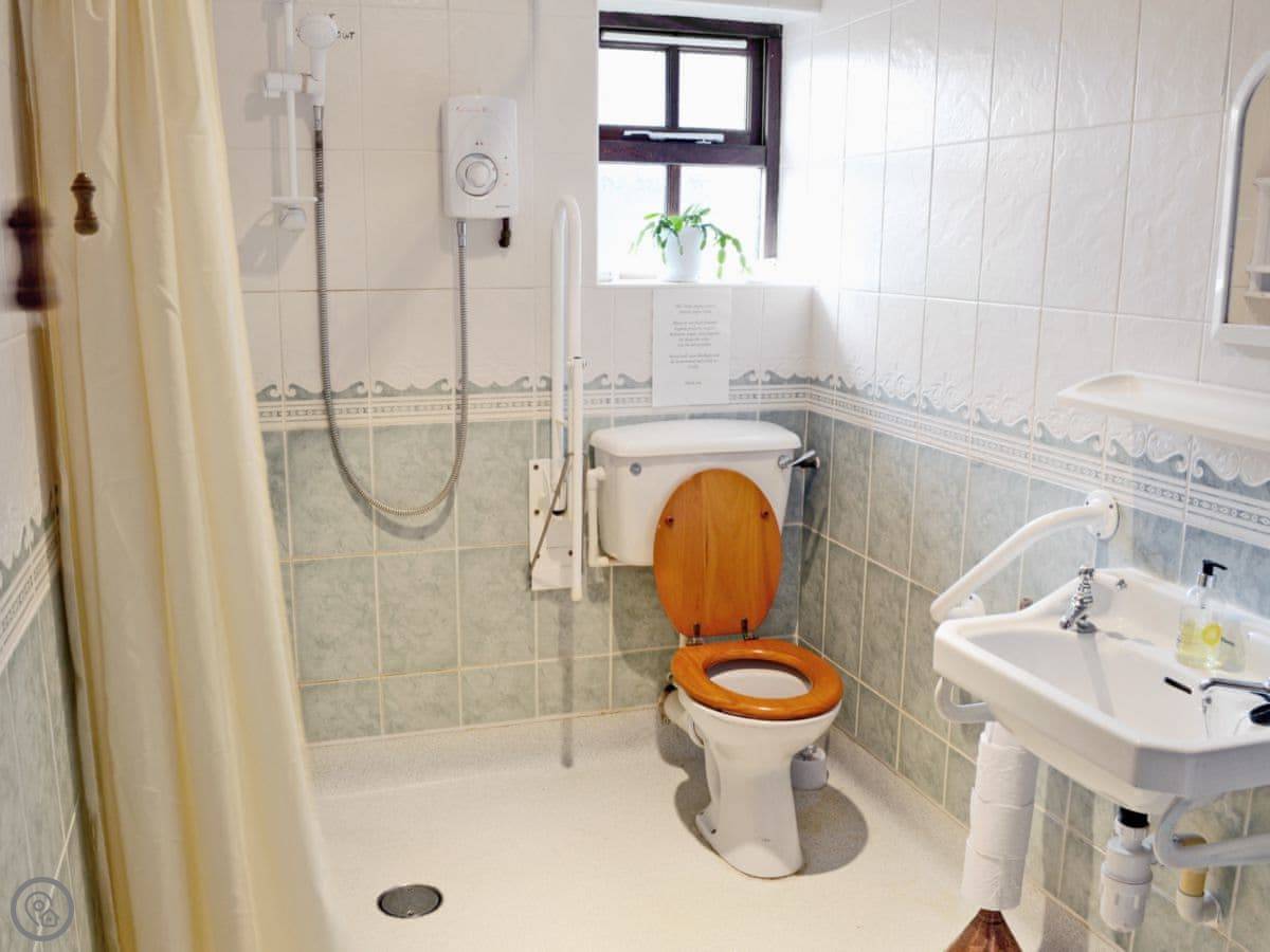 It sleeps four. Two bedrooms, one bathroom. The bathroom is a wet room on the ground floor. It's got wheelchair access throughout and grab rails in places, so it's suitable for someone with limited mobility. There's parking right outside.