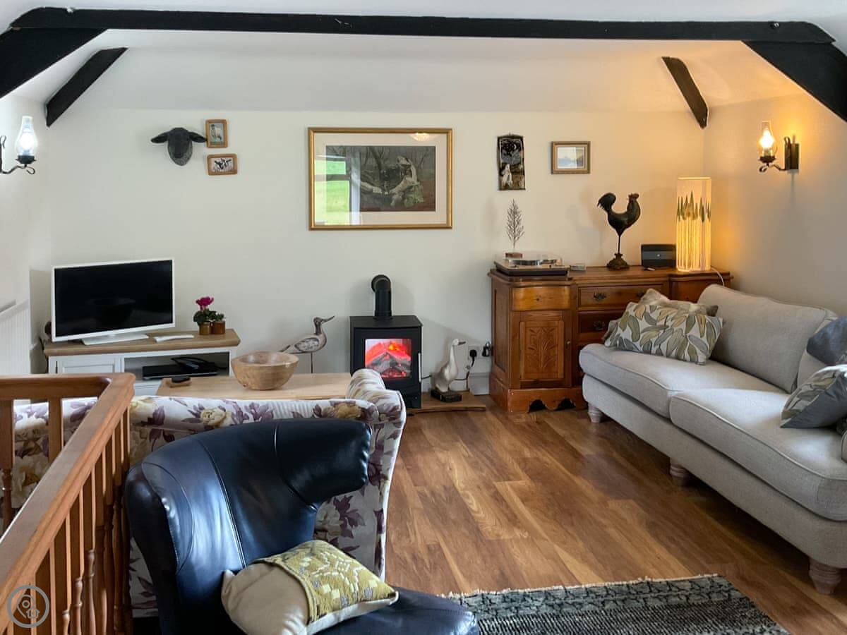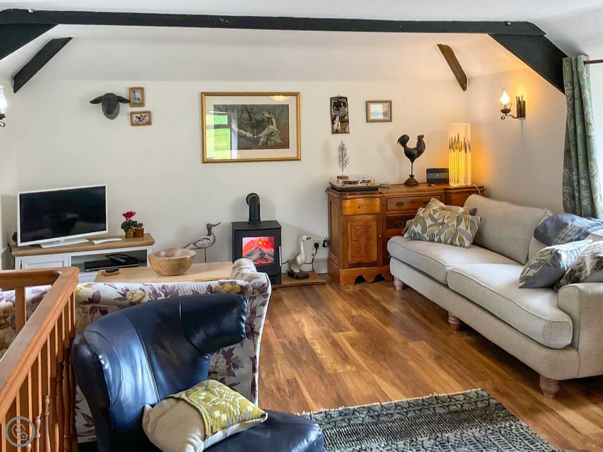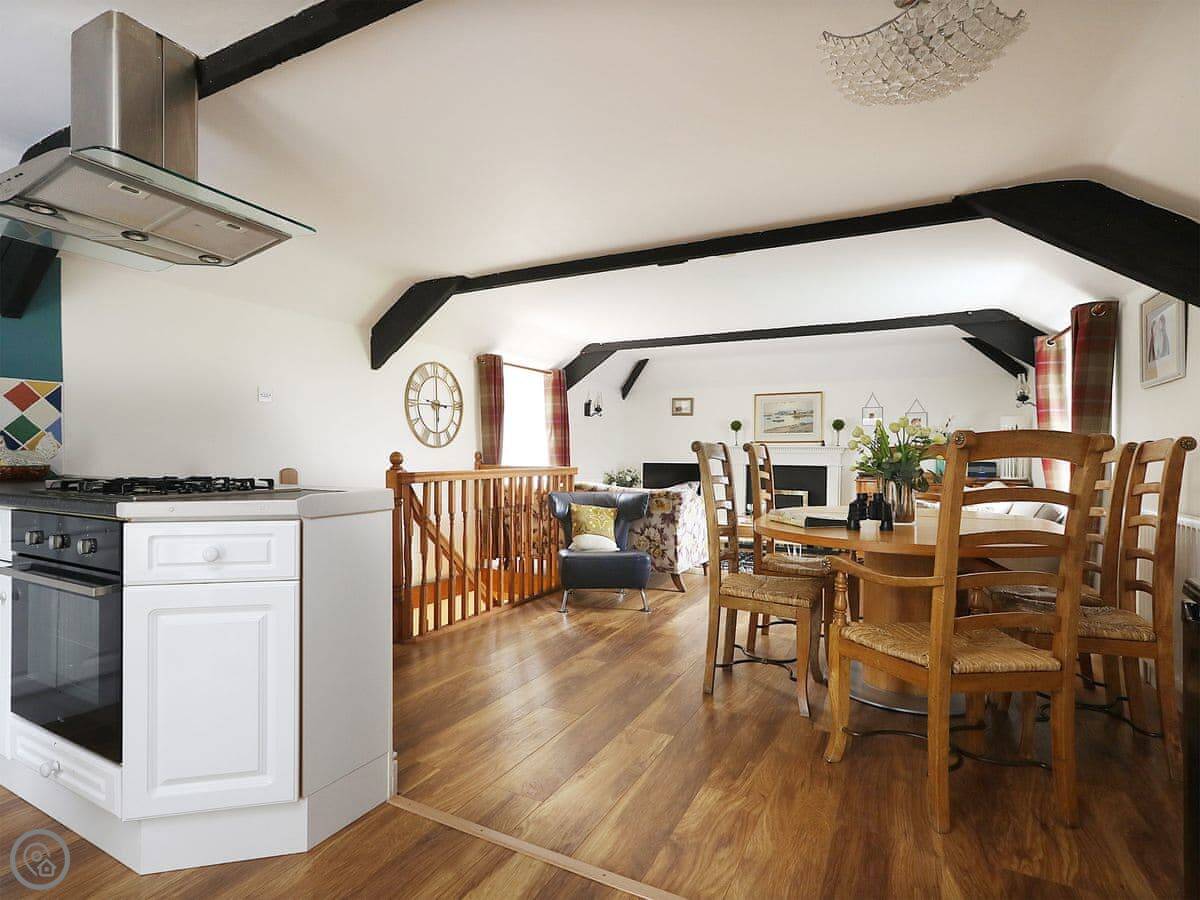 The layout is a bit different because it was a stable originally. The main living area and kitchen are on the first floor. That's where you get the best views from the windows, over the fields and forest. The stairs are normal.
