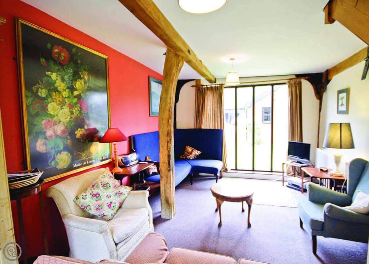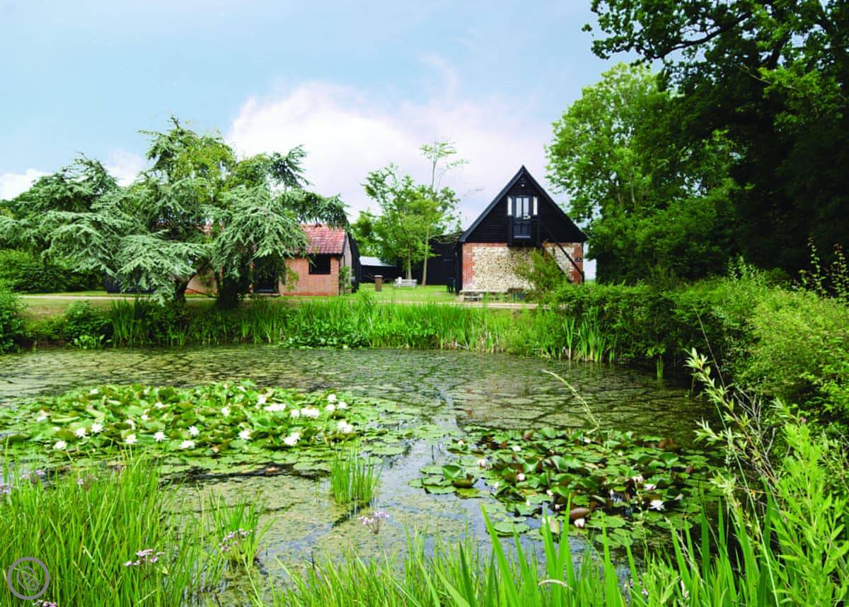 The Granary is in Saxtead, Suffolk. It's a detached cottage converted from an old granary. It looks over a pond with lilies and ducks. The garden is shared with one other cottage, The Stables, and the owners' farmhouse. It's about four acres, with a tennis court you can use.