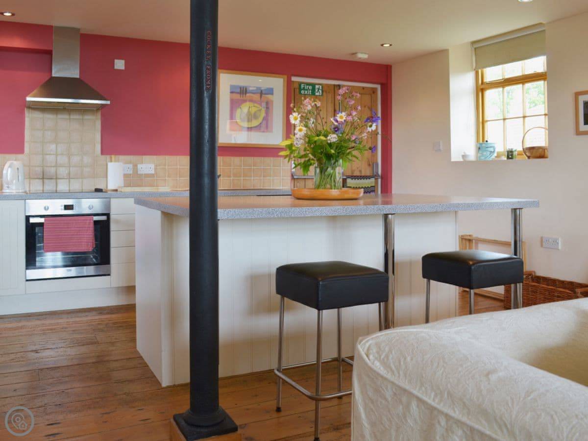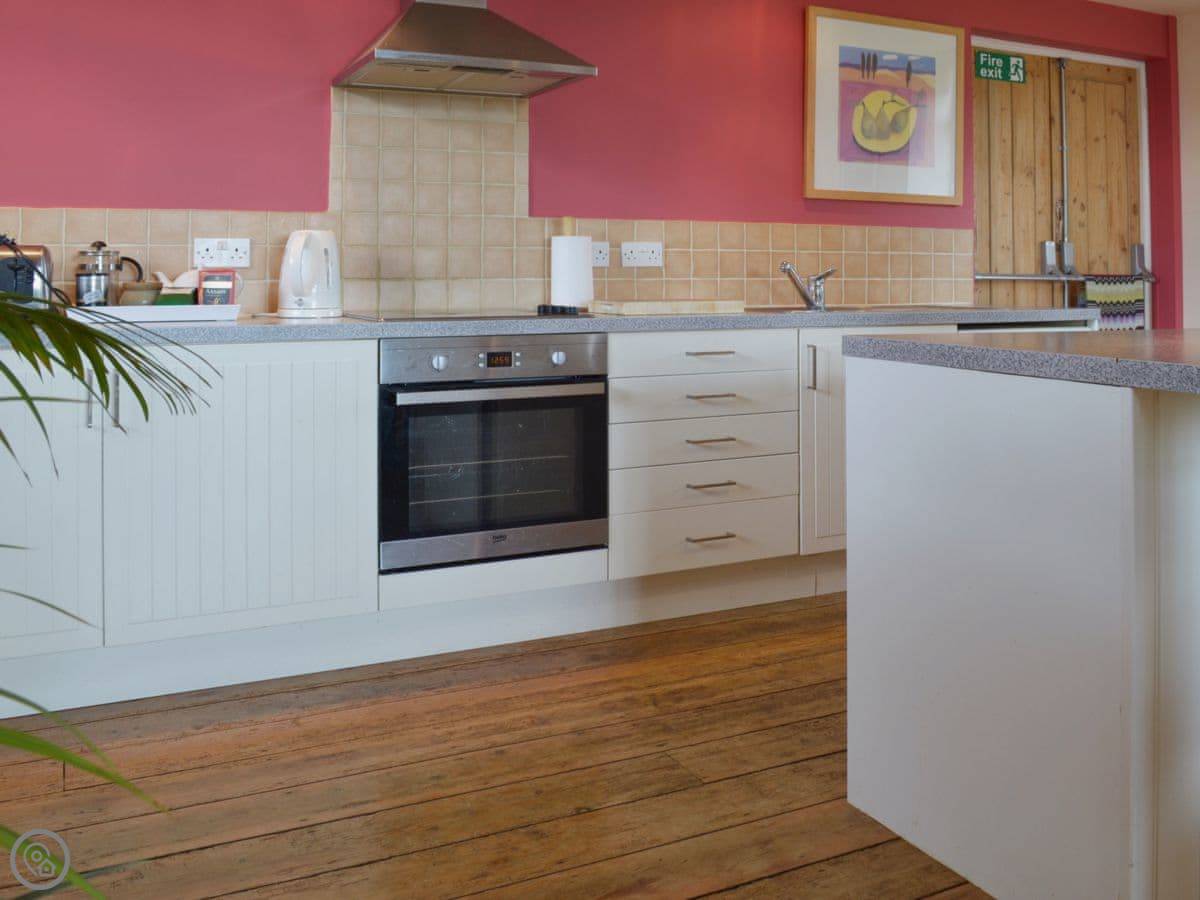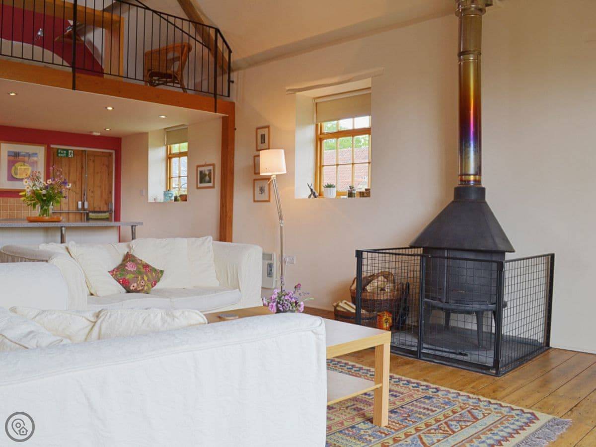 Inside, it's open plan. There's a woodburning stove for cooler evenings, which is nice. It's got the things you'd expect: WiFi, a TV, a dishwasher, a washing machine. Bedding is included. You can park on site.