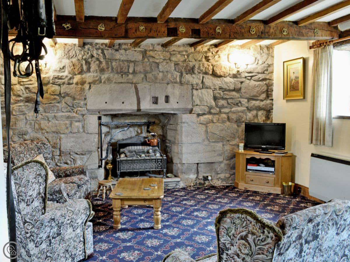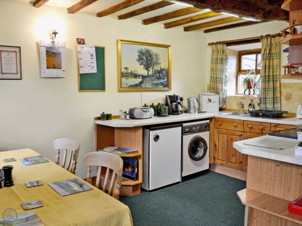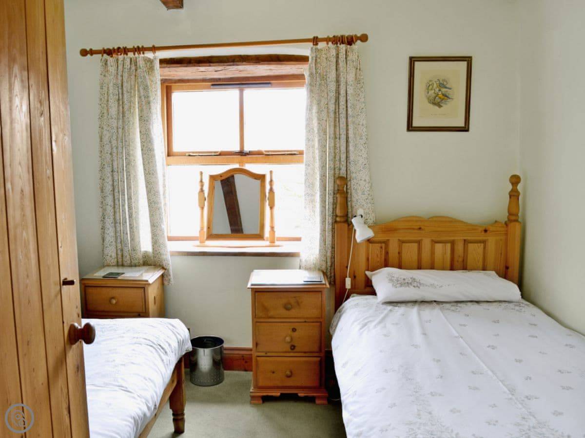The place sleeps six. Three bedrooms and one bathroom. It's got a 3 Star rating, so it's comfortable and clean but not luxurious. The original cruck beams are still there, they're the big ones running through the middle of the cottage. They're low in a couple of places, so mind your head.