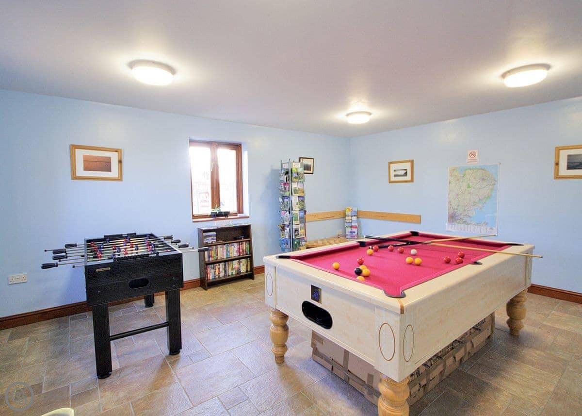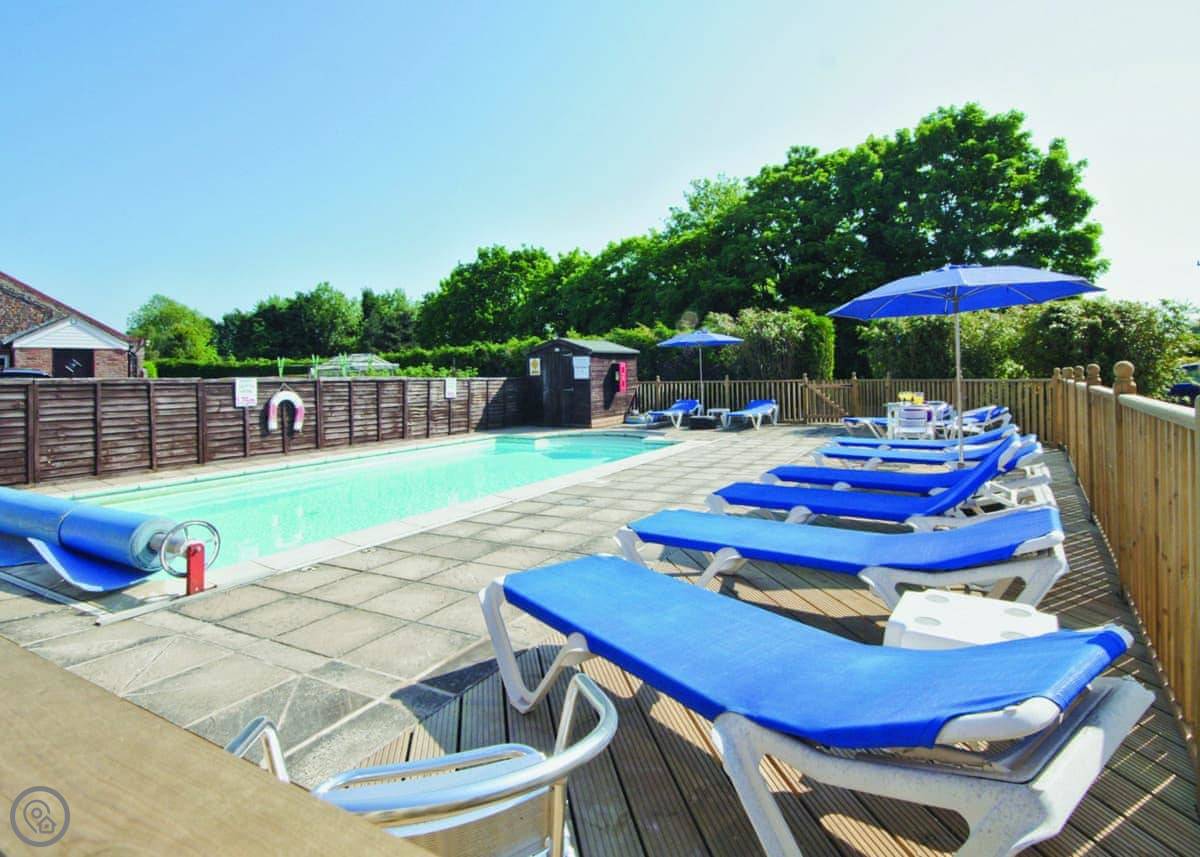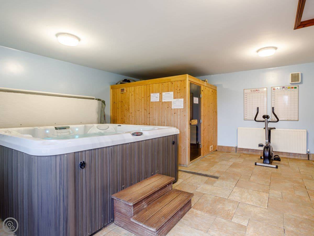 Outside, you have your own patio area with a table and a BBQ. The farm grounds are shared. There's a heated outdoor swimming pool you can use, which is good, and a games room. There's also a hot tub and a sauna. There's a kids play area too.