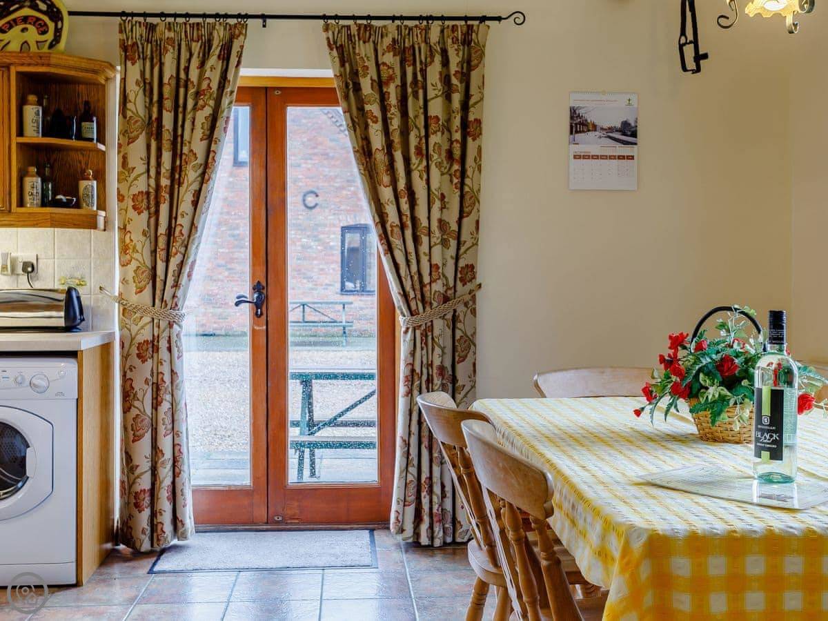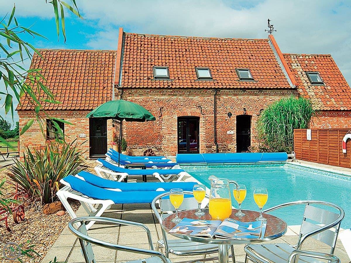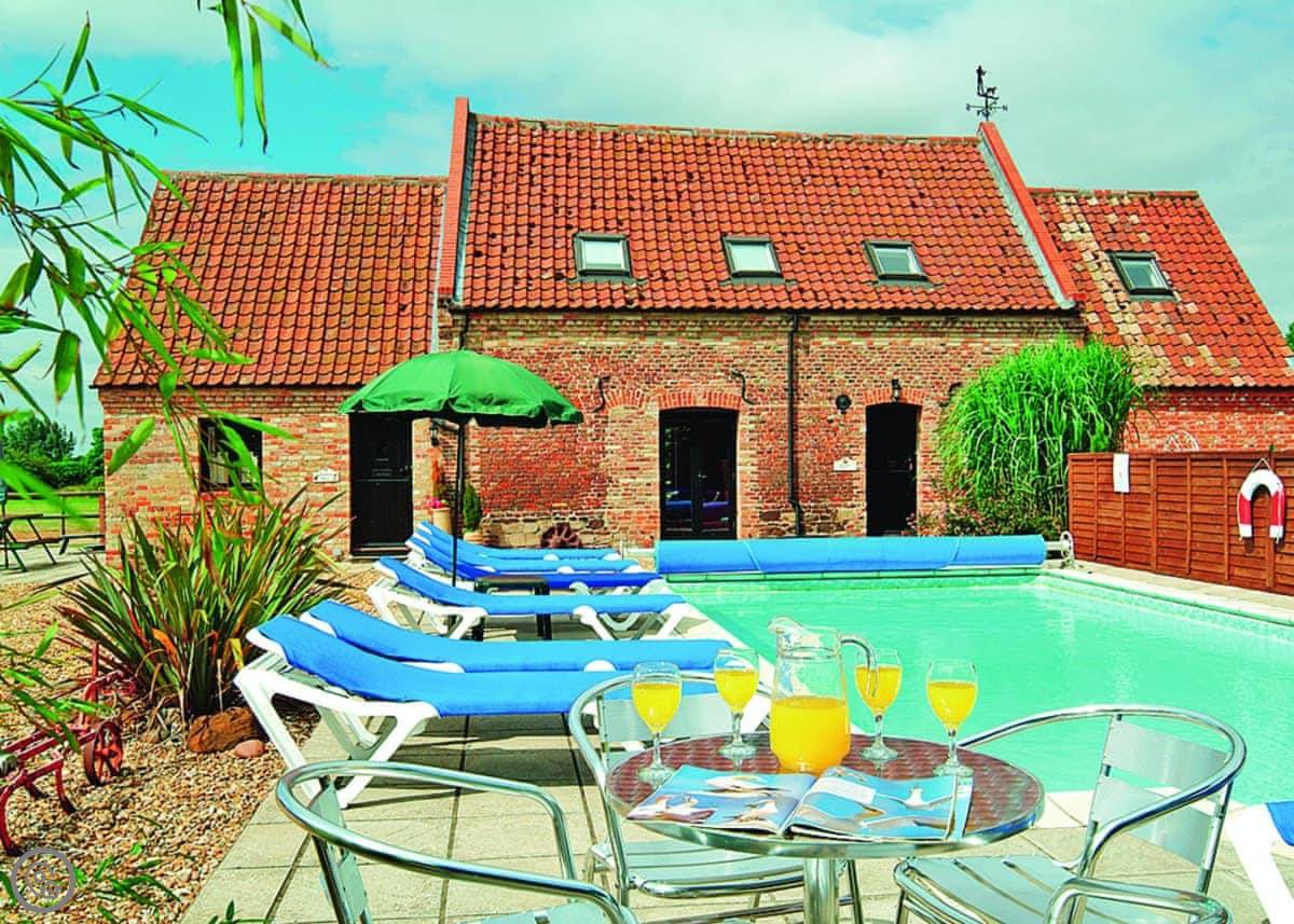 Outside, you have your own patio area with a table and a BBQ. The farm grounds are shared. There's a heated outdoor swimming pool you can use, which is good, and a games room. There's also a hot tub and a sauna. There's a kids play area too.