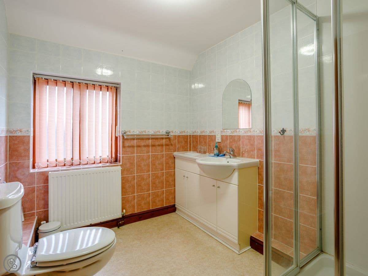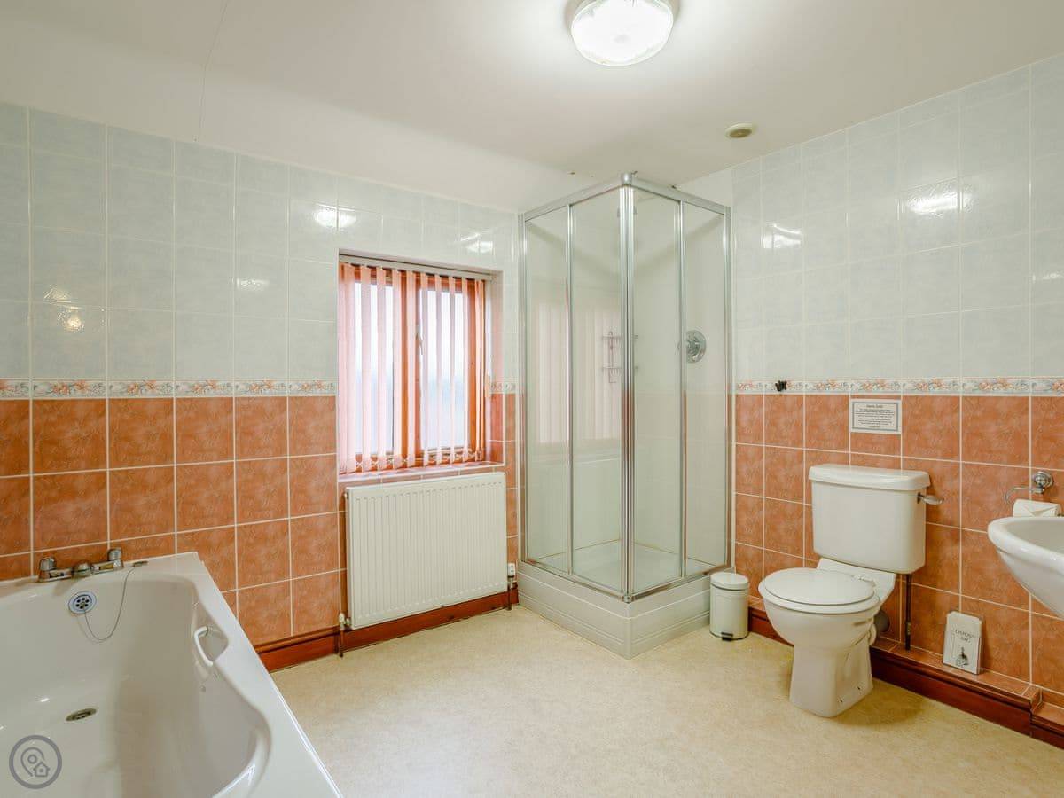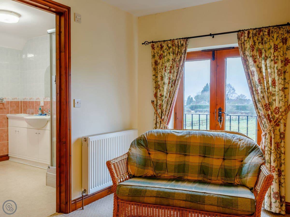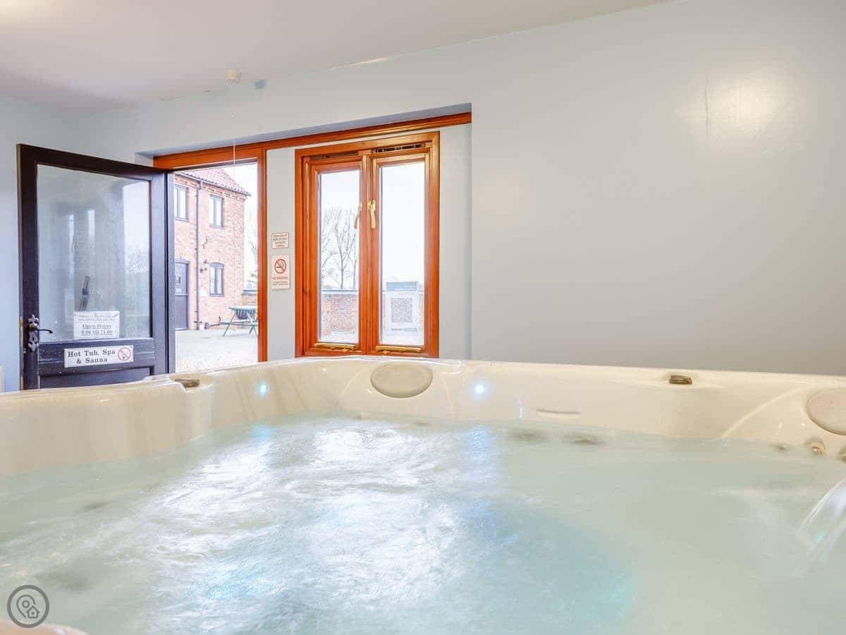 Outside, you get your own patio and garden area. Then you share the farm grounds. There's a heated outdoor swimming pool that's open in the summer. There's also a games room, a sauna, and a hot tub you can use.