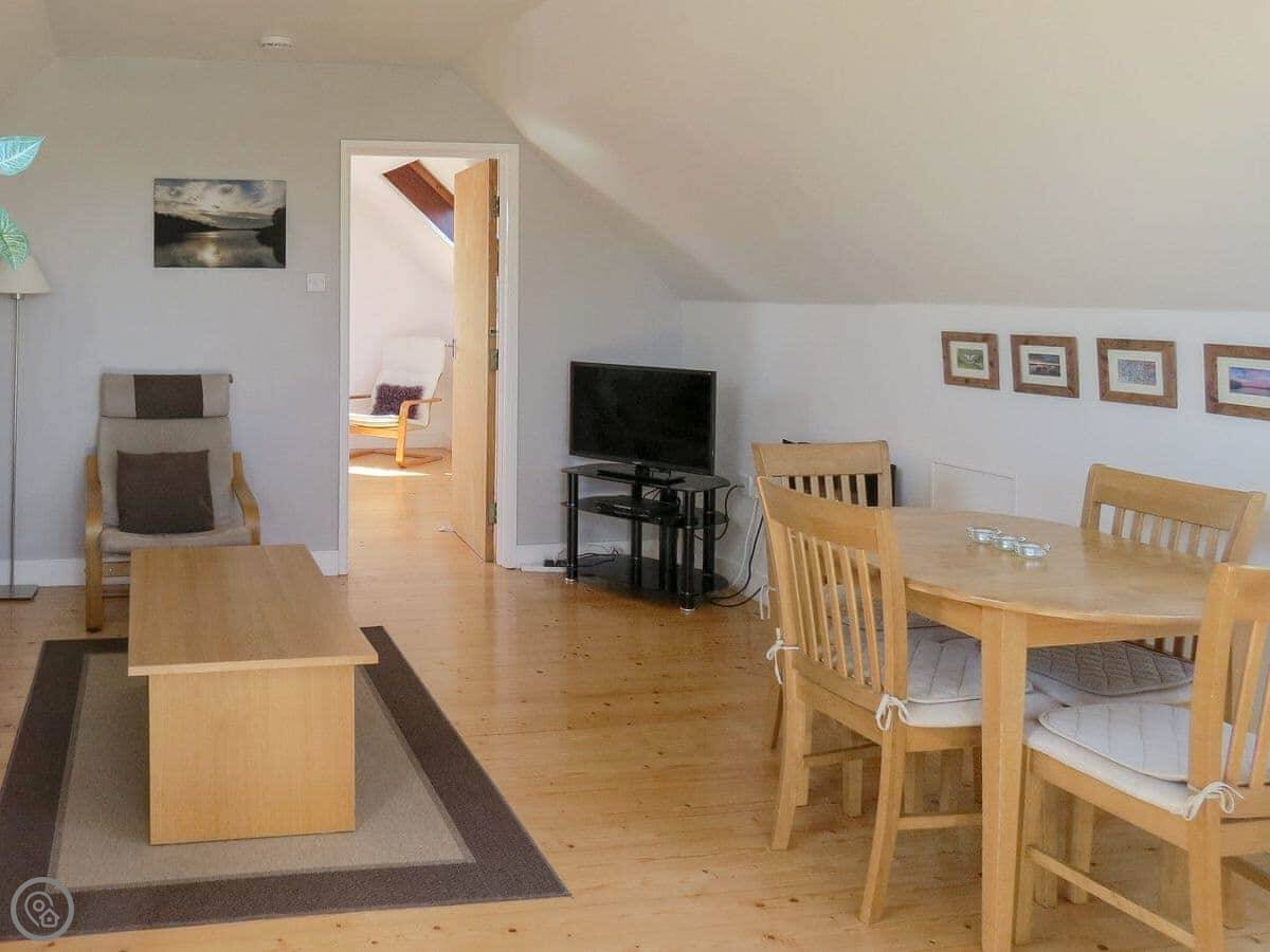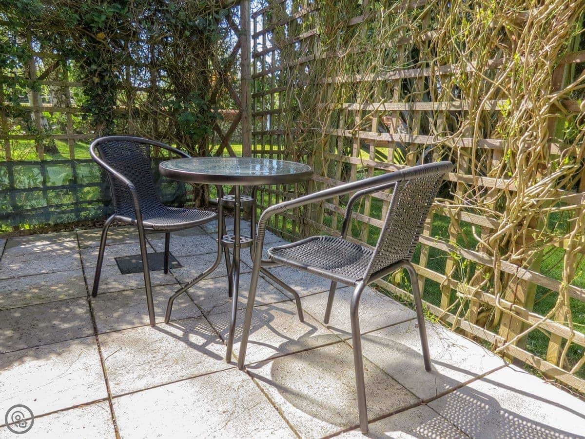 The living area is all one room, with Velux windows in the roof. The bedroom has blackout blinds, which is good if you like a lie-in. There's a small enclosed patio out the back with a table and chairs.