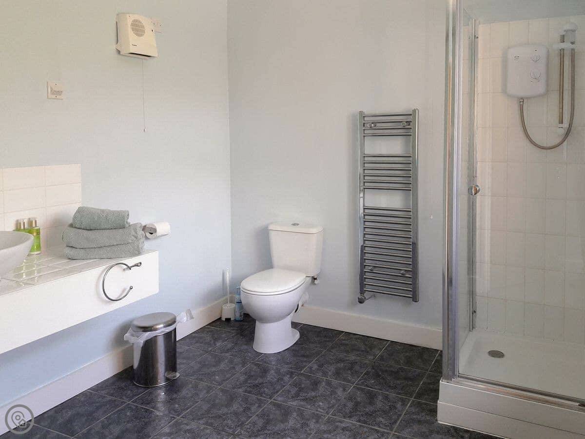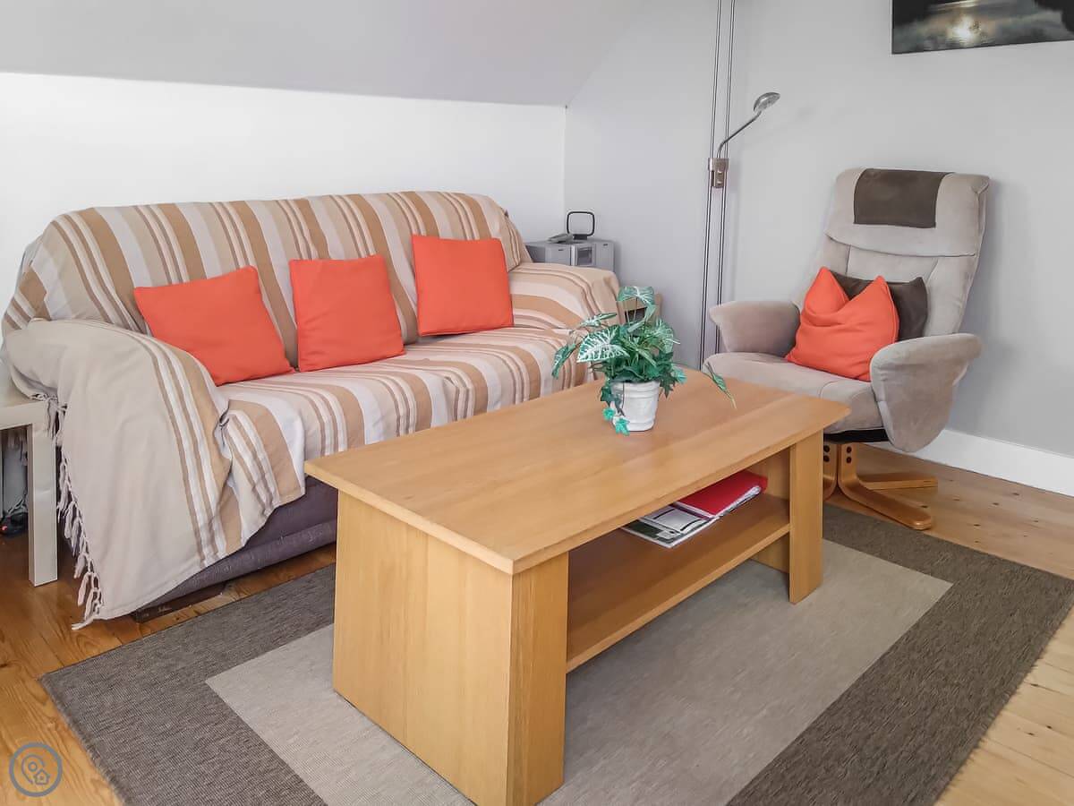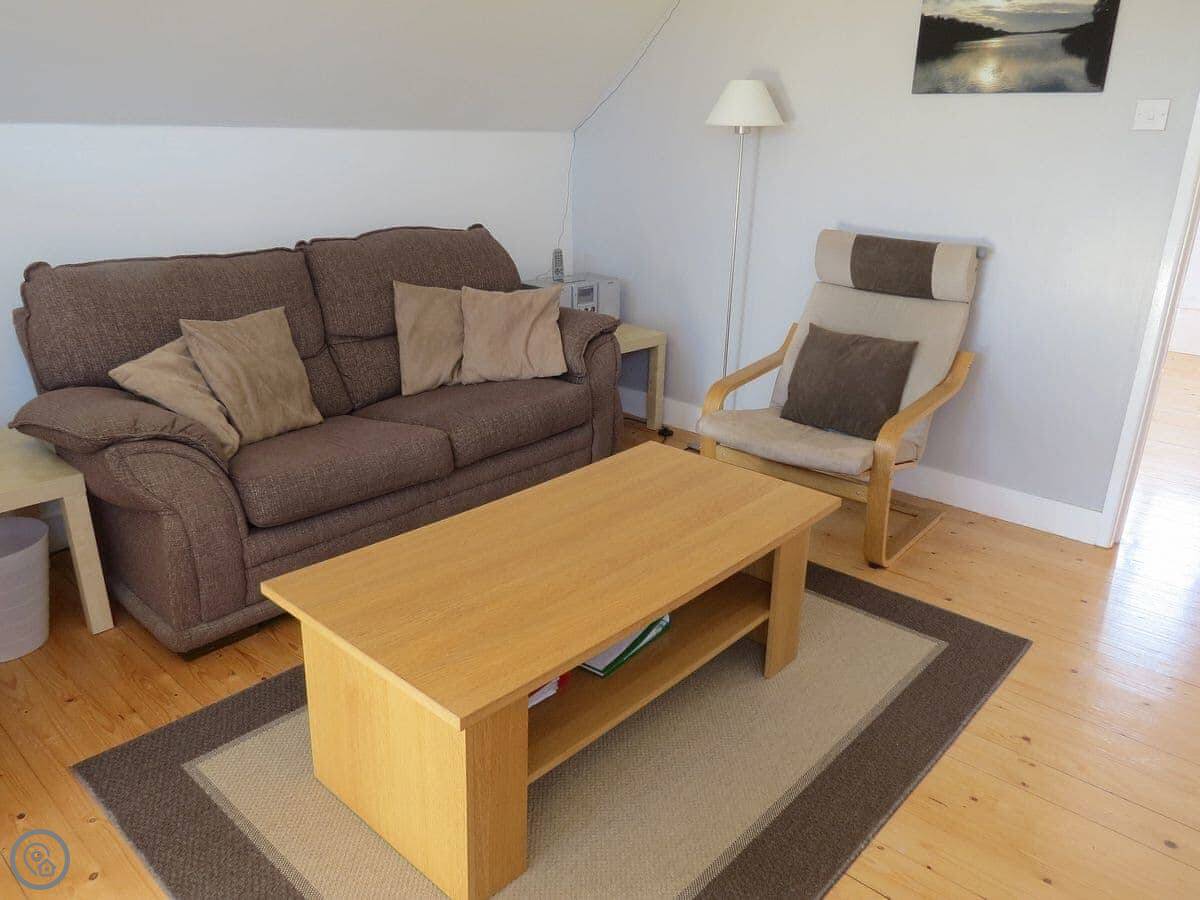 It's for two people. One bedroom, one shower room. It's got a 3 Star rating, so it's clean, warm, and everything works, but it's not a fancy hotel. The stairs go straight up into the living space. They're normal house stairs.