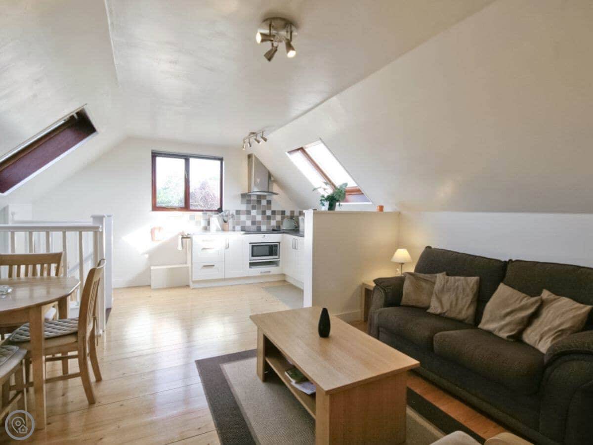 Elm Loft is what it says on the tin. It's a loft conversion above our garage, down a quiet lane in Upton. It's separate from our house, which is about a hundred yards away. You get the place to yourselves.