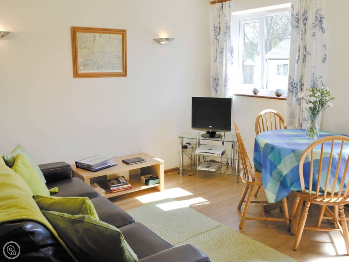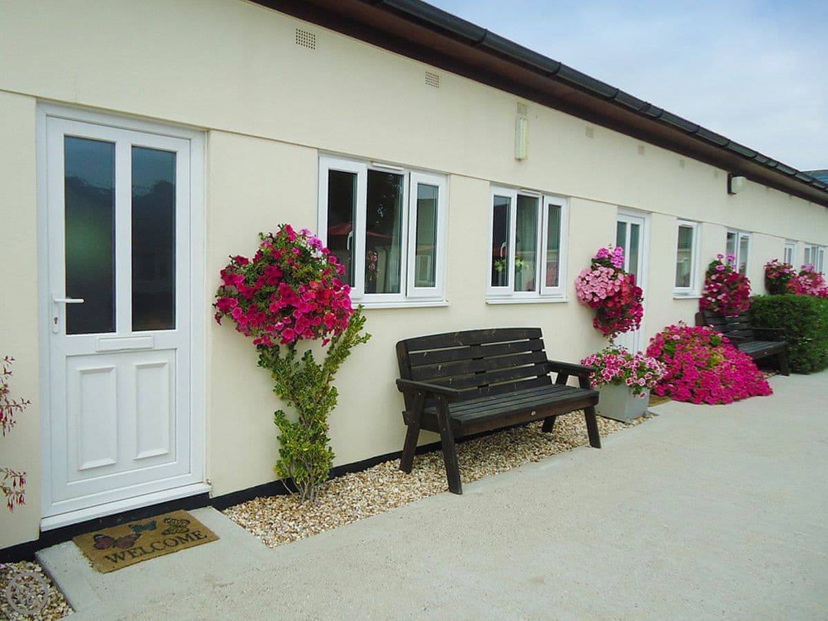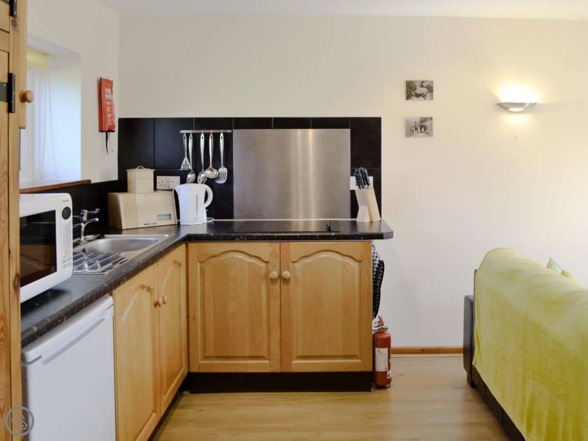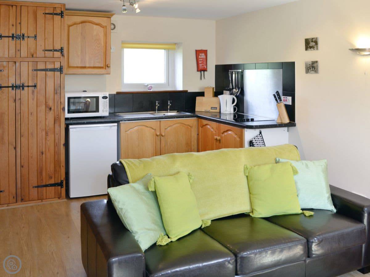The place is open plan. You've got a kitchen, dining and sitting area together. There's a washing machine, wifi, and bedding and towels are provided. Outside is a patio with your own garden space. You can bring up to two dogs.