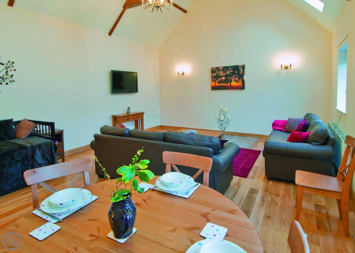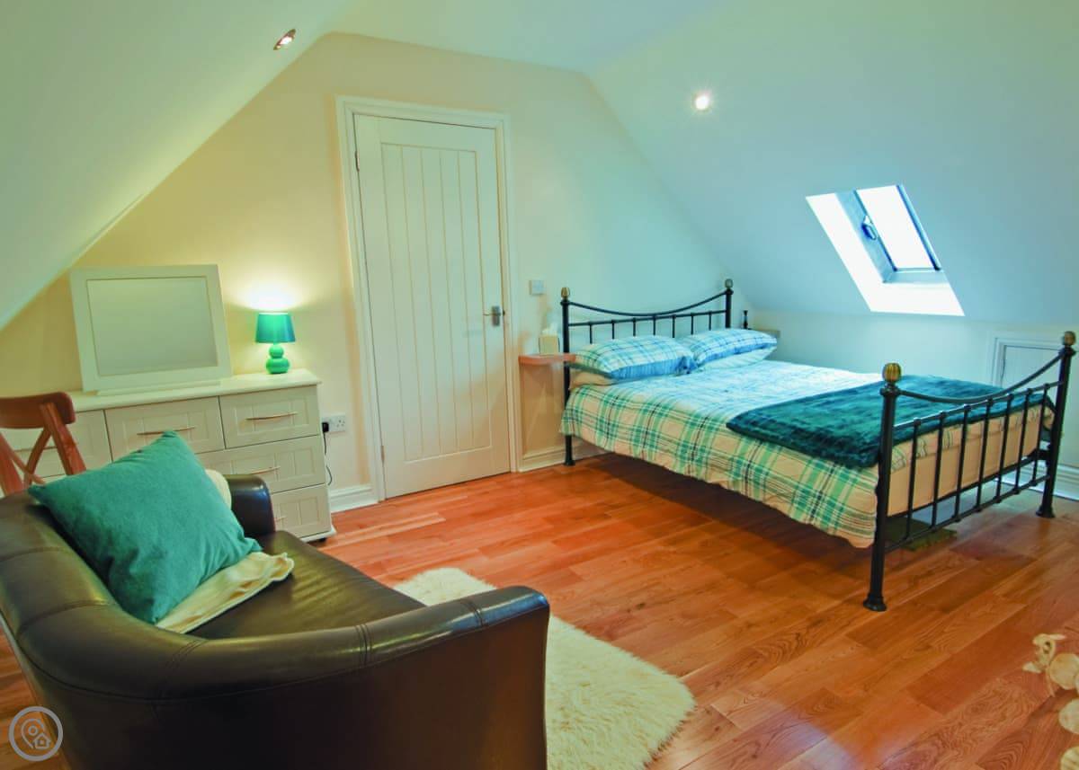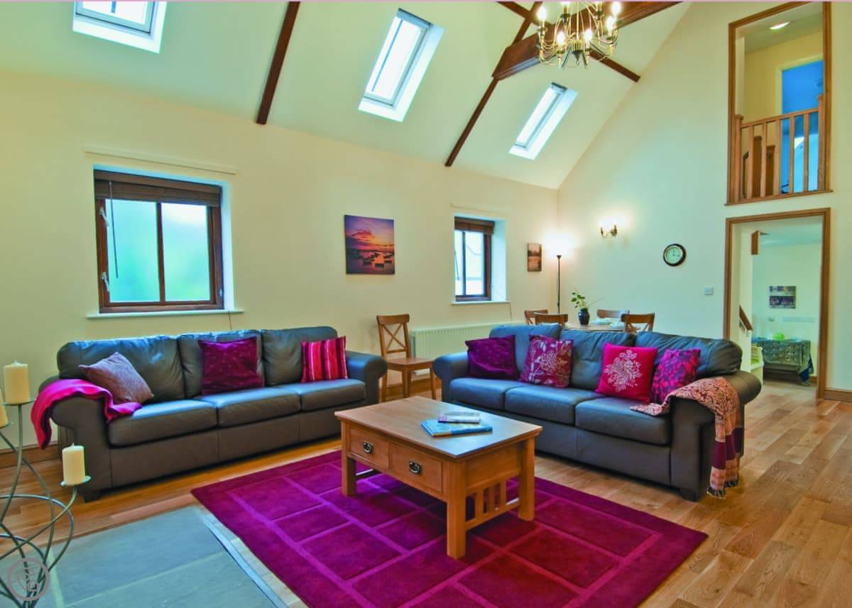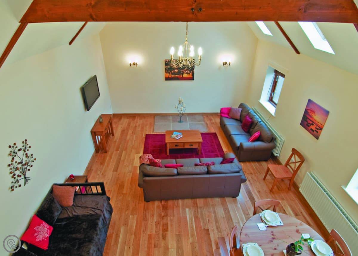 It sleeps four. Two bedrooms, both doubles, and each has its own bathroom. It's got a 4 Star rating. It's been renovated well. The main living room has a high ceiling with old beams and a sort of balcony up above it.