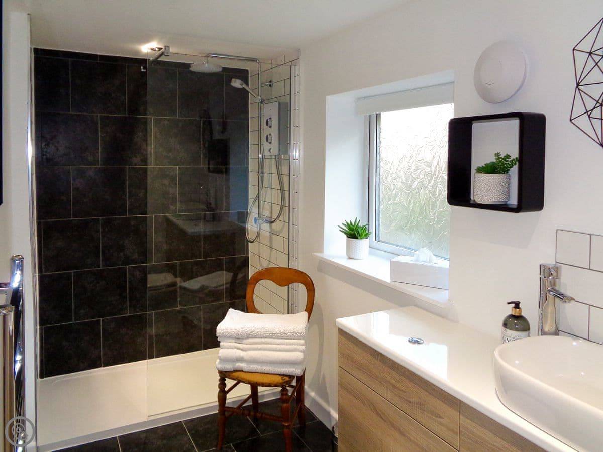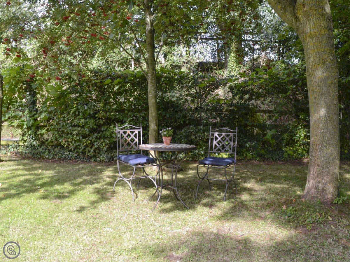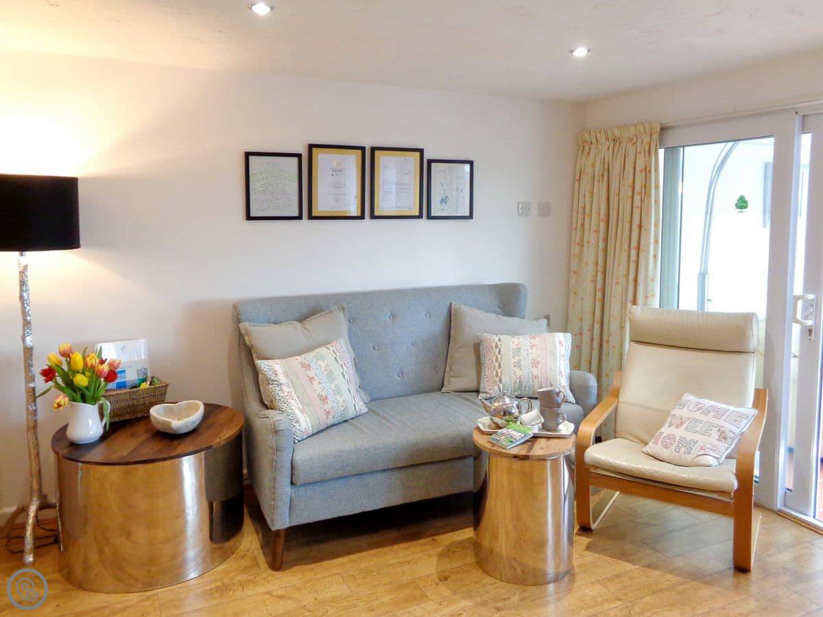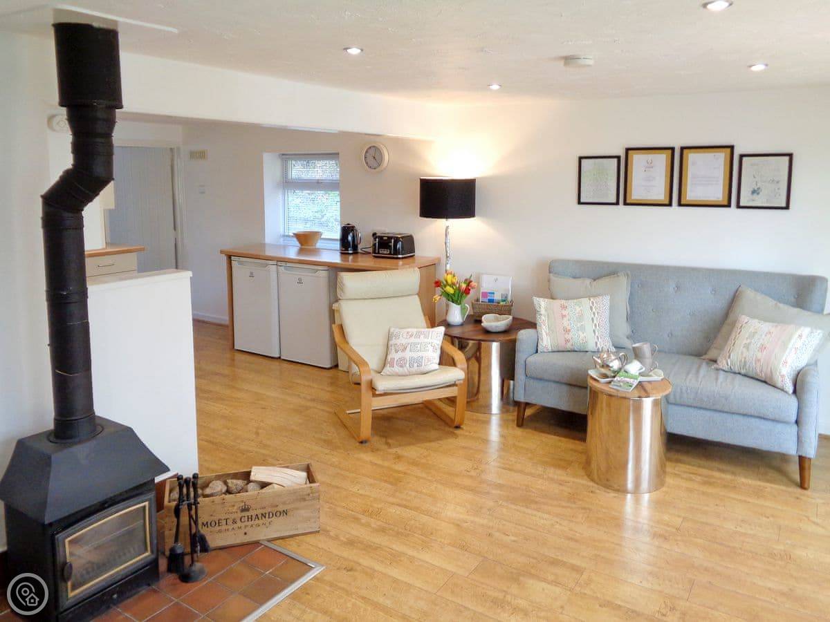 It's for two people. One bedroom, but two bathrooms, which is handy. It's got a 5 Star rating. That means it's well-finished and comfortable. There's a woodburning stove for cooler evenings. The garden is private, but it's within a bigger shared garden that's enclosed.