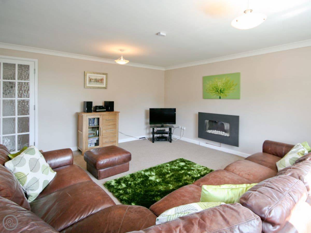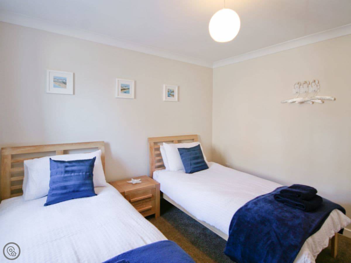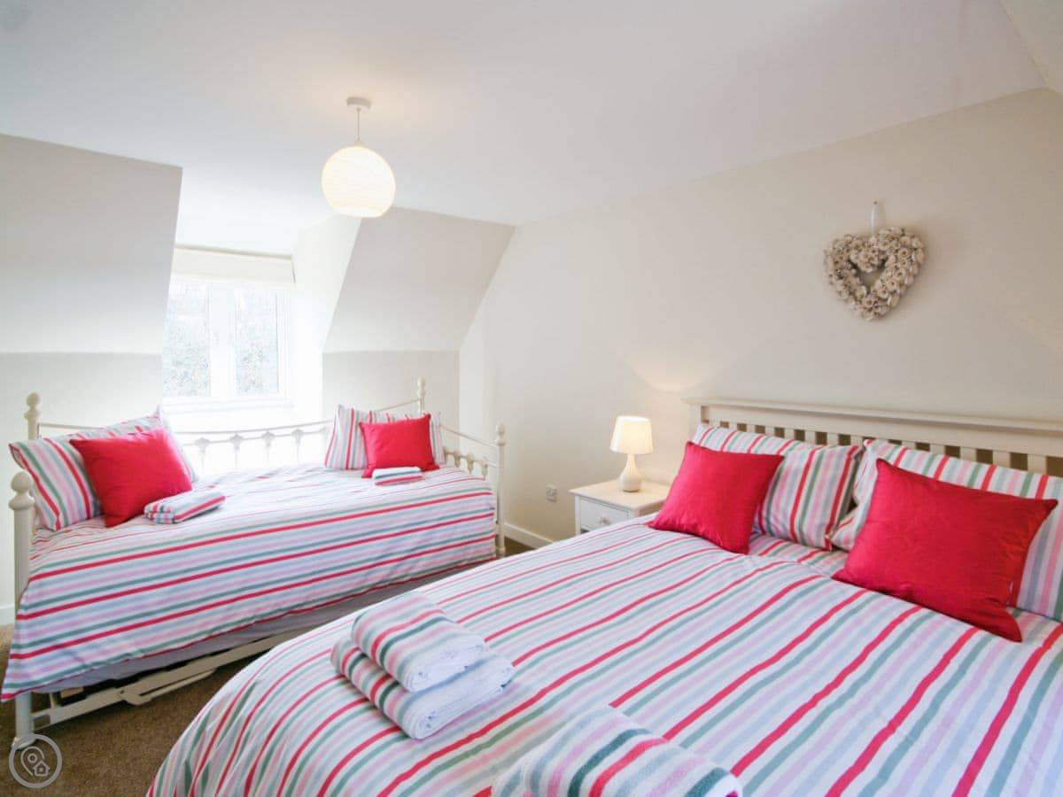 It sleeps eight, but there are only three bedrooms. Two are pretty big with double beds, and the third has bunk beds, so it's set up for families. Two bathrooms, one on each floor. It's got a 4 Star rating. It's comfortable and well-equipped.