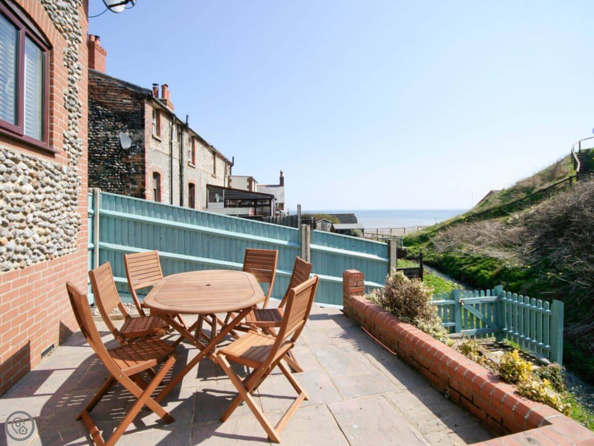 This is Beach Retreat, in Mundesley. It's a detached brick and flint house. The unusual thing is it's upside down. The living area is upstairs to get the view. It's fifty yards from the beach, and there's a gate at the bottom of the garden that gets you straight onto it.