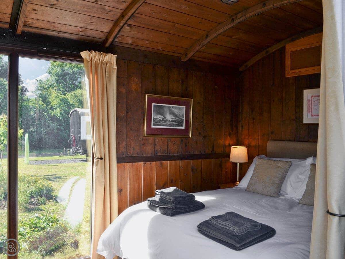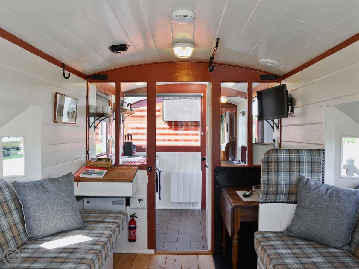 Railway Carriage One is a compact but airy carriage with a living room and kitchen area and sleeps four in comfort. There is a double bedroom and a second sleeping area with two short bunk beds suitable for children.