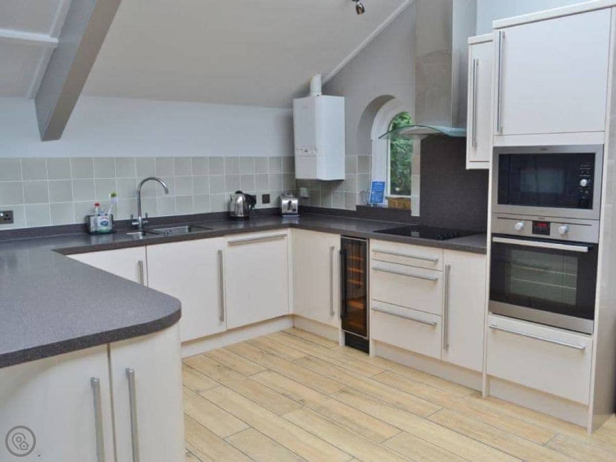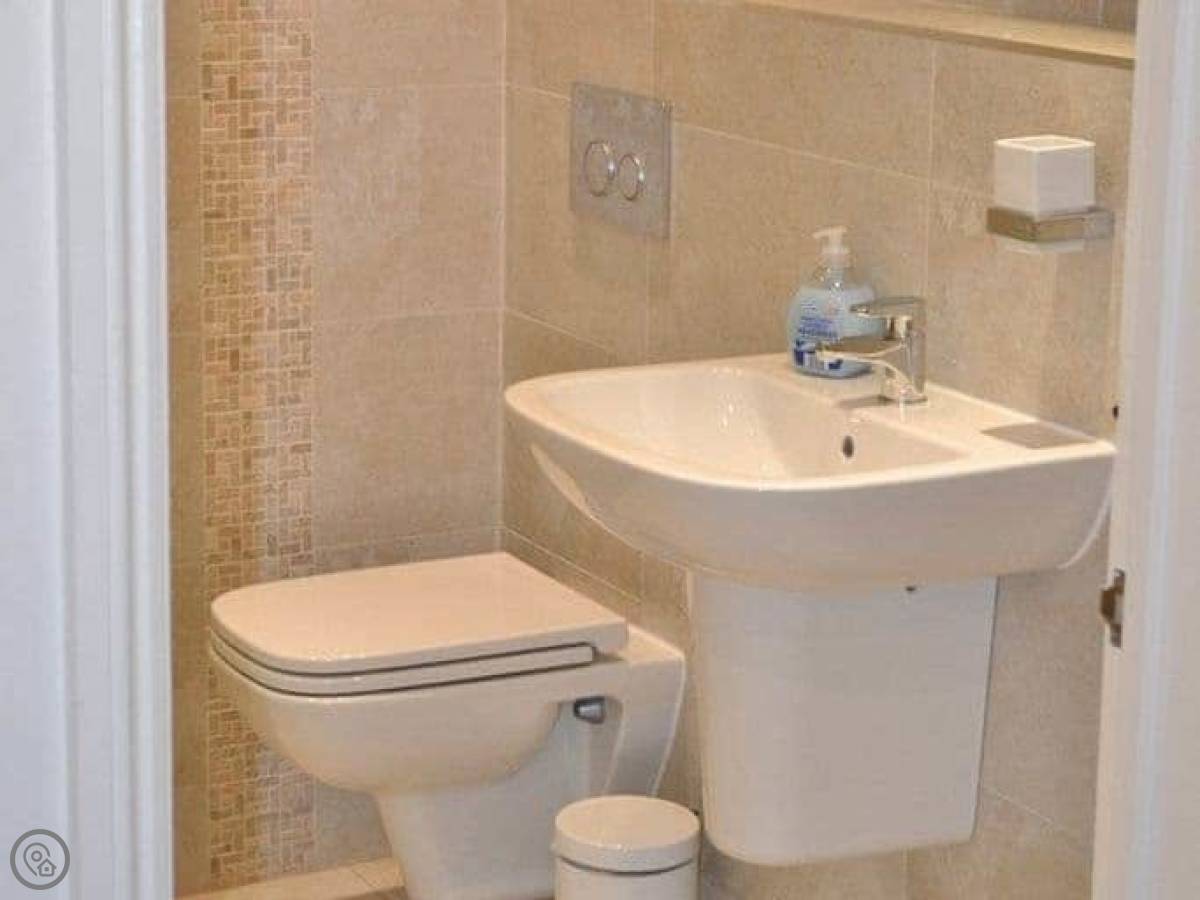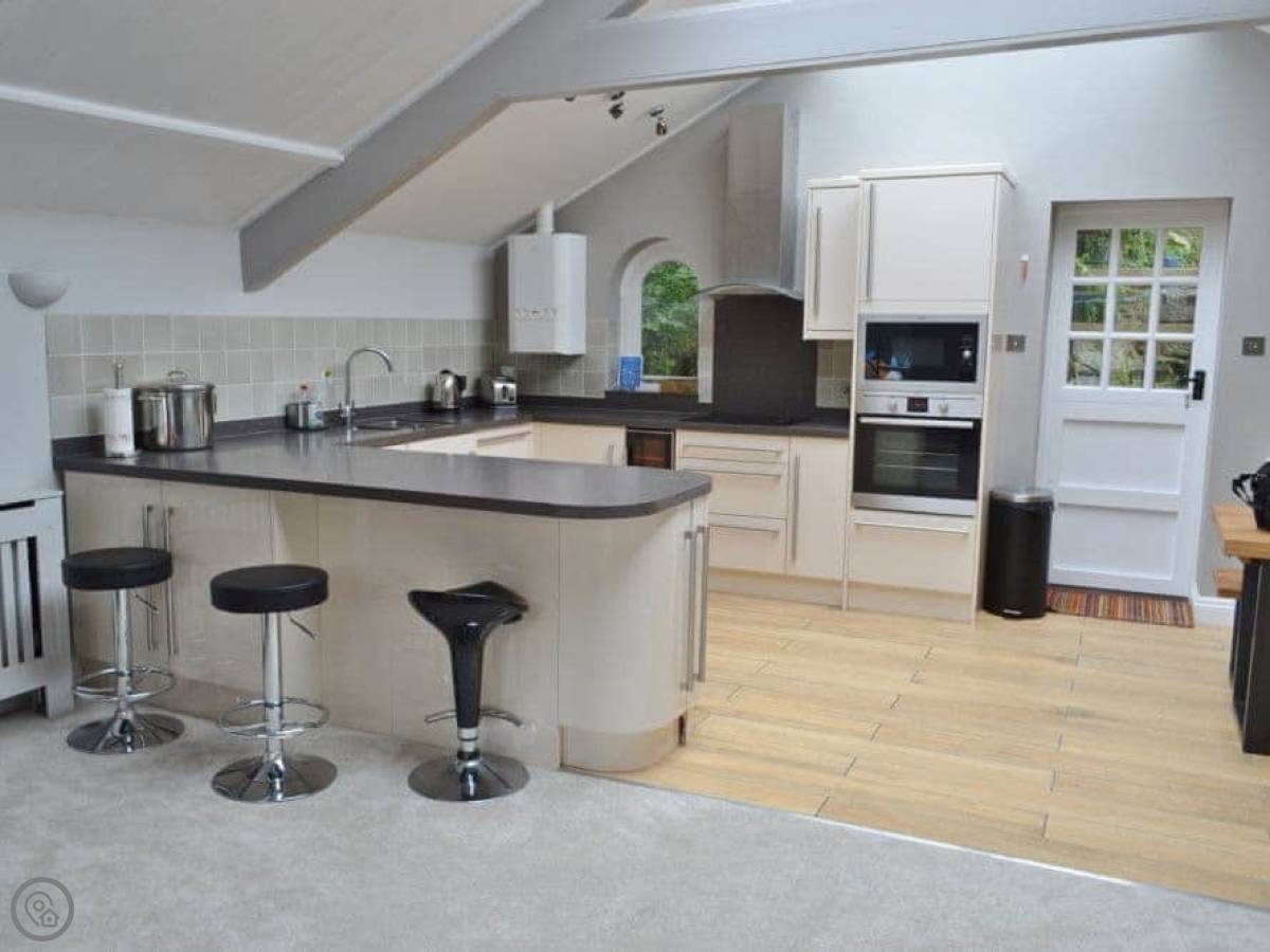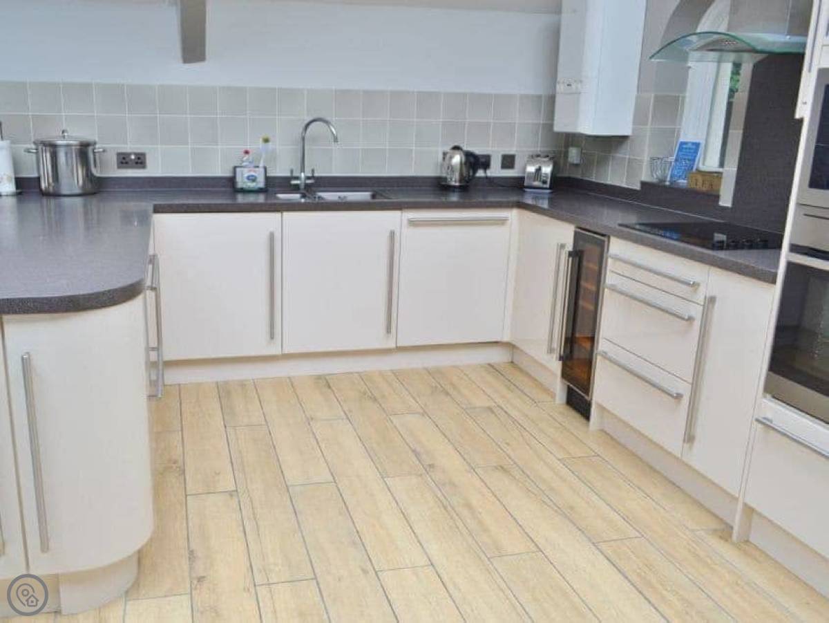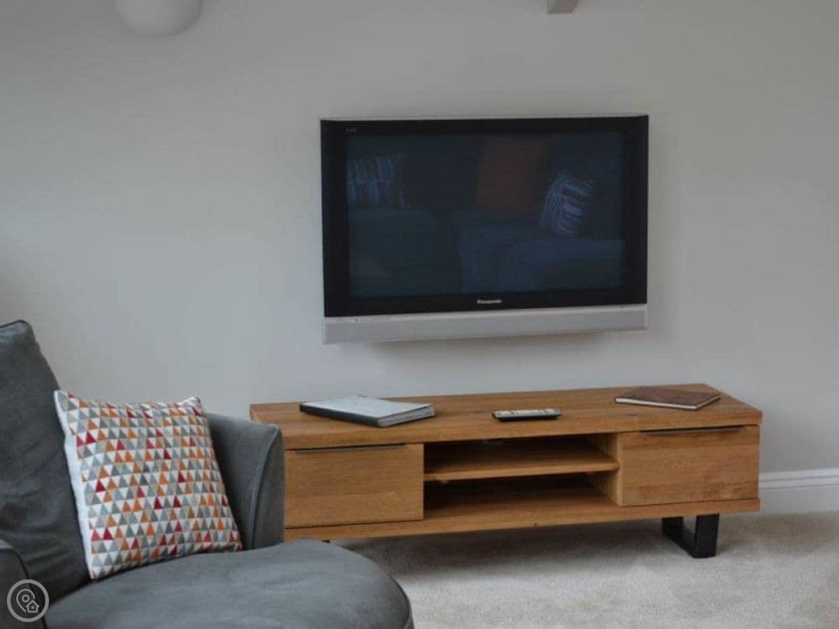 Inside, it's got the things you'd need: a washing machine, dishwasher, WiFi, TV. Bedding and towels are included. There's a cot if you've got a baby.